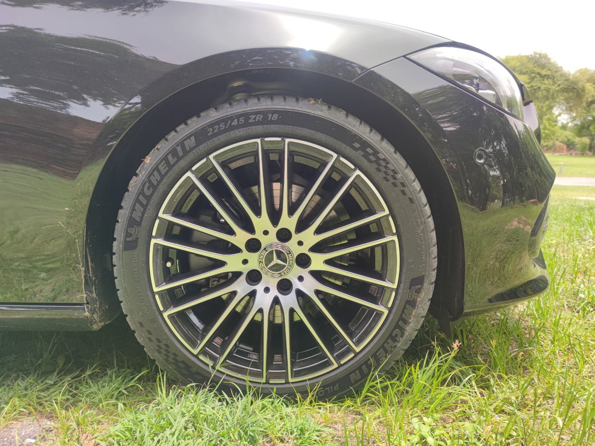 ล้ออัลลอยดีไซน์สปอร์ตจาก AMG แบบ multi- spoke ขนาด 19 นิ้ว มีลักษณะเป็นซี่ๆ แต่ทางเราชอบแบบเก่าที่เป็น 5 ก้านมากกว่าเพราะดูทำความสะอาดง่ายกว่าและดูสปอร์ตมากกว่านี้ โดยยางหน้าเป็นยาง Radial แบบมีชั้นโฟมตัดเสียงช่วยลดเสียงรบกวนที่จะเข้าไปในตัวรถได้เป็นอย่างดี ซึ่งมีขนาดยางหน้า 225/45 R 19 เบรกจะเป็นคาลิปเปอร์สีเทาที่มีโลโก้ Mercedes -Benz ติดมาด้วย จานเบรกคู่หน้าขนาดใหญ่พร้อมรู้ระบายความร้อน