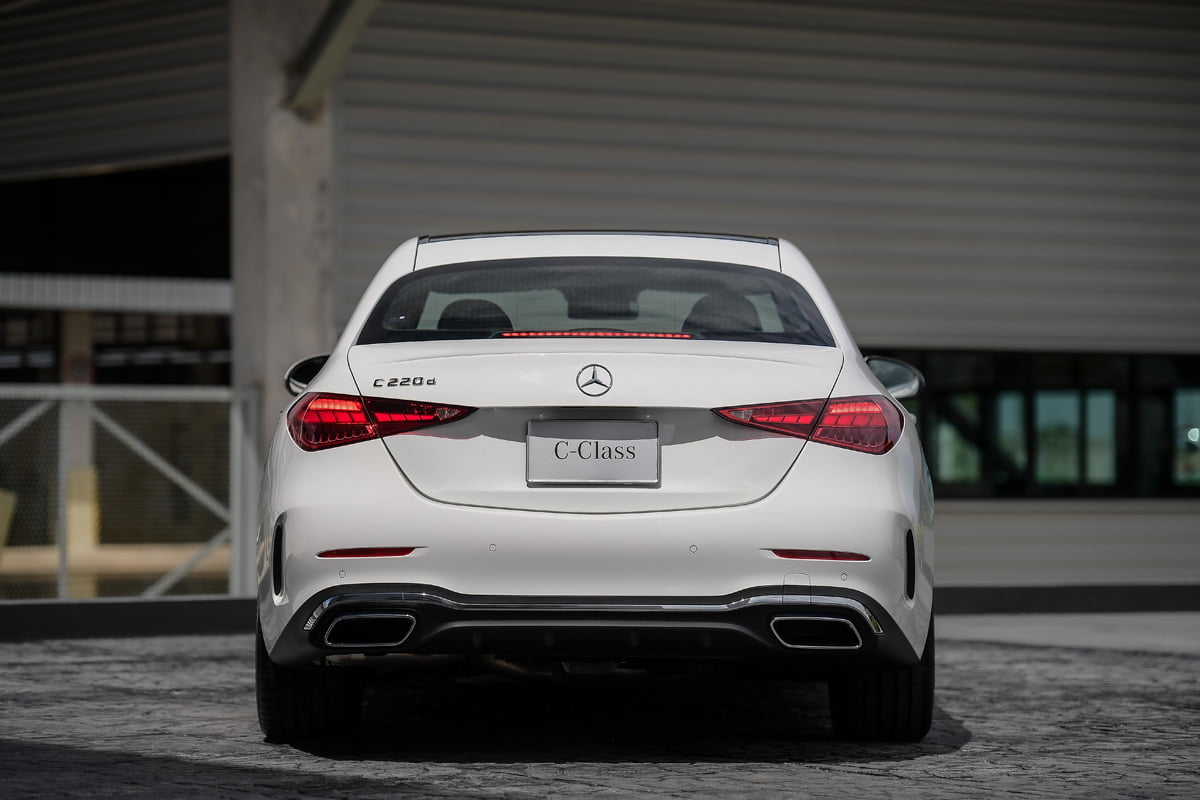 ถัดมาที่ด้านหลังกันบ้างซึ่งก็จะมีความคล้าย S-Class อยู่บ้าง โดยด้านหลังมีไฟเบรกดวงที่ 3 ซึ่งซ้อนอยู่ในกระจกด้านหลังจะเป็นลักษณะแนวยาวทำให้ต่างจากรุ่น W205 มีโลโก้รุ่นเป็นโครเมียม C220d และโลโก้ Mercedes -Benz แต่ไม่มีเครื่องหมายที่บ่งบอกว่าเป็น AMG ในส่วนไฟท้ายที่ดีไซน์เหมือน S-Class เป็นไฟท้ายแบบ Full LED โดยจะแยกเป็น 2 ส่วน เหมือน W205 ส่วนหนึ่งอยู่ที่ตัวรถอีกส่วนอยู่ที่ฝากระโปรงรถ ซึ่งจะทำงานต่อเนื่องกัน จะมีไฟถอยหลังให้อีกฝั่งหนึ่งและและไฟตัดหมอกให้อีกฝั่งหนึ่ง ในรุ่นนี้ไม่มีกล้องหน้าแต่มีกล้องหลังมาให้แทน ด้านท้ายก็เป็นชุดแต่ง AMG Body styling เหมือนกันซึ่งที่มาพร้อมกันชนและ Diffuser อีกทั้งยังมีท่อคู่ซ้ายขวาทำให้ดูเท่และมีความเป็นสปอร์ตโดยท่อจะเป็นลักษณะแบนๆก็ดูทันสมัยขึ้น นอกจากนี้ยังมีเส้นโครเมียมที่ลากยาวตามความกว้างของท้ยรถซึ่งจะไปตัดพอดีกับปอกท่อ