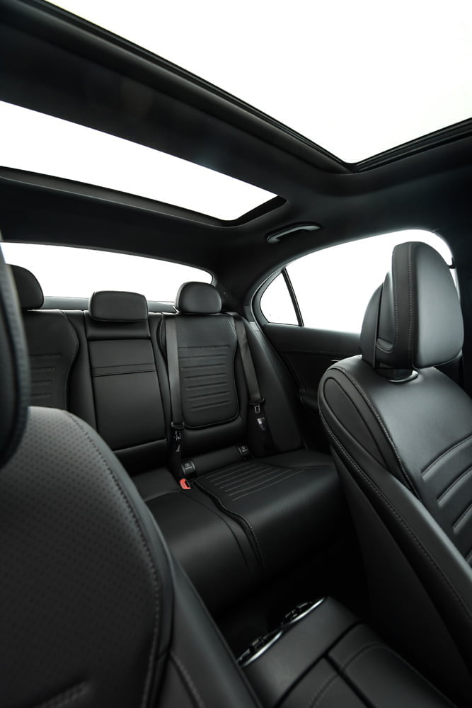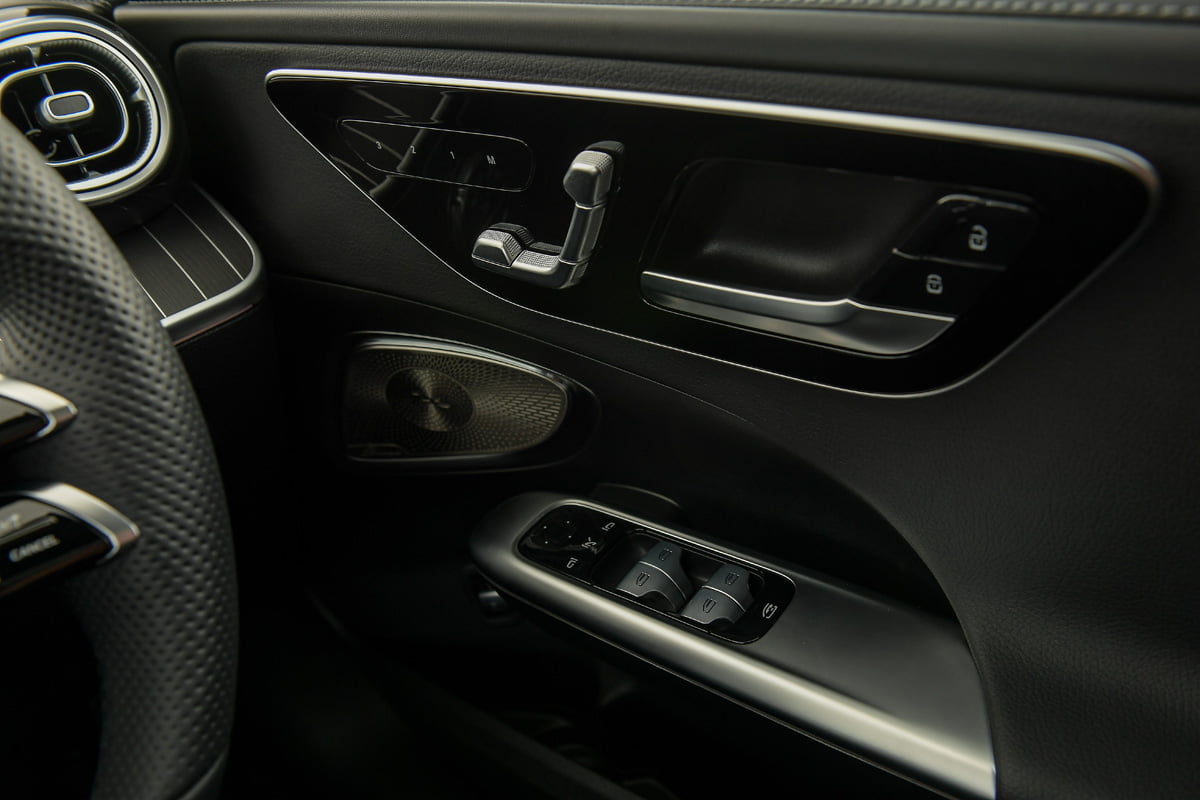 ถัดมาด้านข้างเราจะเห็นว่ารถไม่ได้สูงมากเพราะเน้นความเป็นสปอร์ต ความเป็นครอบครัว ในส่วนของกระจกข้างเป็นสีเดียวกับตัวรถโดยจะมีไฟเลี้ยว LED อยู่ที่ด้านข้าง อีกทั้งสามารถปรับระดับและพับเก็บได้ด้วยระบบไฟฟ้าและรวมไปถึงยังปรับลดแสงสะท้อนอัตโนมัติได้ในฝั่งขวามือ อีกทั้งมีไฟ welcome light ใต้กระกระจกมองข้างเป็นรูปตราสัญลักษณ์เมอร์เซเดส-เบนซ์ ต่อไปเป็นมือจับเปิดประตูซึ่งเป็นโครเมียม รวมไปถึงเส้นสายขอบประตูด้วย ซึ่งในรุ่นนี้จะเน้นโครมเมียมเป็นหลักเพื่อให้ดูพรีเมียมมากขึ้น ถัดมาเราก็จะเห็นการโค้งลงของหลังคามันทำให้ดูเพรียวและสวยงาม ซึ่งเราขอบอกเลยว่าหลังคาที่ให้มาใหญ่พอสมควรเลย ถือว่าดีกว่าตัว BMW 320d เพราะ 320d ไม่มีหลังคาพาโนรามิคมาให้