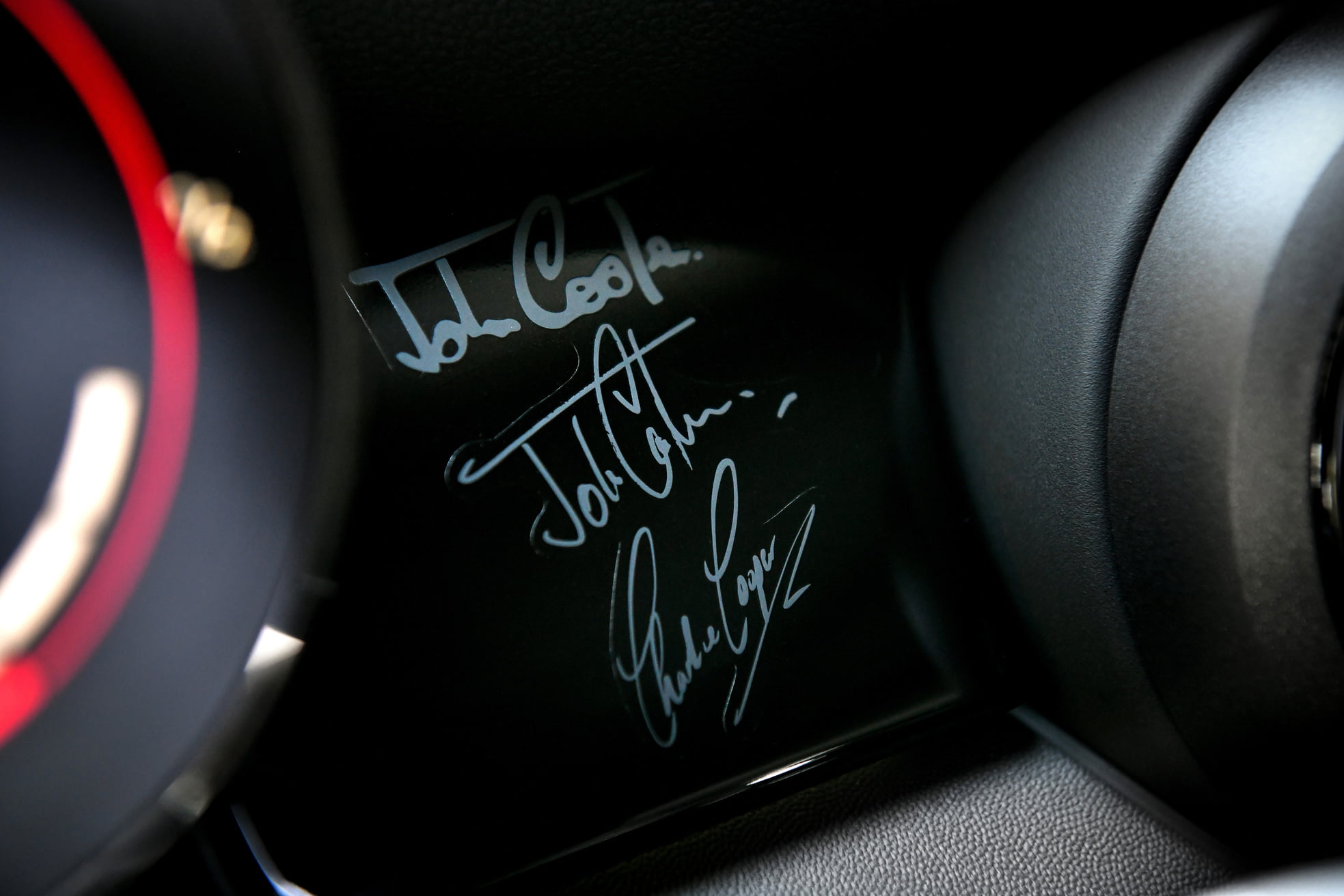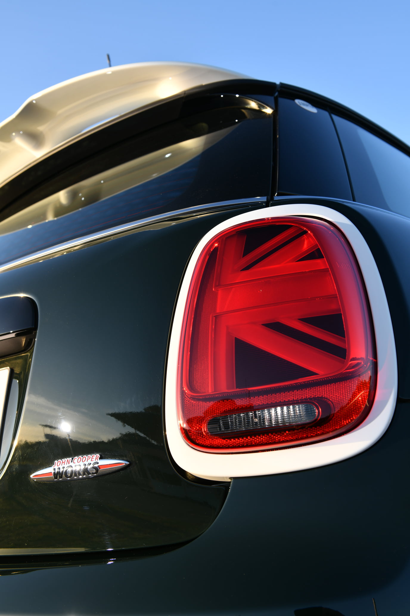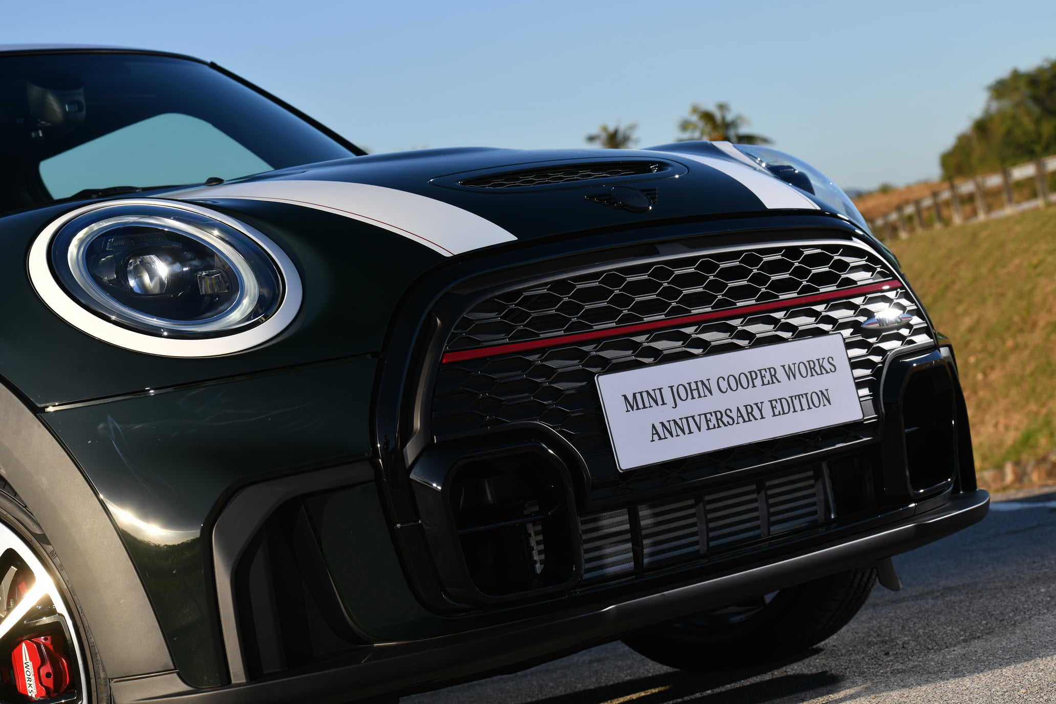 รถยนต์มินิ จอห์น คูเปอร์ เวิร์คส์ Anniversary Edition ใหม่ มาในสีตัวถังสีเขียว Rebel Green ตัดกับสีขาวของหลังคา มือจับประตู กระจกมองข้าง และกรอบไฟหน้า รวมถึงแถบสีขาวบริเวณฝากระโปรงหน้าพร้อมเส้นสายสีแดง อุปกรณ์อื่น ๆ บนตัวรถยังประกอบไปด้วย ล้อลาย John Cooper Works Circuit Spoke แบบสลับสี ขนาด 18 นิ้ว พร้อมยางรันแฟลต และสัญลักษณ์ “COOPER” แบบคลาสสิก ที่ติดอยู่บริเวณขอบประตู เสา C และแกนกลางพวงมาลัยหนังแบบสปอร์ต การตกแต่งภายนอกโดดเด่นด้วยหมายเลข 74 บริเวณฝากระโปรงและบานประตู