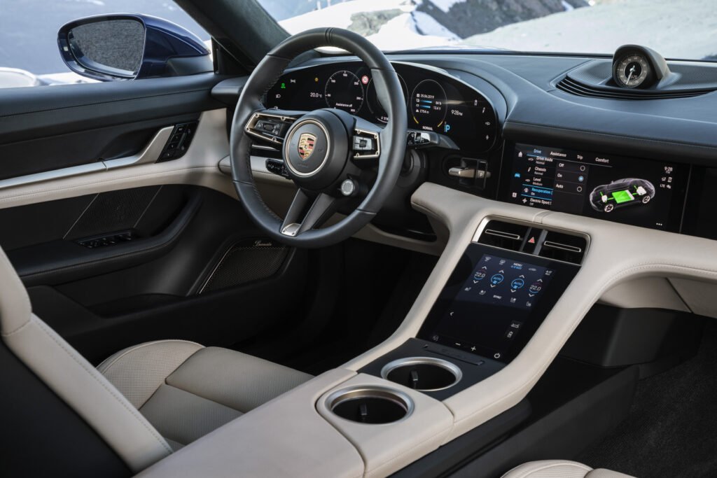 ห้องโดยสารของ Taycan มาในสไตล์เรียบหรูสะอาดตาและเป็นเทคโนโลยีดิจิทัลเต็มรูปแบบ ติดตั้งหน้าจอแสดงผลความละเอียดสูงขนาด 16.9 นิ้ว วางตัวตามแนวโค้งบริเวณส่วนบนของแดชบอร์ด ถัดมาด้านล่างคือหน้าจอระบบสาระบันเทิงขนาดใหญ่ 10.9 นิ้ว มีหน้าจอสำหรับผู้โดยสารตอนหน้าเป็นอุปกรณ์เสริมสำหรับเลือกติดตั้งเพิ่มเติมซึ่งจะวางตัวต่อเนื่องเป็นอันหนึ่งอันเดียวกันด้วยกลายเป็นแผ่นกระจกแนวยาวสไตล์ black-panel โดดเด่นด้วยการดีไซน์พื้นห้องโดยสารแบบ “Foot garages” คำนึงถึงตำแหน่งการวางชุดแบตเตอรี่บริเวณพื้นที่ วางเท้าของผู้โดยสารตอนหลังเพื่อให้มั่นใจในความสะดวกสบายขณะเดินทางและเบาะนั่งจะวางตัวในระดับต่ำตาม ลักษณะเฉพาะตัวของรถสปอร์ตพันธุ์แท้