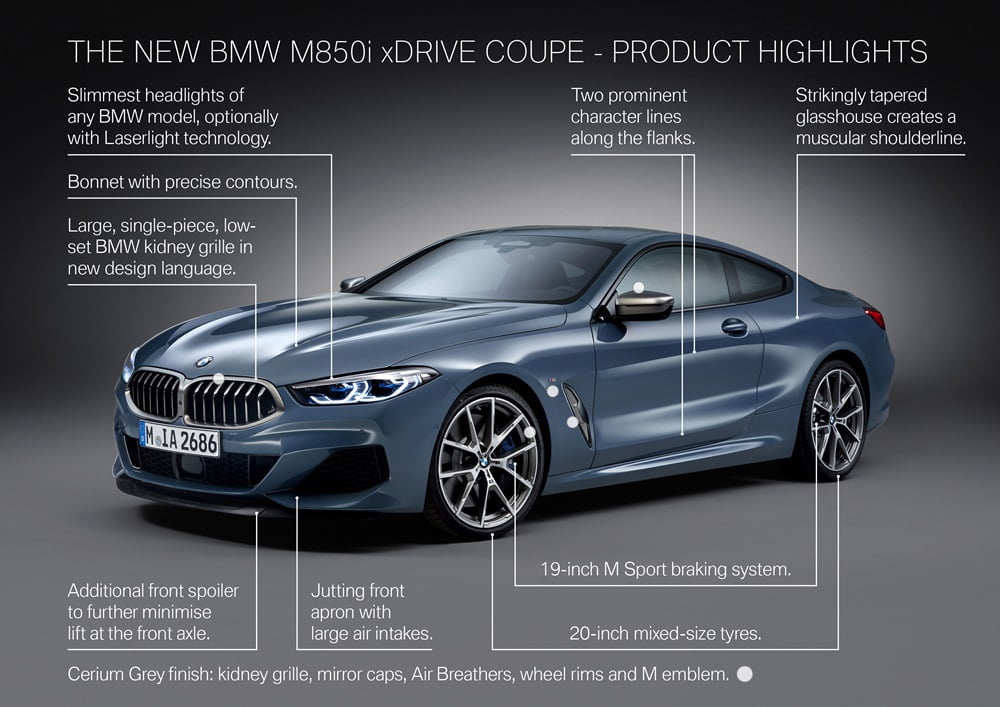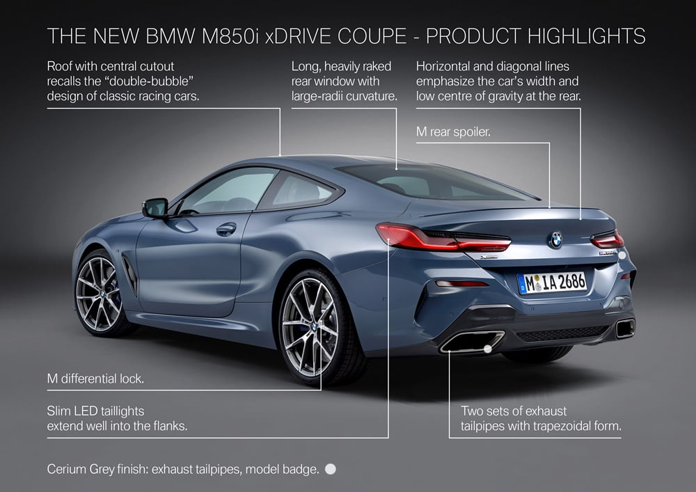 โมเดล M850i ได้อัพเกรดเป็นล้ออัลลอย M ขนาด 20 นิ้ว รัดด้วยยางสมรรถนะสูง ด้านหน้าขนาด 245/35 R20 ด้านหลัง 275/30 R20, ระบบเบรก M Sport ความกว้างจาน 395 มม., ชิ้นส่วนตกแต่งภายนอกสี Cerium Grey, ภายในตกแต่งด้วยชิ้นส่วนอะลูมิเนียมเพิ่มวามสปอร์ต