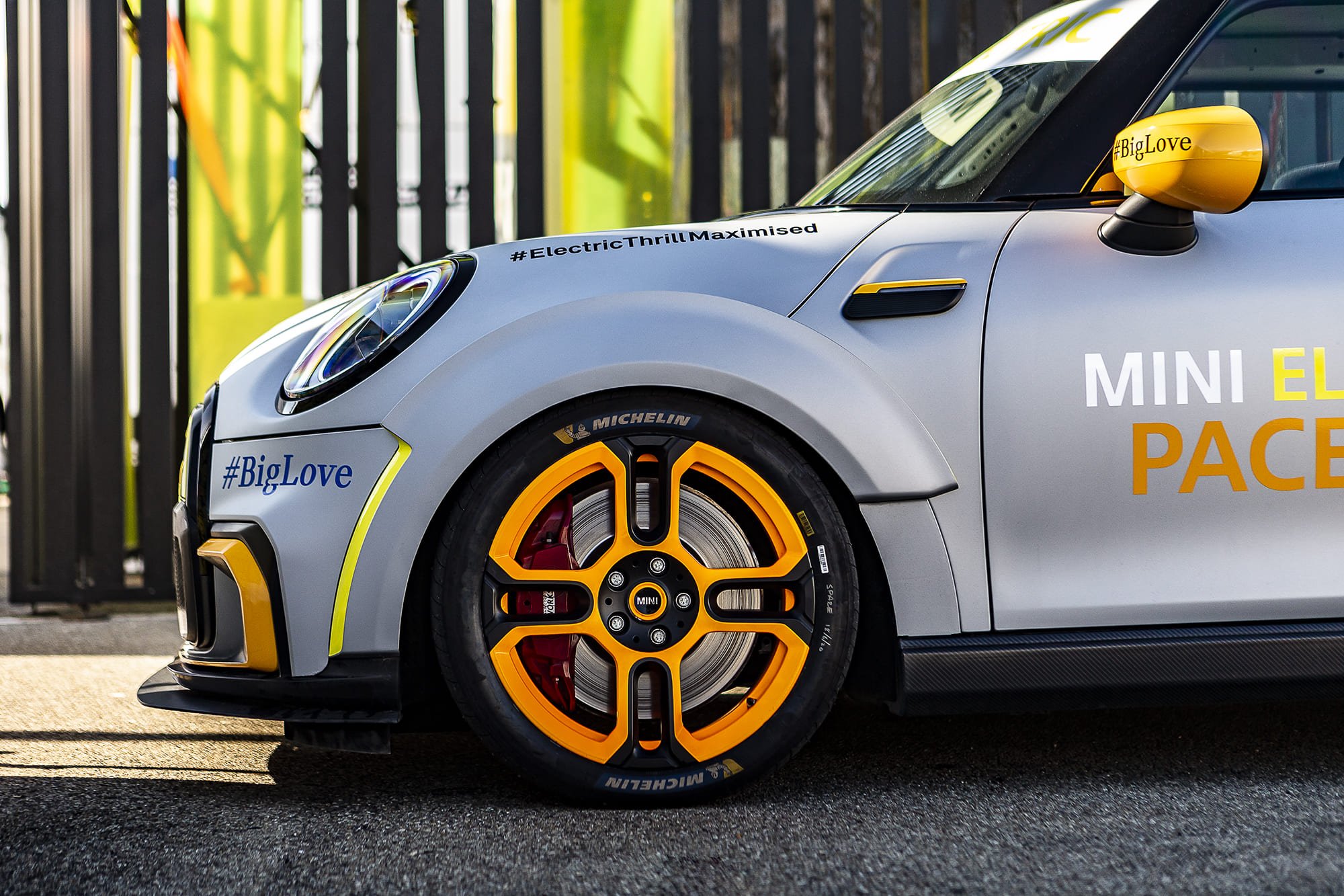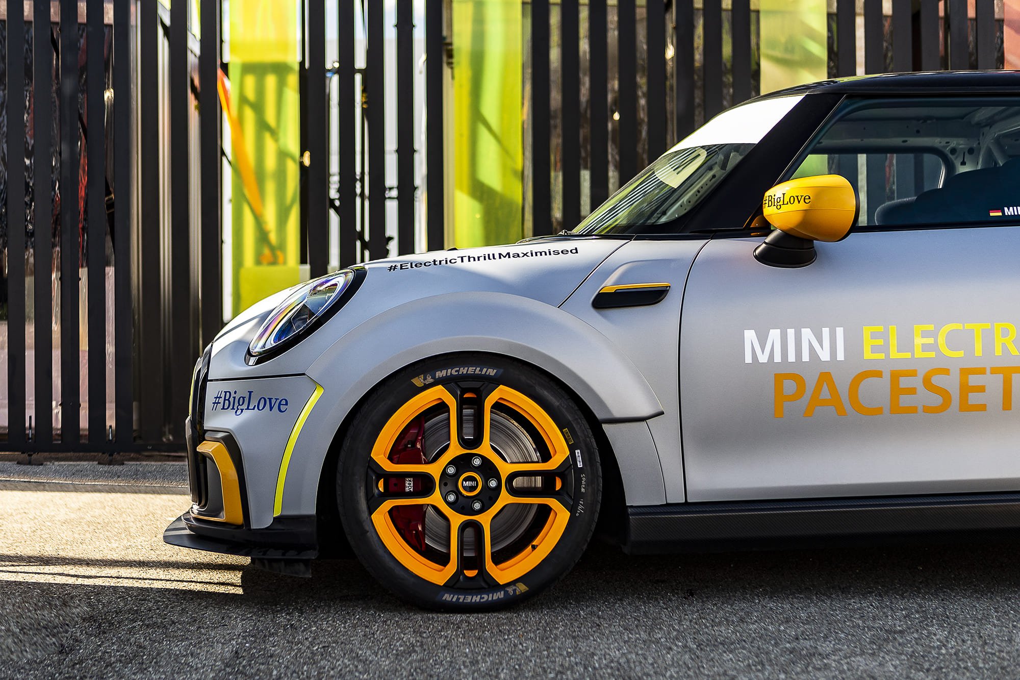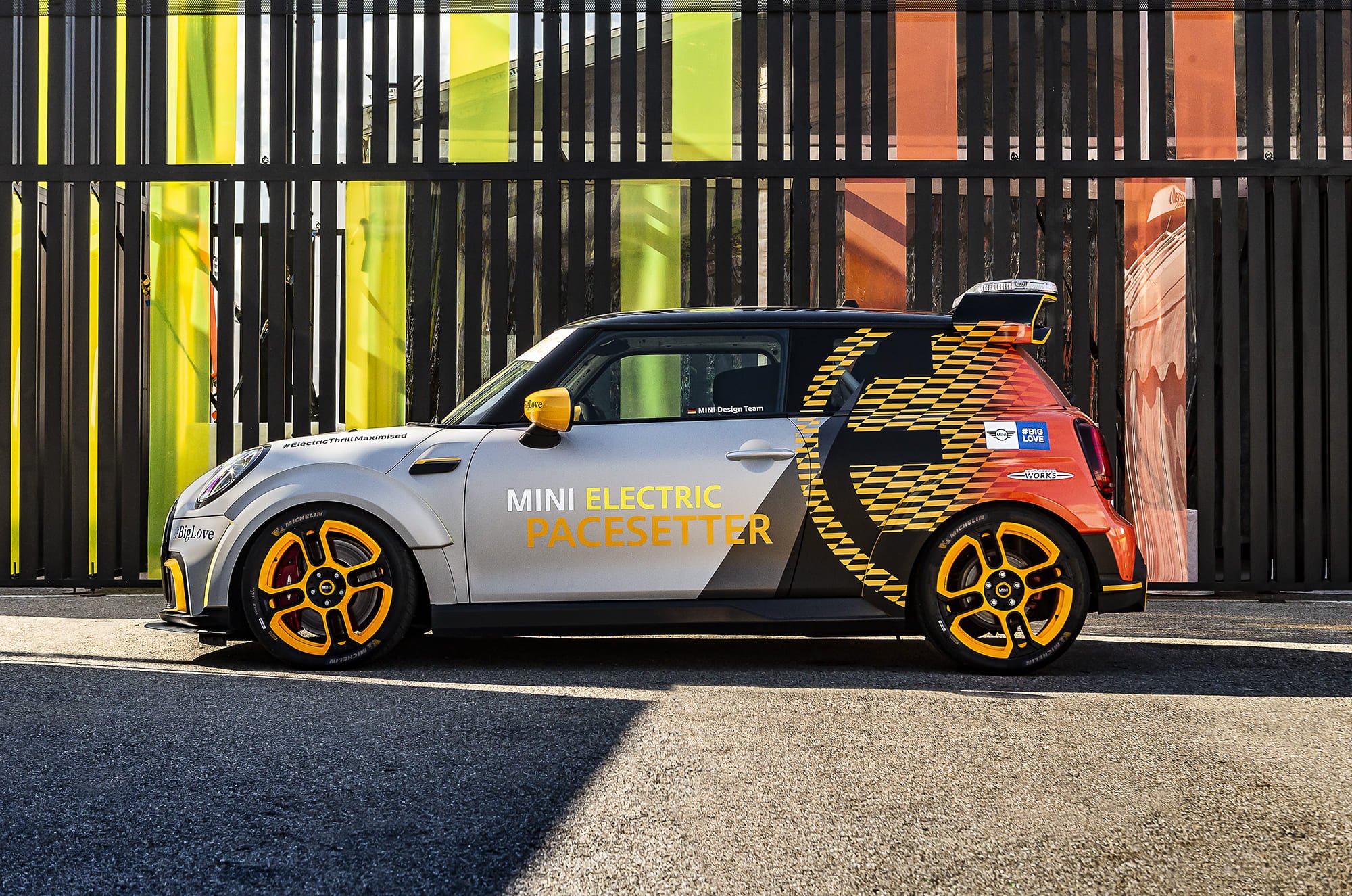 ด้านข้างของ The MINI Electric Pacesetter inspired by JCW มีชุดแอโรไดนามิกส์ที่ดุดัน การสอดประสานกันของลวดลายเรขาคณิตด้านข้างรถอันโดดเด่น และสเกิร์ตด้านข้างทรงสปอร์ต เสริมให้เกิดภาพลักษณ์ของการพุ่งทะยานไปไปข้างหน้า ประกอบกับล้อที่มีเส้นผ่านศูนย์กลางที่เพิ่มขึ้น เกือบจะเต็มซุ้มล้อ องค์ประกอบเหล่านี้สะท้อนให้เห็นภาพประวัติศาสตร์อันเกรียงไกรในสนามแข่งของมินิ ลวดลายสีเหลืองที่เด่นชัดและพื้นผิวของชุดแต่งแอโรไดนามิกส์ เช่น ลวดลายด้านข้างรถ สเกิร์ต และสปอยเลอร์หลัง ได้รับการออกแบบมาให้รีดลม รับกับการเป็นช่องทางผ่านของอากาศ นอกจากนี้ยังเพิ่มความสวยงามให้กับแผ่นเบนอากาศและขอบแอโรไดนามิกส์ เพิ่มความเร้าใจด้วยล้อฟอร์จขนาด 18 นิ้วในโทนสีดำสลับสีส้มนีออนสะดุดตาในสไตล์แบบจอห์น คูเปอร์ เวิร์คส์