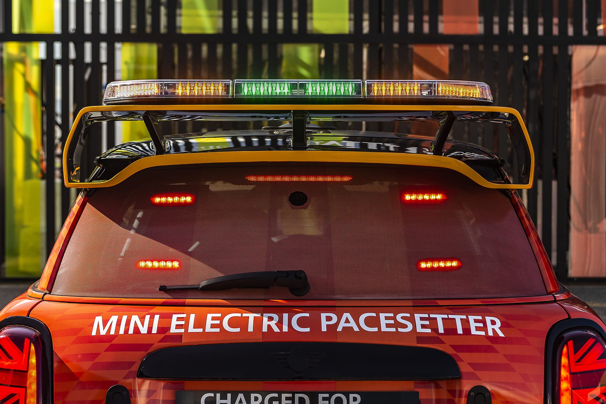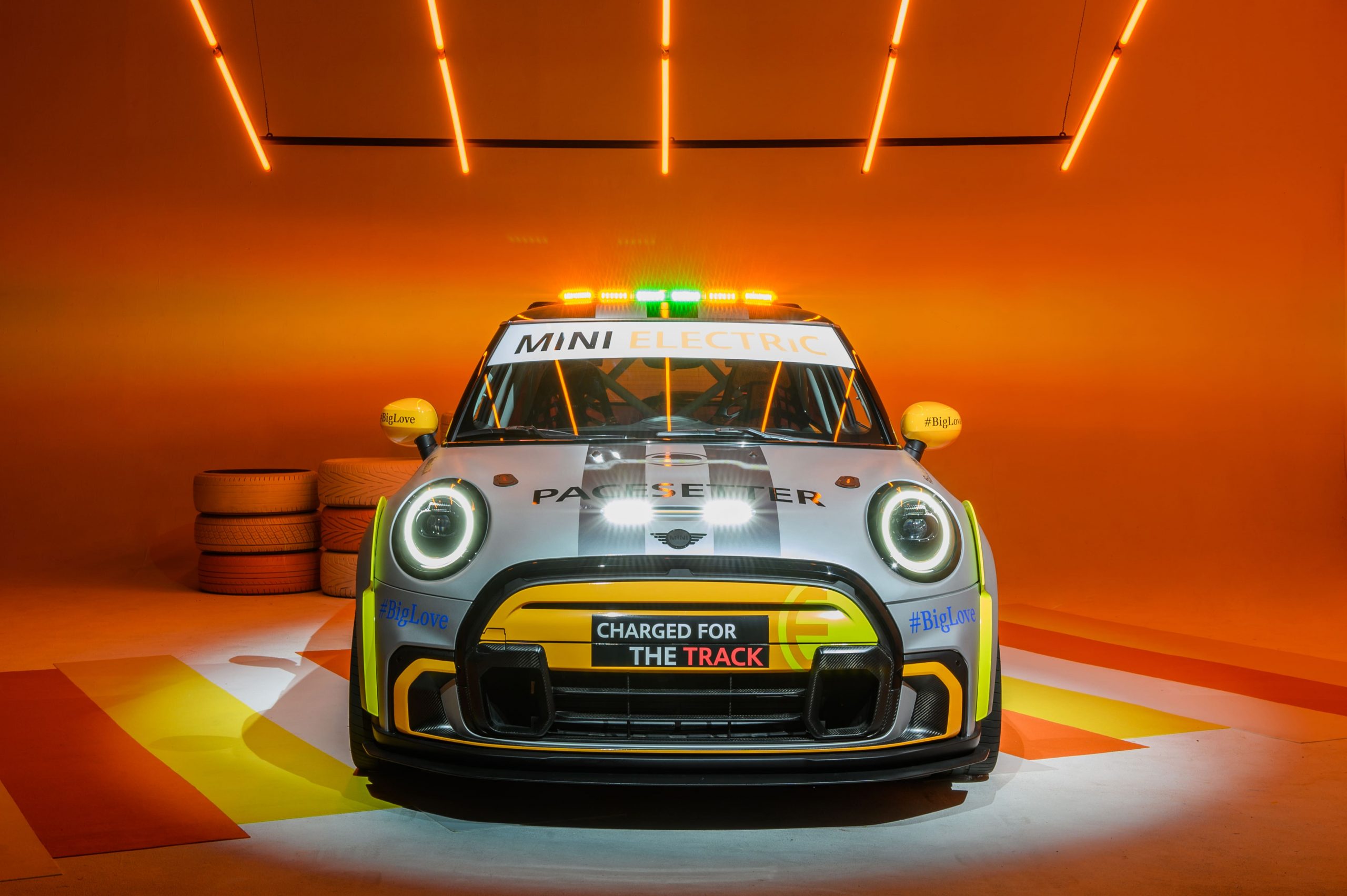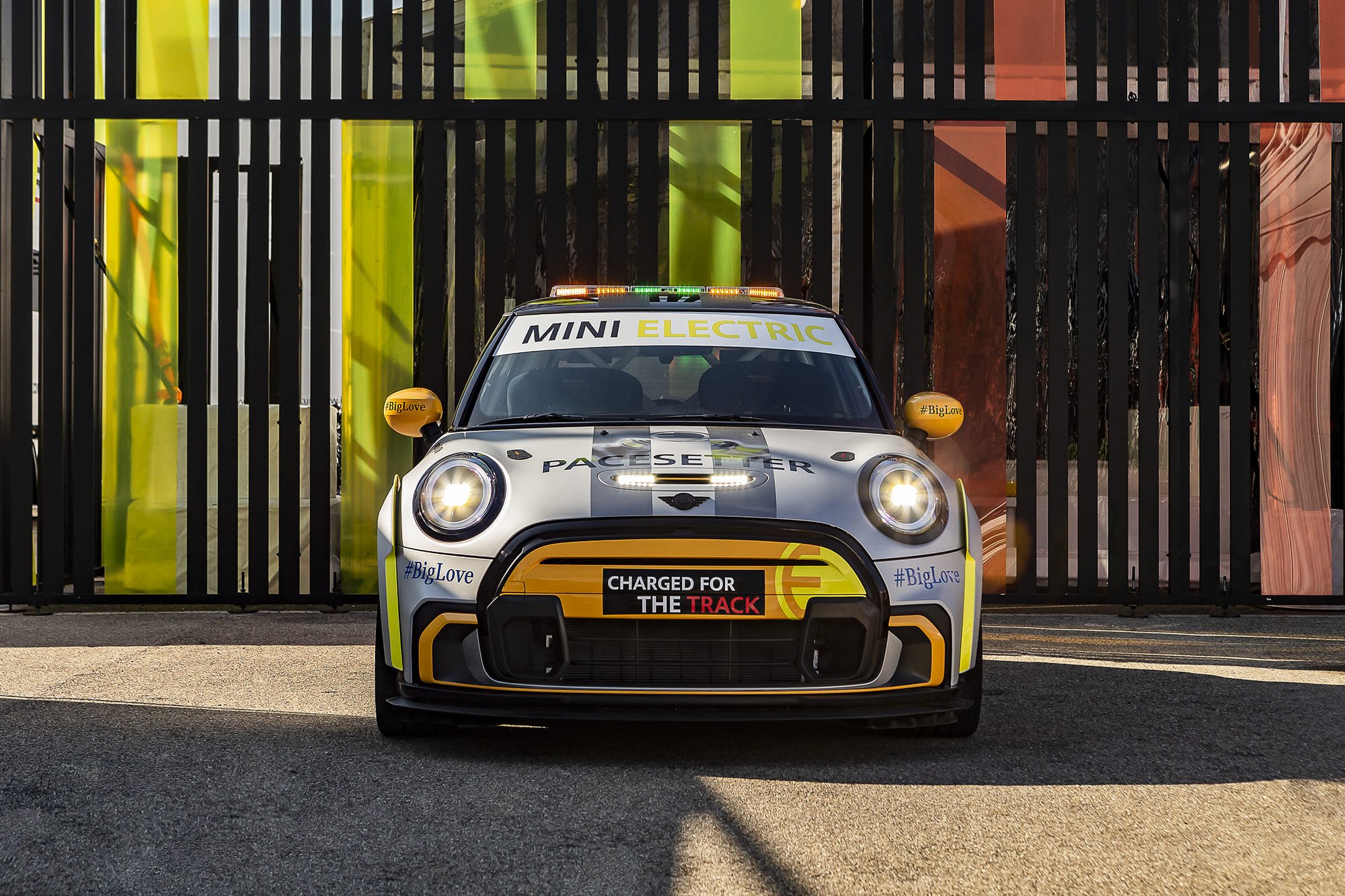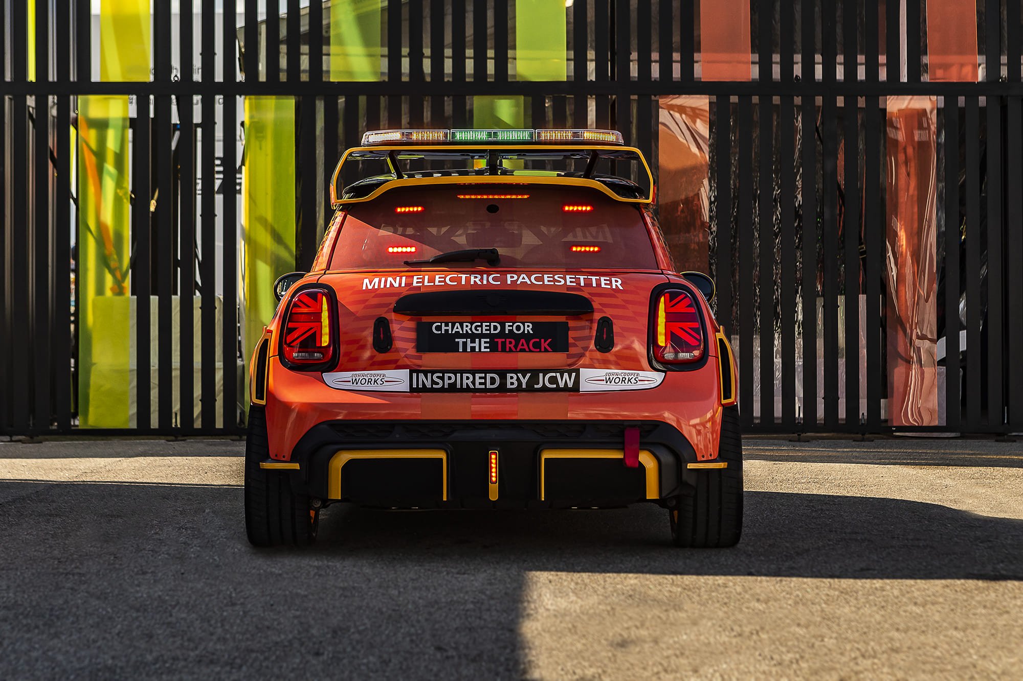 ด้านหน้าของรถ The MINI Electric Pacesetter inspired by JCW ยังคงไว้ในแบบฉบับมินิสุดคลาสสิค ในขณะเดียวกันก็ผสานองค์ประกอบที่เป็นเอกลักษณ์ของจอห์น คูเปอร์ เวิร์คส์ เช่น ซุ้มล้อใหม่ที่ได้รับการปรับให้พอดีกับระยะห่างระหว่างล้อ เป็นต้น ส่วนโลโก้ MINI Electric ก็แสดงออกถึงการใช้พลังงานไฟฟ้าที่เป็นหัวใจของรถเซฟตี้คาร์รุ่นนี้นั่นเอง เนื่องจากไม่จำเป็นต้องมีการระบายความร้อนผ่านบริเวณด้านบนของกระจังหน้า ส่วนหน้าของรถยนต์จึงได้รับการออกแบบให้ปิดทึบไว้เป็นส่วนใหญ่เพื่อเสริมประสิทธิภาพด้านแอโรไดนามิกส์ ยกเว้นบริเวณด้านล่างกระจังหน้าและชุดกันชนหน้าสุดโดดเด่นที่เพิ่มดีไซน์ให้คล้ายช่องดักอากาศเพื่อระบายความร้อนให้ชุดเบรก ส่วนไฟสีขาวกะพริบของรถนั้นถูกรวมเข้ากับฝากระโปรงหน้าไว้ได้อย่างกลมกลืน พร้อมถ่ายทอดดีเอ็นเอของมินิผ่านลวดลาย Bonnet Stripes ตั้งแต่หลังคายันท้ายรถ