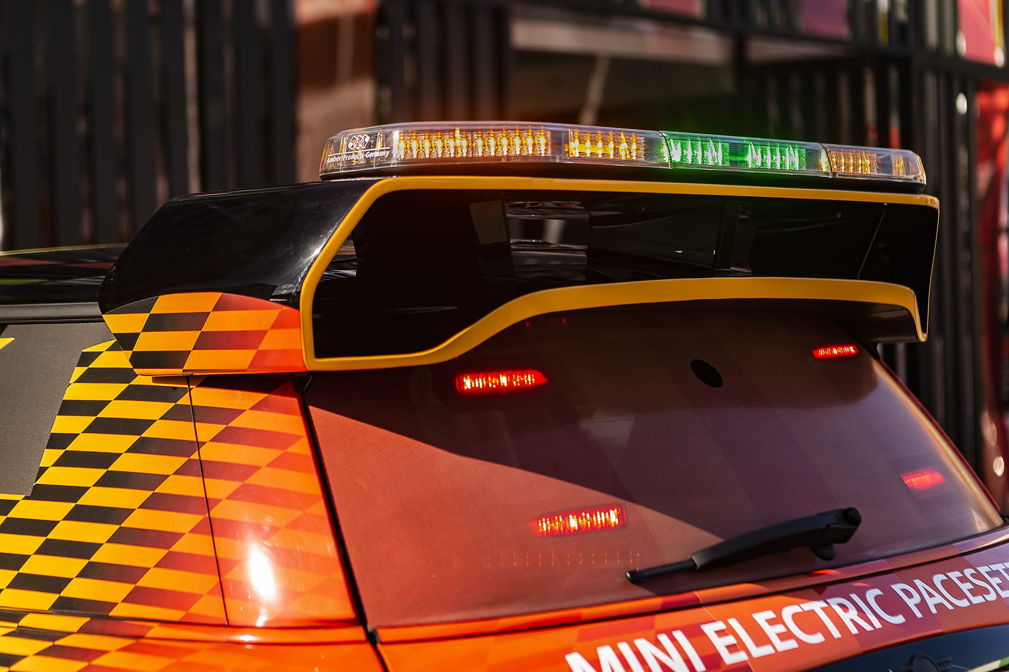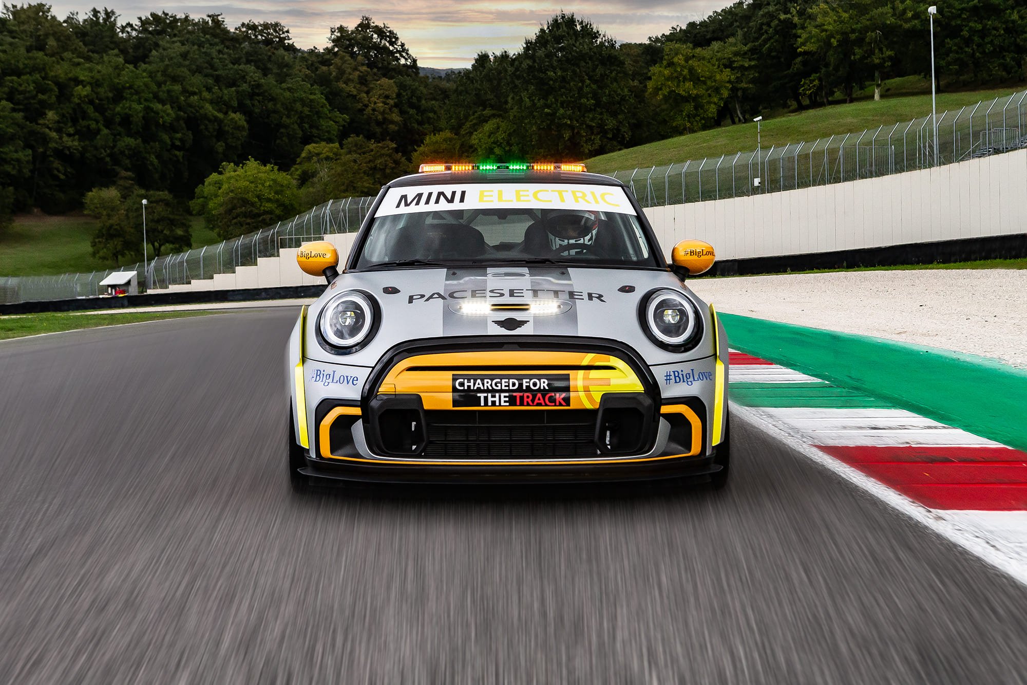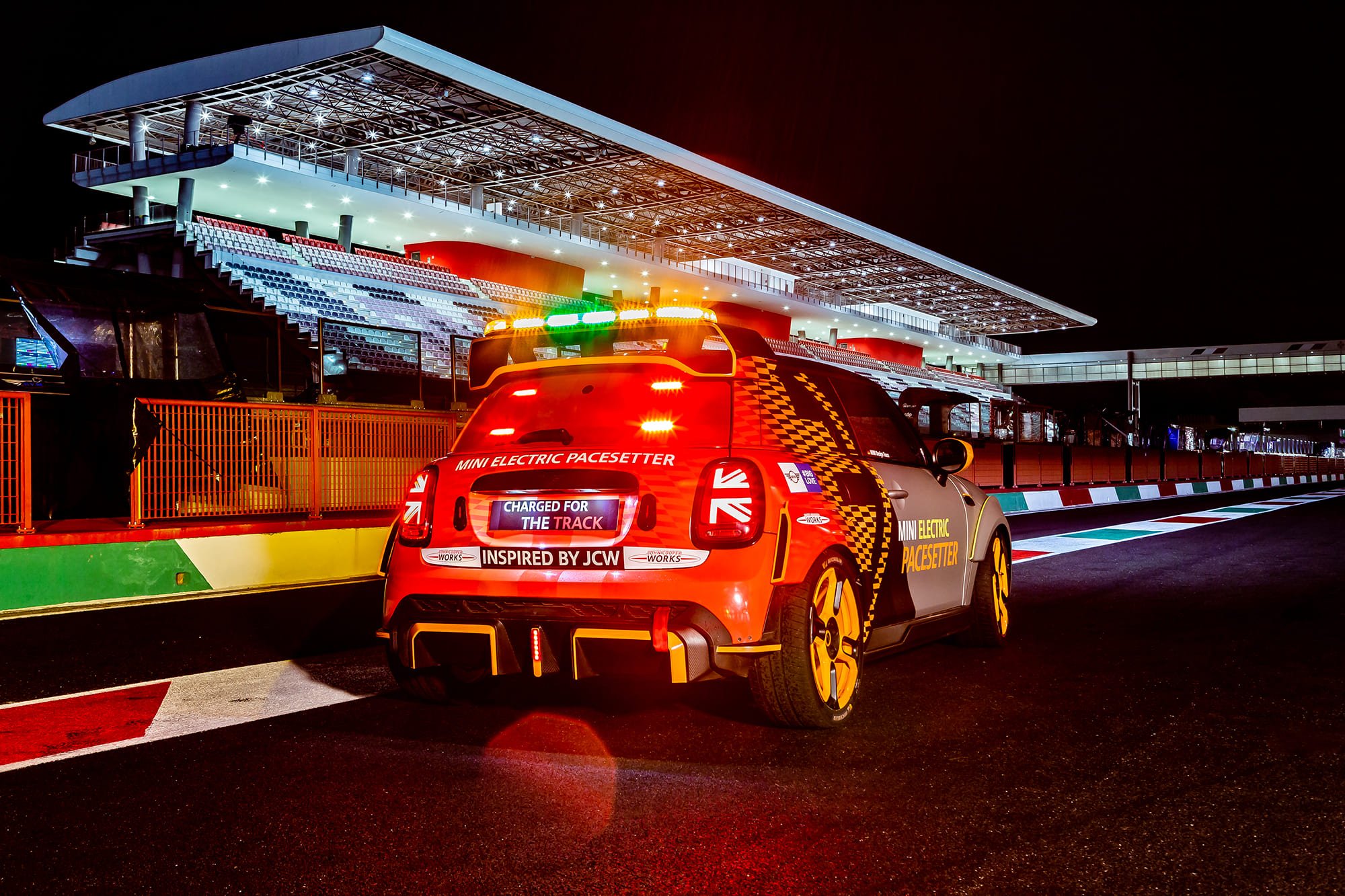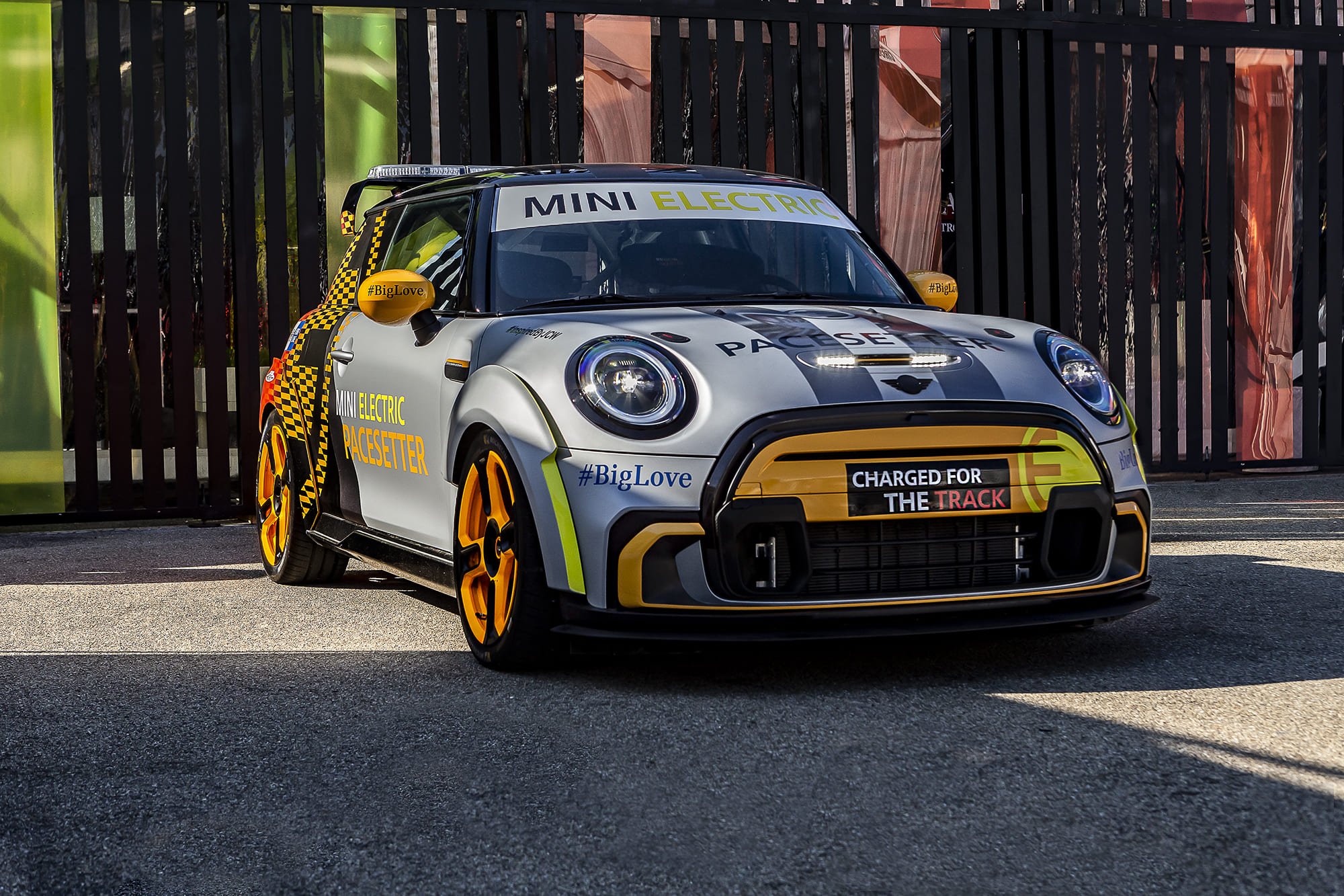 ด้านหน้าของรถ The MINI Electric Pacesetter inspired by JCW ยังคงไว้ในแบบฉบับมินิสุดคลาสสิค ในขณะเดียวกันก็ผสานองค์ประกอบที่เป็นเอกลักษณ์ของจอห์น คูเปอร์ เวิร์คส์ เช่น ซุ้มล้อใหม่ที่ได้รับการปรับให้พอดีกับระยะห่างระหว่างล้อ เป็นต้น ส่วนโลโก้ MINI Electric ก็แสดงออกถึงการใช้พลังงานไฟฟ้าที่เป็นหัวใจของรถเซฟตี้คาร์รุ่นนี้นั่นเอง เนื่องจากไม่จำเป็นต้องมีการระบายความร้อนผ่านบริเวณด้านบนของกระจังหน้า ส่วนหน้าของรถยนต์จึงได้รับการออกแบบให้ปิดทึบไว้เป็นส่วนใหญ่เพื่อเสริมประสิทธิภาพด้านแอโรไดนามิกส์ ยกเว้นบริเวณด้านล่างกระจังหน้าและชุดกันชนหน้าสุดโดดเด่นที่เพิ่มดีไซน์ให้คล้ายช่องดักอากาศเพื่อระบายความร้อนให้ชุดเบรก ส่วนไฟสีขาวกะพริบของรถนั้นถูกรวมเข้ากับฝากระโปรงหน้าไว้ได้อย่างกลมกลืน พร้อมถ่ายทอดดีเอ็นเอของมินิผ่านลวดลาย Bonnet Stripes ตั้งแต่หลังคายันท้ายรถ