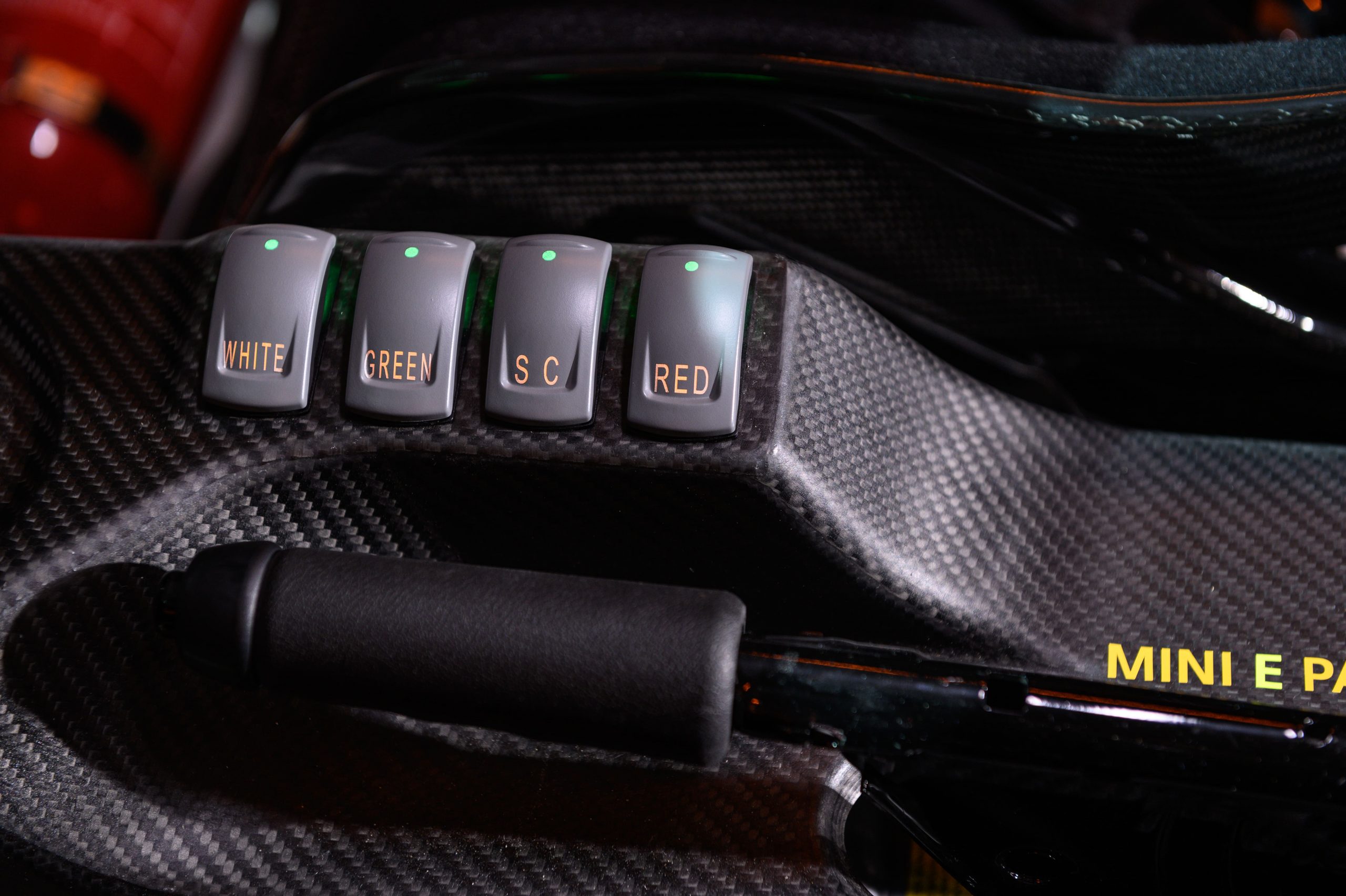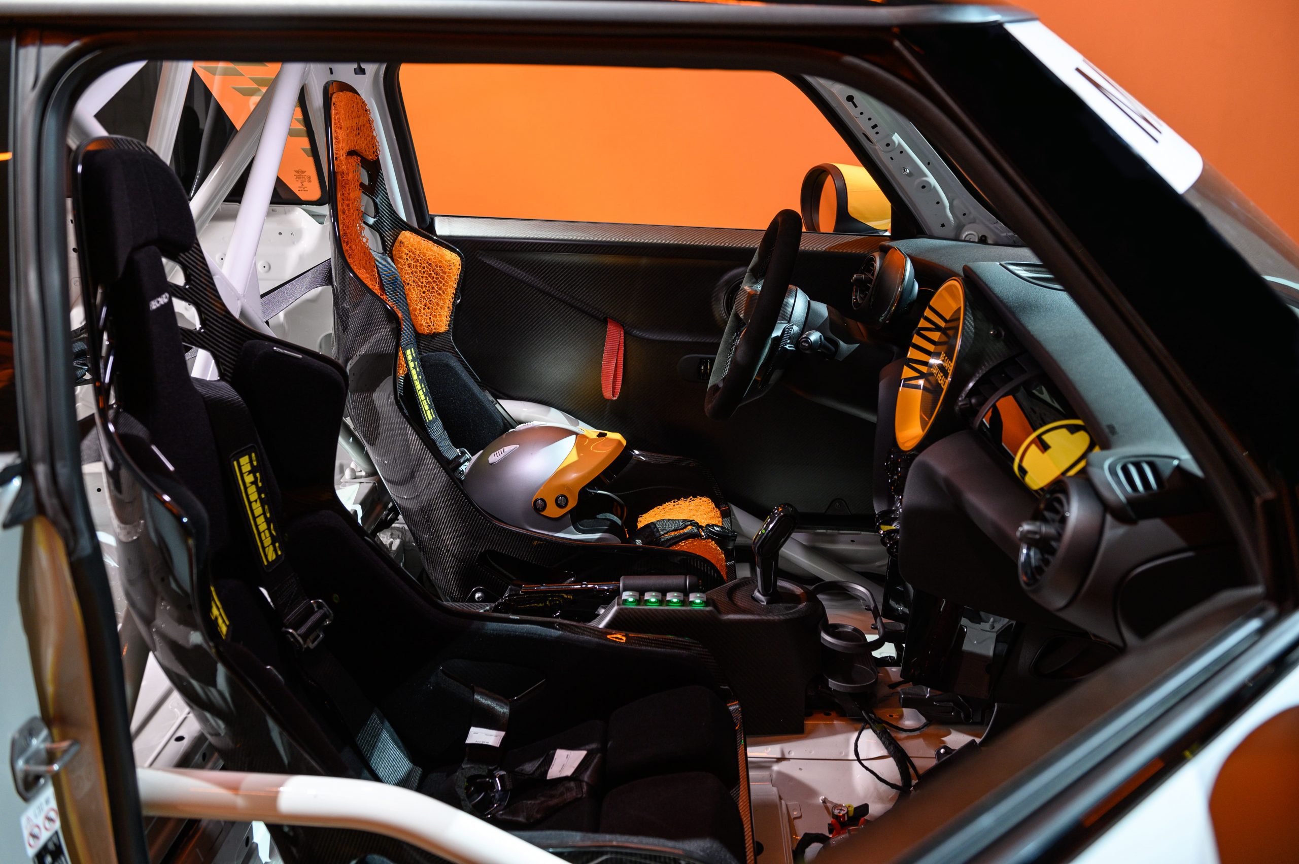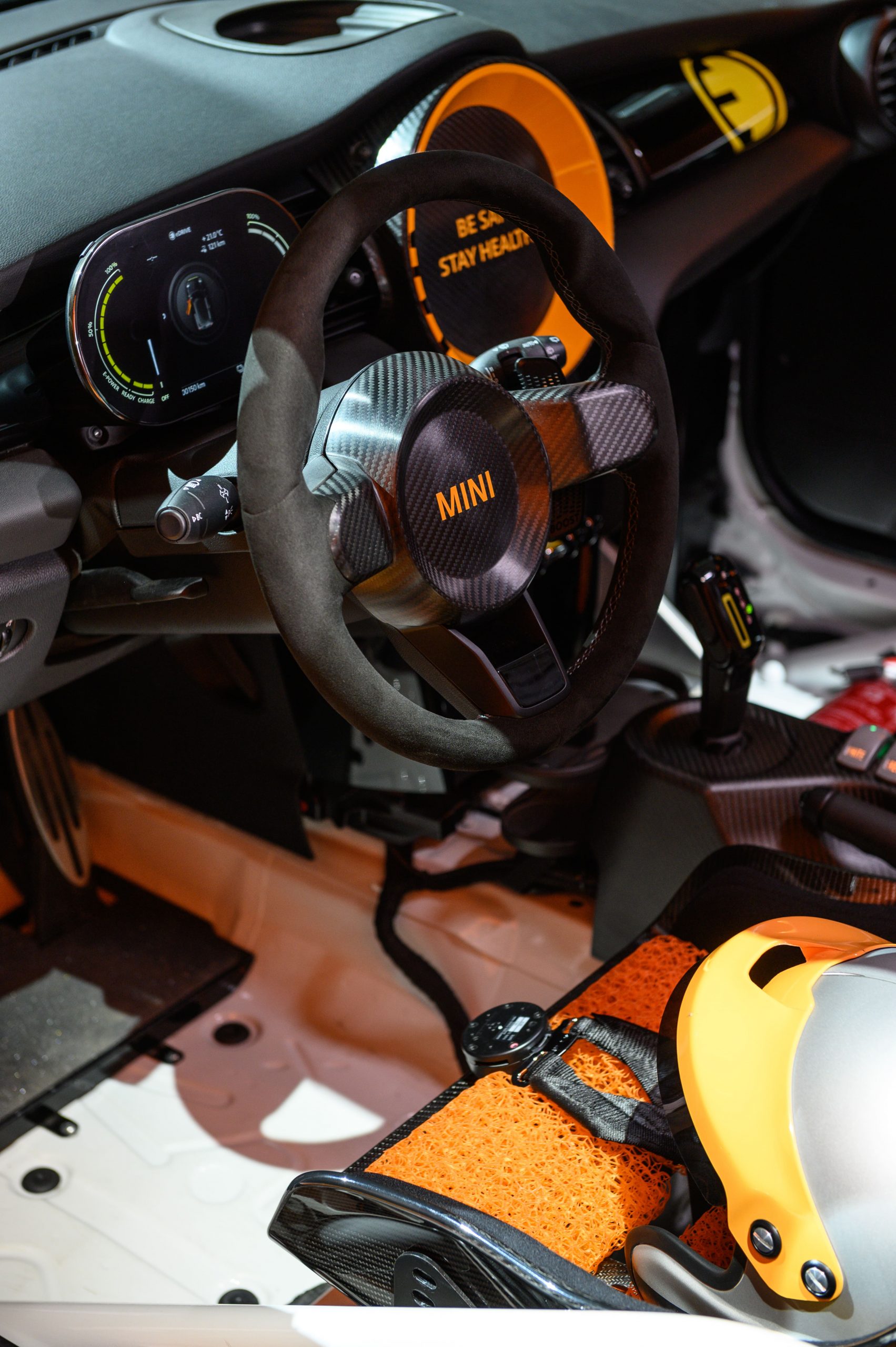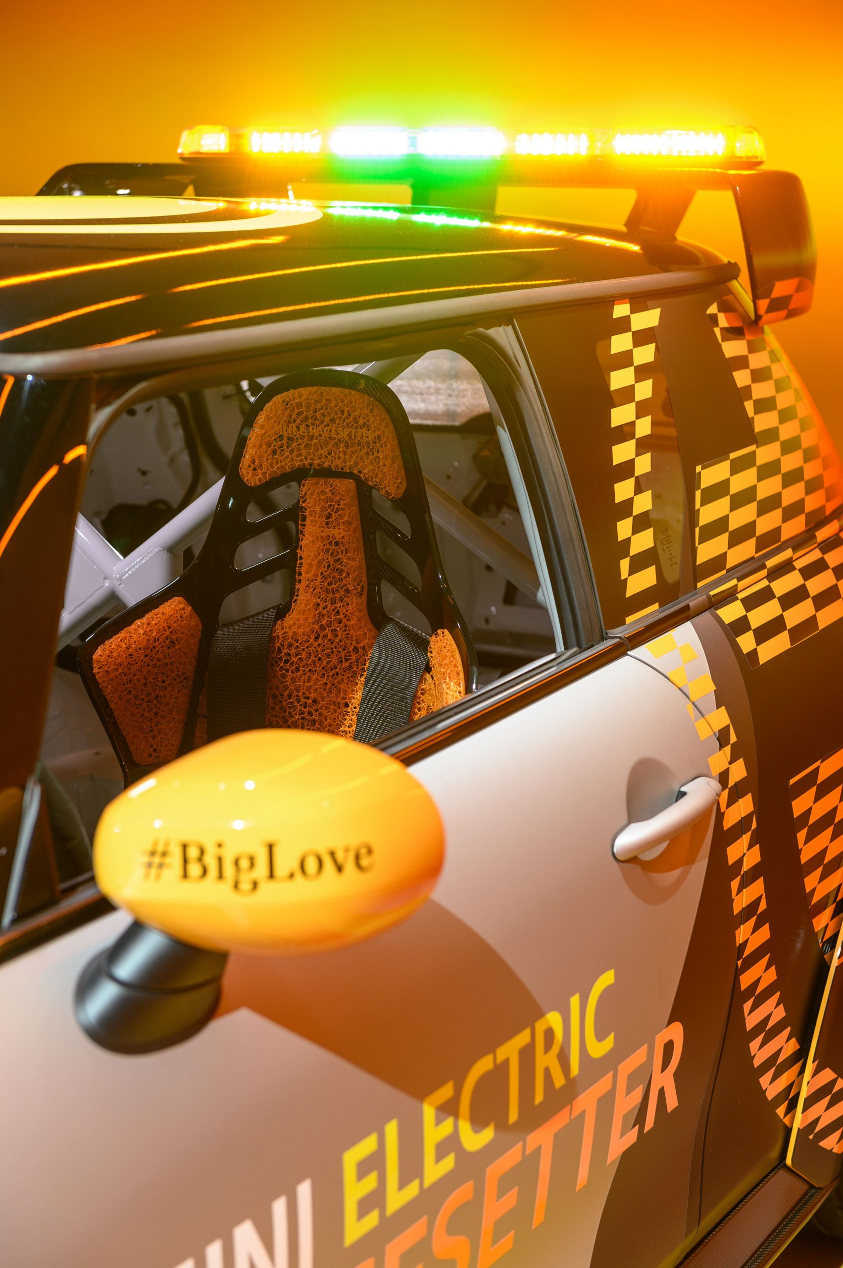 ภายในของ The MINI Electric Pacesetter inspired by JCW ติดตั้งอุปกรณ์ที่จำเป็นของรถเซฟตี้คาร์ เหลือแต่เบาะคู่หน้า โดยเบาะฝั่งคนขับมาพร้อมเข็มขัดนิรภัย 6 จุดที่ได้รับการรับรองสำหรับทั้งการแข่งรถและการใช้งานบนท้องถนน ส่วนพวงมาลัยเรียบง่ายทำจากคาร์บอนไฟเบอร์ดูดซับแรงกระแทกได้และจอแสดงผลดิจิทัล ส่วนคอนโซลกลางคงเหลือแต่ด้ามเกียร์ เบรกมือและสวิตช์ควบคุมไฟสัญญาณเท่าที่จำเป็น โดยทำจากคาร์บอนไฟเบอร์ทั้งหมด ส่วนมือเปิดประตูใช้สายผ้าดึง และโรลเคจนิรภัยแบบเต็มลำเพื่อความปลอดภัยสูงสุด