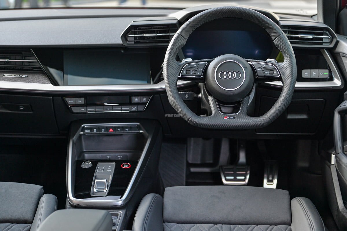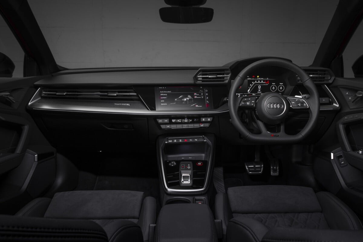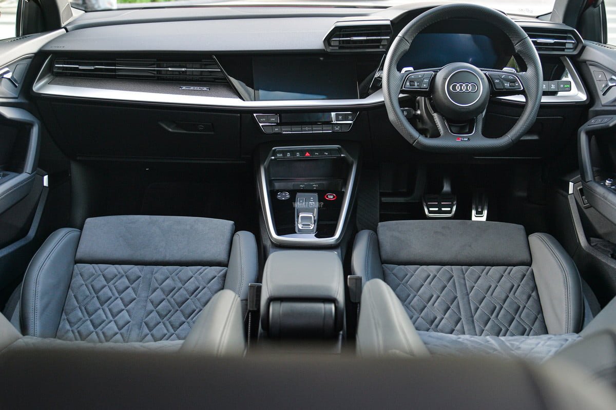 The New Audi RS3 Sportback ใช้วัสดุตกแต่งภายในห้องโดยสาร ลาย Carbon Atlas Structure และมาพร้อมไฟเรื่องแสง นอกจากนี้มีพวงมาลัยท้ายตัดมัลติฟังชัน สไตล์ RS sport หุ้มหนังพร้อม paddle shift และยังมีปุ่มปรับโหมด RS performance บนพวงมาลัยฝั่งด้านขวาเพื่อให้ง่ายต่อการปรับโหมด โดยไม่ต้องเอามือออกจากพวงมาลัยและมีเบาะหน้าแบบ RS sport stitching ลาย diamond cut ปรับด้วยไฟฟ้าพร้อมระบบปรับดันหลังไฟฟ้า Lumbar Support อีกทั้งมีระบบบันทึกความจำตำแหน่ง Memory Seat และเบาะหลังหุ้มหนัง Dinamica microfibre/synthetic โดยที่เบาะนั่งด้านหลังสามารถแยกพับ 40 : 20 : 40 และพับเรียบได้ นอกจากนี้มีคันเกียร์แบบ Electronic e-Shifter มาพร้อมกระจกมองหลัง แบบปรับลดแสงอัตโนมัติ ดีไซน์แบบไร้กรอบ และมีระบบปรับอากาศ แบบอัตโนมัติ แยกอิสระ 3-Zones อีกด้วย