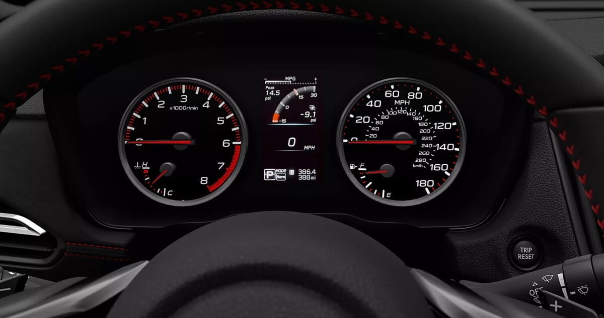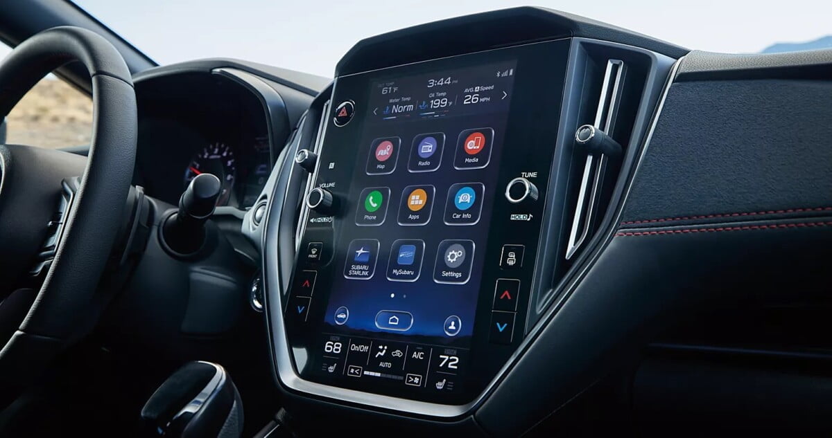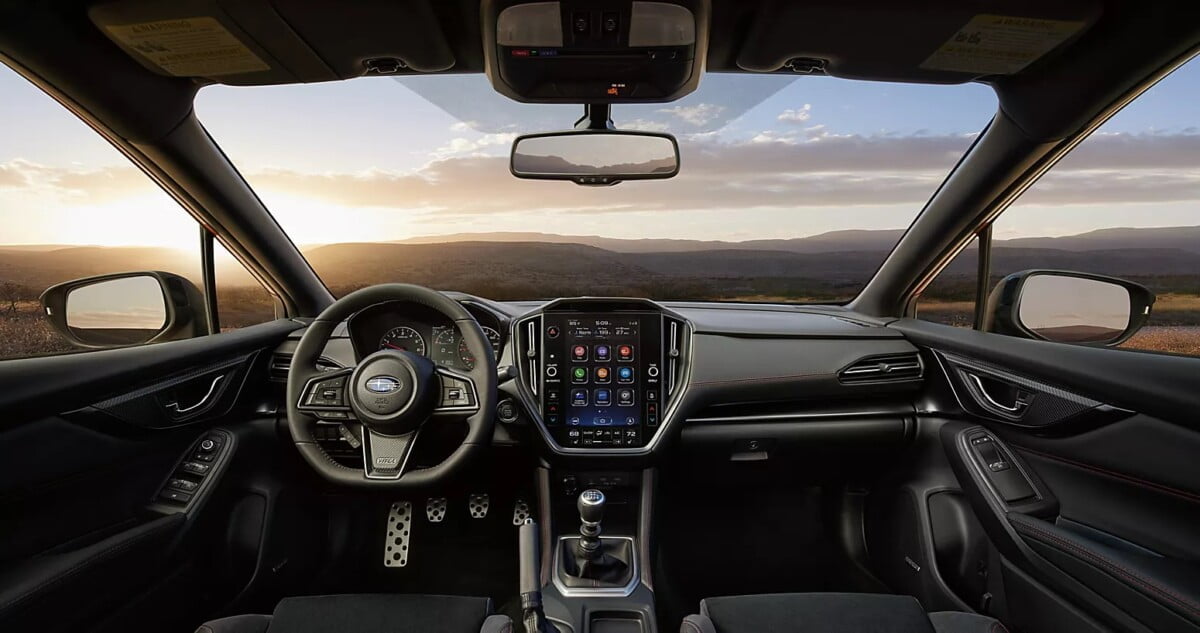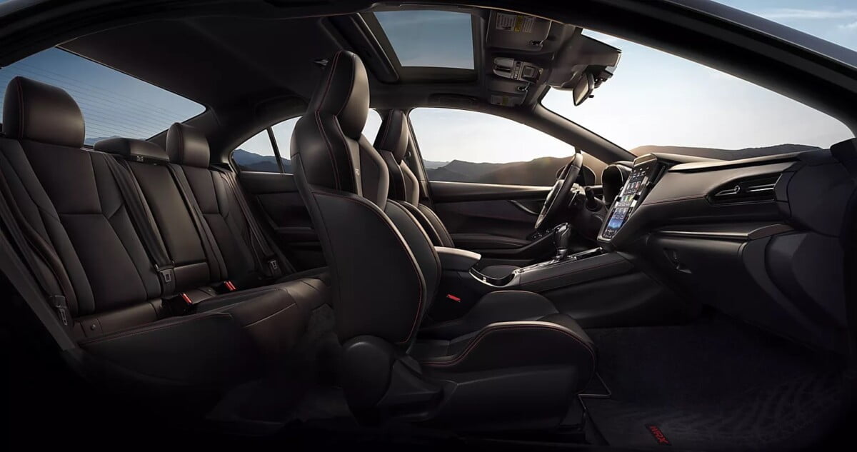 ภายในสีดำเย็บด้วยด้ายสีแดงตัดกันและลายคาร์บอนไฟเบอร์ที่เน้นย้ำถึงสมรรถนะของตัวรถ จอแสดงผลข้อมูลส่วนกลางแบบ Full HD ขนาด 11.6 นิ้วสไตล์แท็บเล็ต สำหรับควบคุม EyeSight4.0 พร้อมระบบเครื่องเสียง Harman Gardon 11 จุด มอบความบันเทิงและสุนทรีย์ในการขับขี่