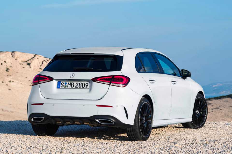 ไฟท้าย LED ดีไซน์ใหม่ช่วยทำให้รถดูกว้างและสปอร์ตมาก ซุ้มล้อออกแบบมารองรับกับล้ออัลลอยขนาดสูงสุด 19 นิ้ว แม้จะไม่ใช่รุ่น AMG ก็ใส่ได้ซึ่งนี่คือครั้งแรก มิติภายนอกของตัวรถยาว 4419 มม. กว้าง 1796 มม. สูง 1440 มม. Mercedes ออกแบบให้ประตูท้ายของ A-Class มีขนาดใหญ่กว่าเดิมเล็กน้อยเพื่อความสะดวกในการขนถ่ายสัมภาระ ความจุห้องเก็บสัมภาระเพิ่มจากรุ่นก่อน 29 ลิตรเป็น 370 ลิตร