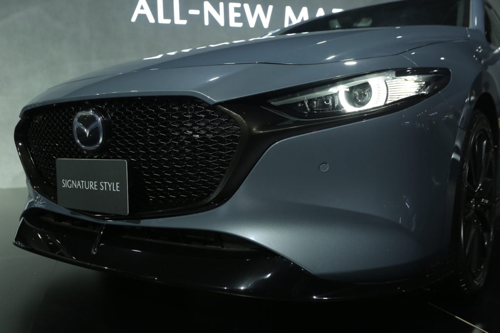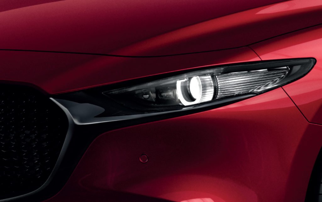ภายนอกของ All-New Mazda 3 ถูกลดทอนเส้นสายที่ไม่จำเป็นออกไป ดีไซน์หน้ารถให้อารมณ์คมเข้มดุดันจากกระจังหน้าขนาดใหญ่ ขนาบข้างด้วยไฟหน้า LED Projector Lens พร้อมไฟ Daytime Running Light แบบ LED รูปร่างเฉียบคม มีระบบปรับระดับไฟหน้าสูง-ต่ำ แบบอัตโนมัติ และระบบไฟหน้า เปิด-ปิด อัตโนมัติ