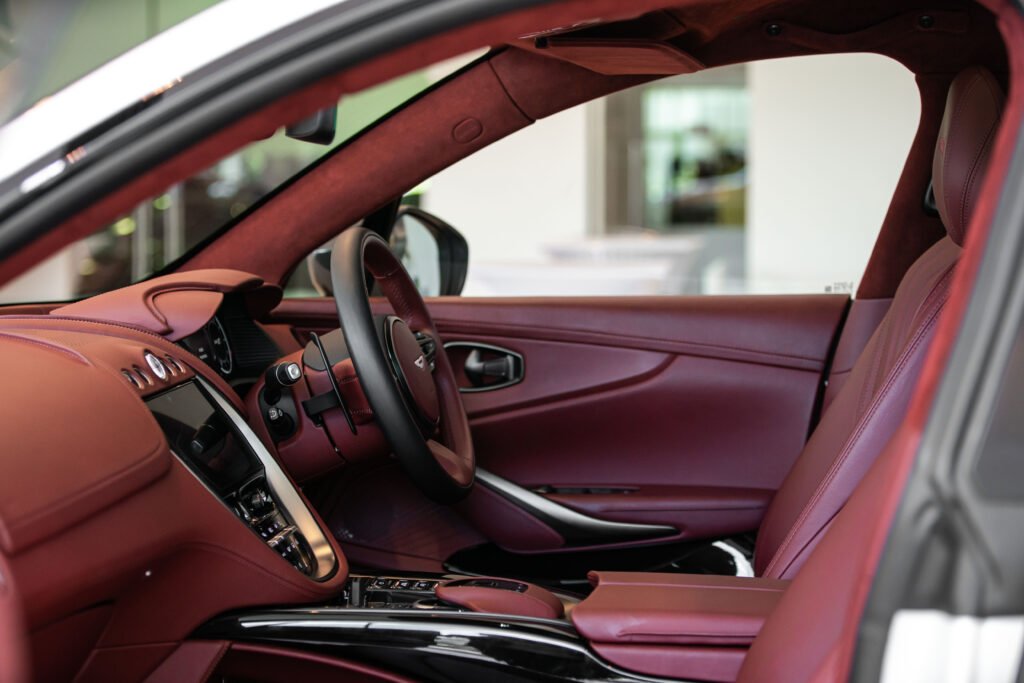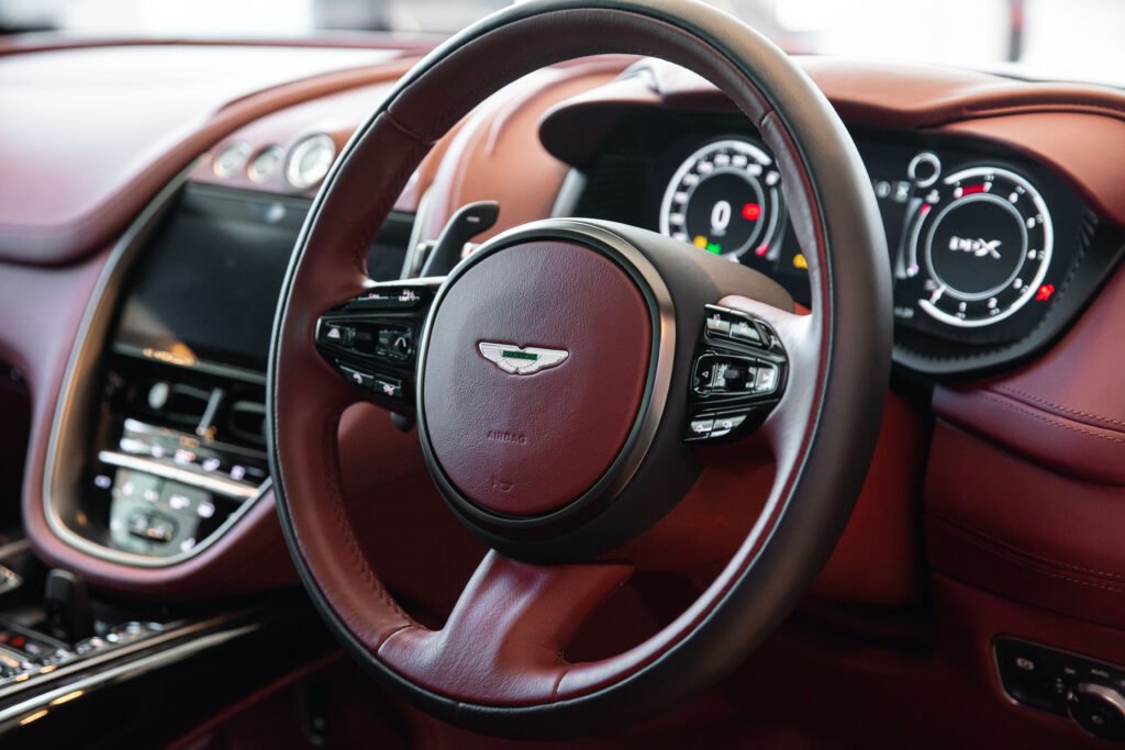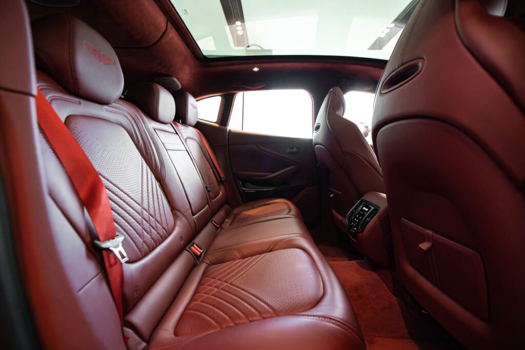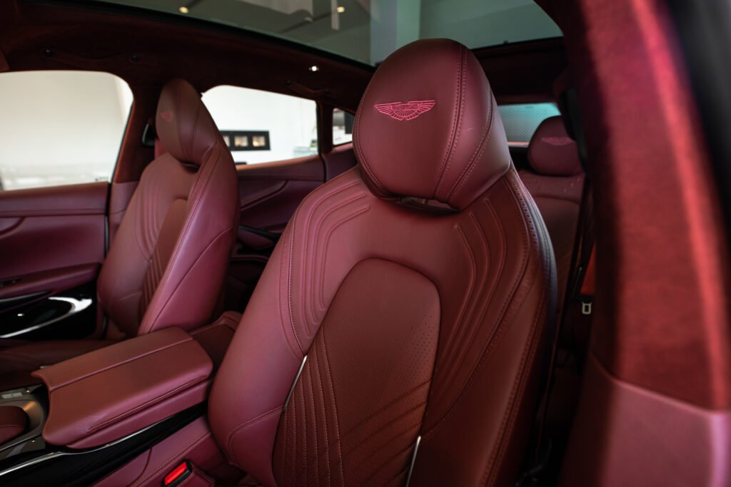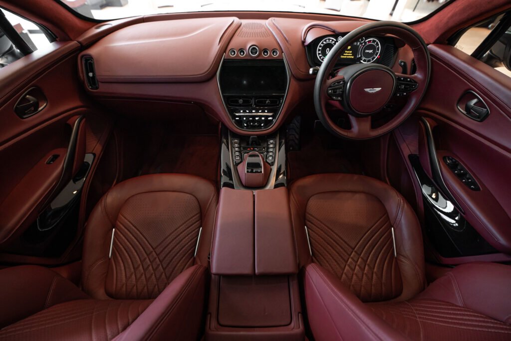 ห้องโดยสารของ DBX ยังคงบุคลิกที่เป็นเอกลักษณ์ของ Aston Martin ด้วยการดีไซน์ที่ประณีตและพิถีพิถัน เมื่อเทียบกับคู่แข่ง 2 รุ่นที่กล่าวข้างต้นจะเห็นได้ชัดว่ามากันคนละแนว DBX กว้างและหรูหรากว่า ตกแต่งด้วยอะลูมิเนียมและหนังแท้ full natural grain ‘Caithness’ ที่มีกลิ่นหอมและผิวเรียบเนียน