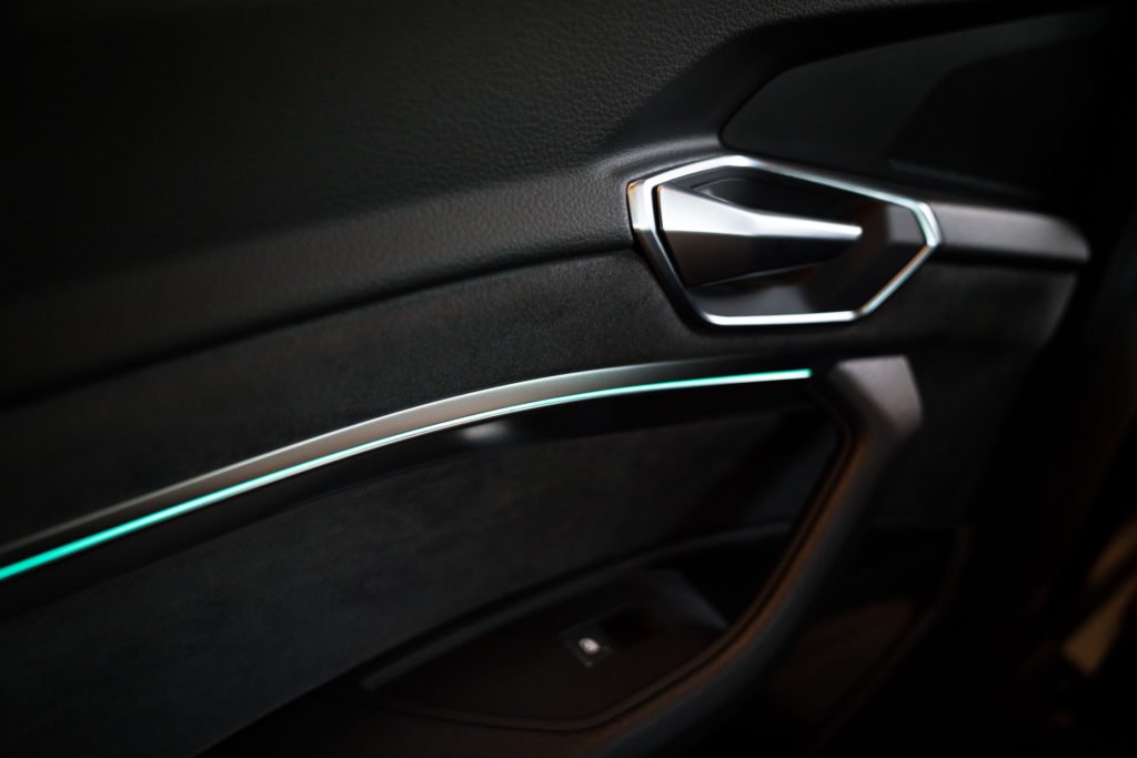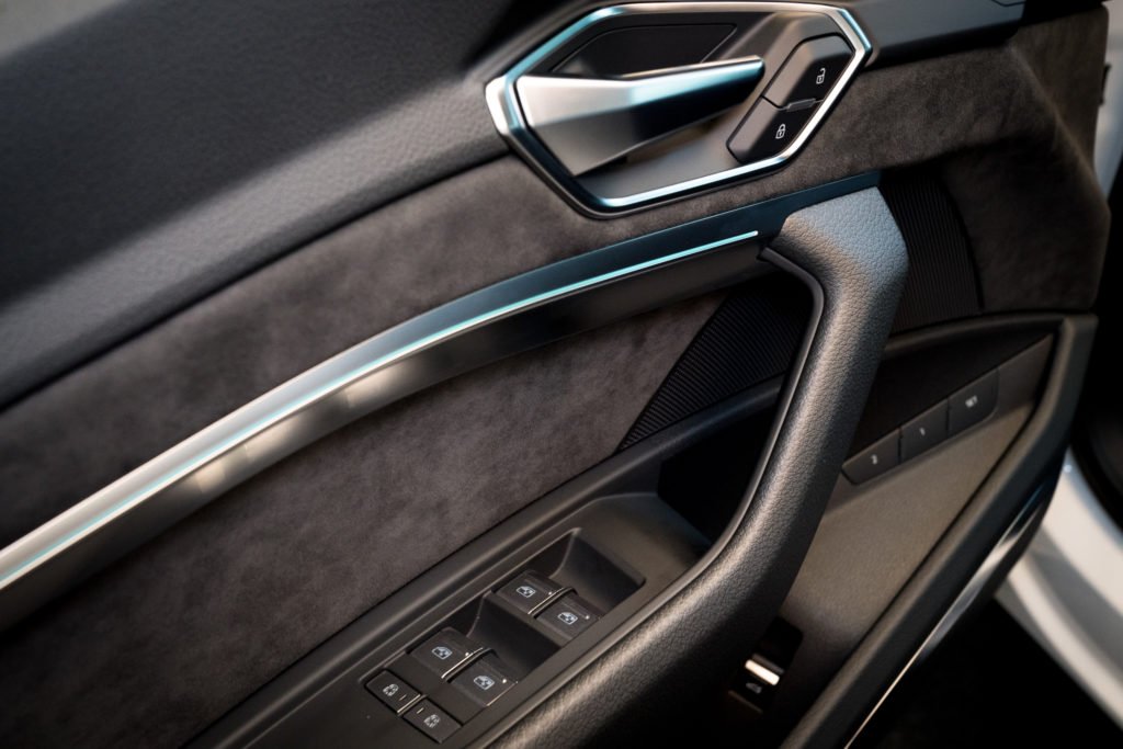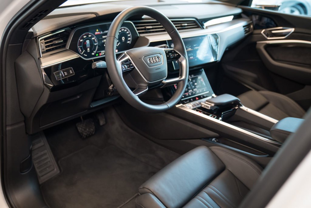 ห้องโดยสารของ Audi e-tron มีดีไซน์ที่ล้ำยุคเช่นเดียวกับรถอาวดี้รุ่นใหม่อื่นๆ แฝงด้วยความสปอร์ต วัสดุที่ใช้เป็นหนังบุนุ่ม ตกแต่งด้วยชิ้นส่วนสีเงินอะลูมิเนียม หน้าจอระบบสาระบันเทิงเอียงทำมุมเข้าหาผู้ขับ หน้าปัดเป็นระบบดิจิตอลทั้งหมด พวงมาลัยดีไซน์ล้ำพร้อมปุ่มควบคุมเครื่องเสียง คันเกียร์รูปทรงแปลกตา นอกจากนี้ยังมาพร้อมอุปกรณ์อำนวยความสะดวกครบครัน นวมถึงระบบเสียง Bang & Olufsen