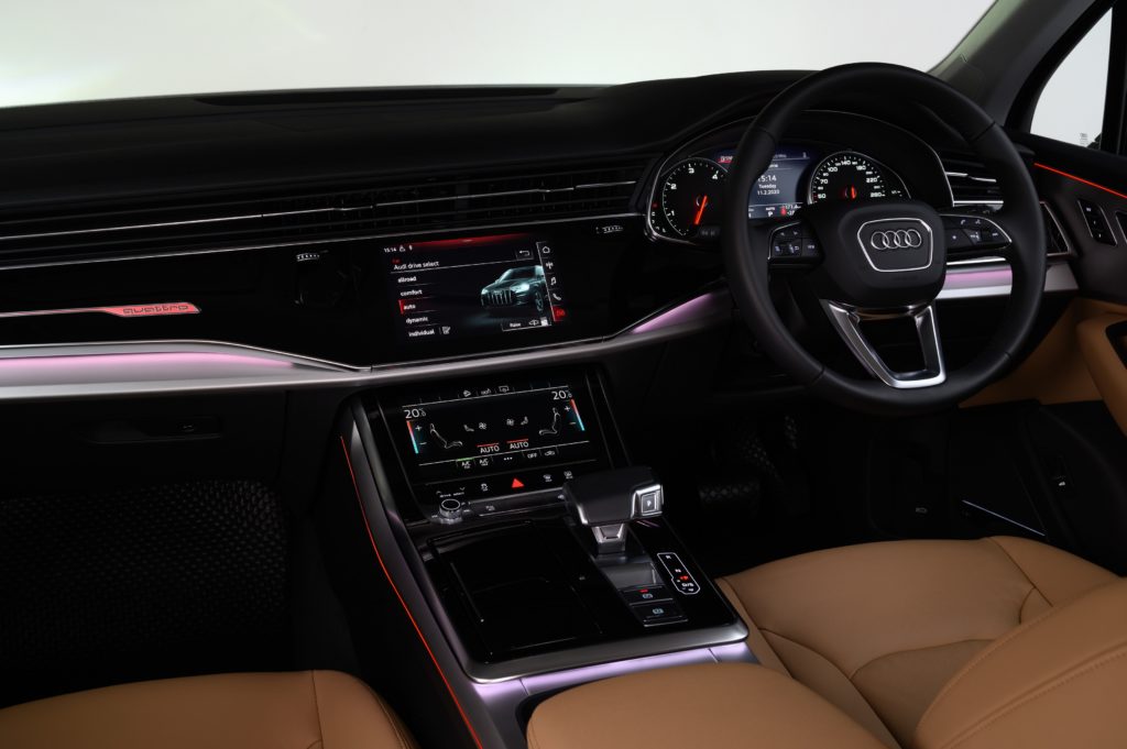 ภายในห้องโดยสารของ Q7 ใหม่สะท้อนถึงแนวทางการออกแบบใหม่ของอาวดี้ที่ผสมผสานทั้งความล้ำหน้าทางเทคโนโลยีและการใช้งานที่ลงตัว บนแดชบอร์ดมาพร้อมหน้าจอสัมผัสขนาดใหญ่ 2 จอ จอด้านบน Full HD ขนาด 8.8 นิ้ว รองรับการเชื่อมต่อ Apple CarPlay และ Android Auto โดย Apple CarPlay สามารถเชื่อมต่อได้ทั้งแบบไร้สาย Wireless ผ่าน Bluetooth หรือใช้สาย USB จอด้านล่างเป็น Full HD ขนาด 8.6 นิ้ว สำหรับควบคุมเครื่องปรับอากาศรวมถึงการตั้งค่าต่างๆ ของรถ