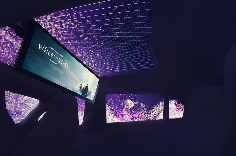หน้าจอขนาดใหญ่มาพร้อมฟังก์ชันสมาร์ททีวีขยายจากส่วนหลังคารถด้วยการเคลื่อนไหวแบบหมุนบนรางแบบประกบสองข้างที่ด้านข้าง การเคลื่อนไหวนี้มาพร้อมกับเสียงที่สร้างขึ้นโดยนักแต่งเพลงชื่อดังอย่าง Hans Zimmer ซึ่งจบลงทันทีที่หน้าจอไปถึงตำแหน่งสุดท้าย ในเวลาเดียวกัน ม่านบังแดดแบบลูกกลิ้งสำหรับกระจกข้างและกระจกหลังจะปิดลงและไฟที่ด้านหลังรถจะหรี่ลง