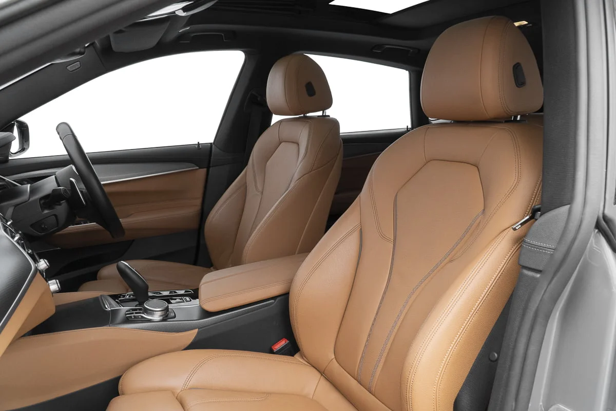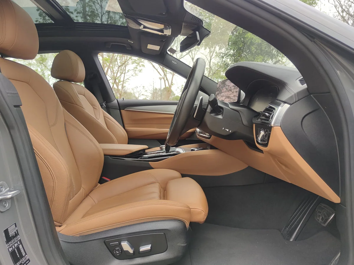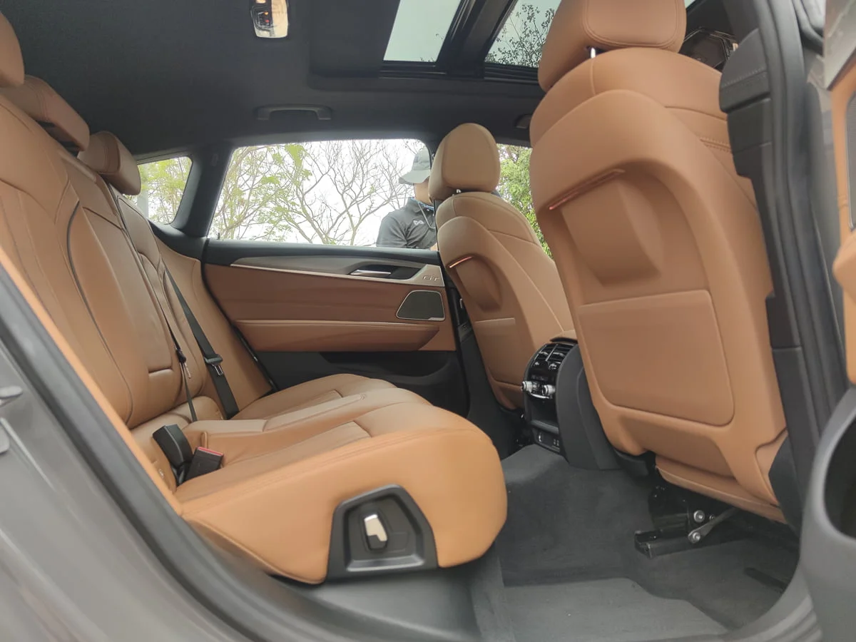 เบาะนั่งเป็นหนังสีน้ำตาลที่มีขนาดใหญ่นั่งสบายให้ความรู้สึกอบอุ่นและตำแหน่งของเบาะที่นั่ง ถูกจัดวางมาได้อย่างลงตัวพร้อมระบบอุ่นเบาะ คอนโซลกลางนั้นหน้าตาเป็นแบบเจนเก่าของทางค่าย BMW ส่วนปรับแอร์เข้ามาเพิ่มเติม แยกโซนอิสระ 4 โซน ระบบสัมผัสยังไม่ค่อยเยอะเท่าไรนัก ยังคงเป็นการใช้งานปุ่มต่างๆ เยอะกว่า ส่วนหัวเกียร์นั้นยังคงเป็นแบบเก่าพอสมควรรวมถึงหน้าตา iDrive เจนก่อนหน้า แต่ยังดีที่รองรับการชาร์จไร้สายในด้านหน้า มาพร้อมกับไฟ Ambient Light ปรับแต่งสีได้ รวมถึงตามขอบประตูด้วยเช่นกัน ด้านบนหลังคามีหลังคากระจก Panorama Roof เปิด-ปิดด้วยระบบไฟฟ้า