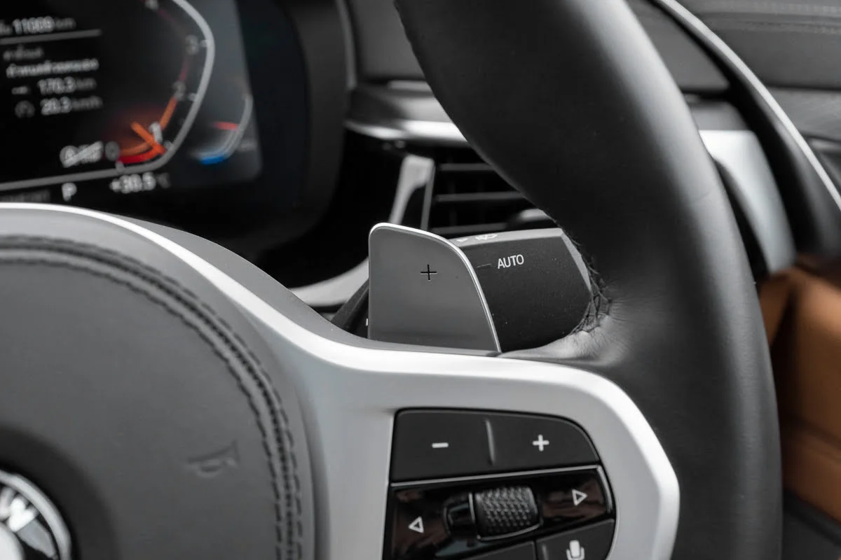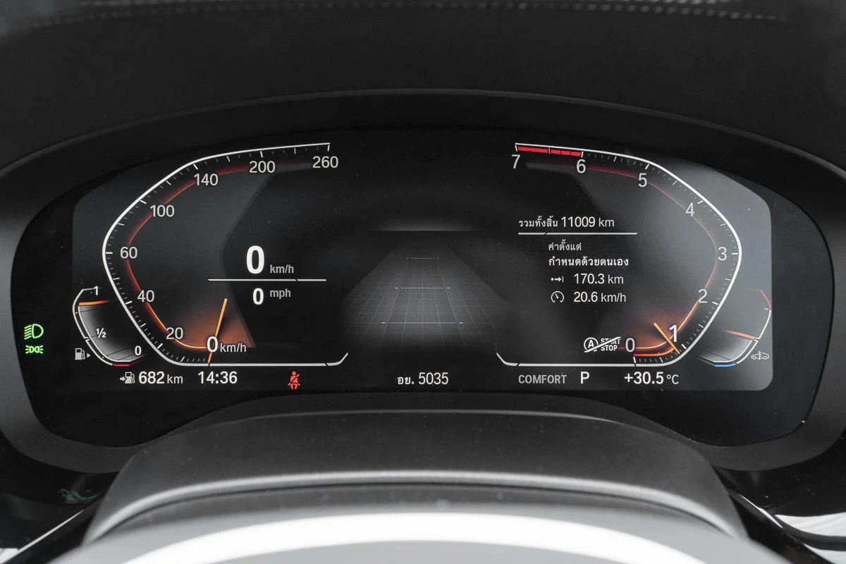 พวงมาลัยรูปทรงกลม พร้อมสัษลักษณ์ M Sport ที่มีความหนาหนาและนุ่มจับได้ถนัดและเป็นแบบมัลติฟังก์ชั่นที่มีปุ่มควบคุมต่างๆ ครบพร้อมการตั้งระยะ Adaptive Cruise Control และ ยังมี Paddle Shift ให้ + /- เล่นเกียร์เสริมความสนุกได้เช่นกัน ส่วนเรือนไมล์ BMW Live Cockpit Professional ขนาด 12.3 นิ้ว ปรับเปลี่ยนหน้าตาได้ 3 แบบโทนสีแตกต่างกันไป