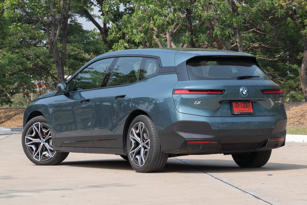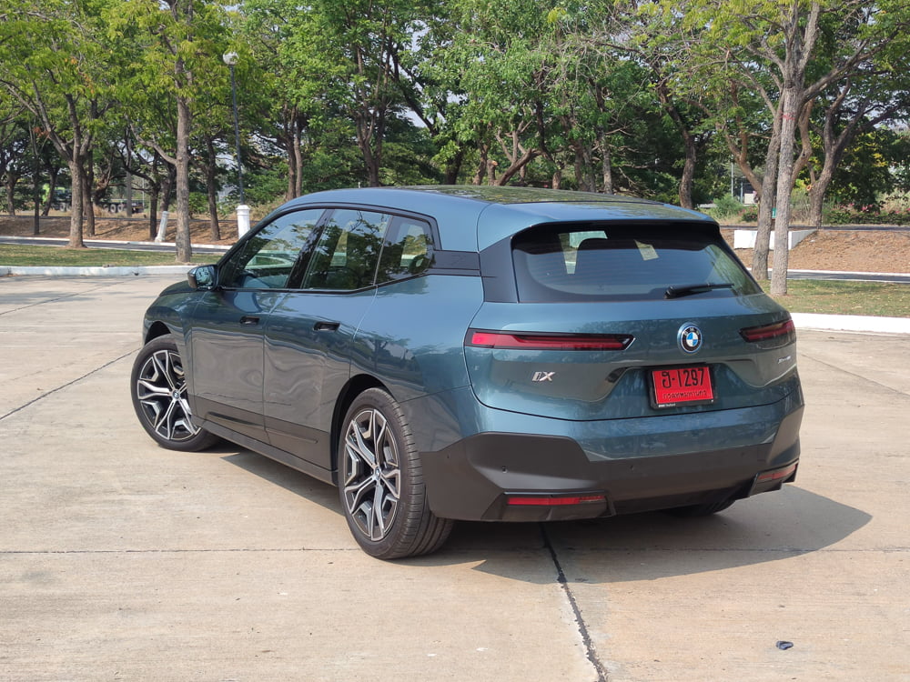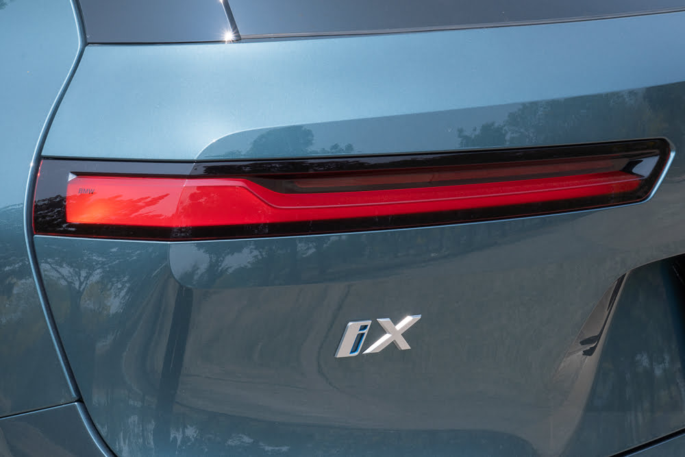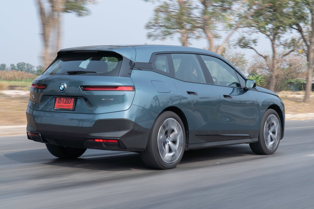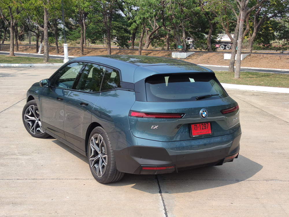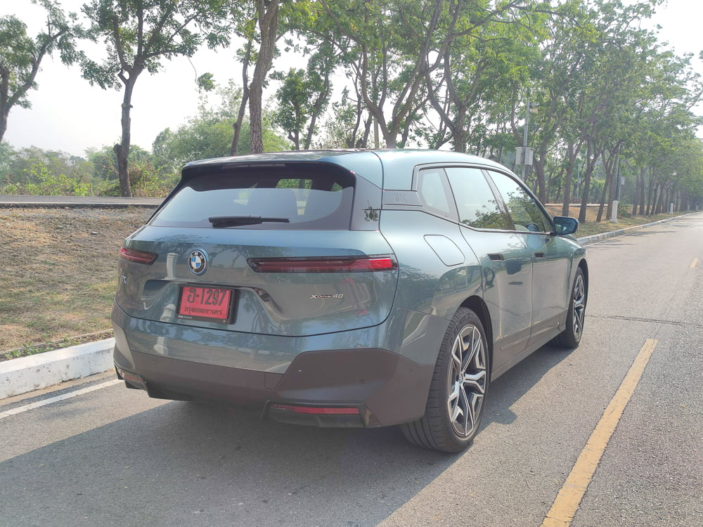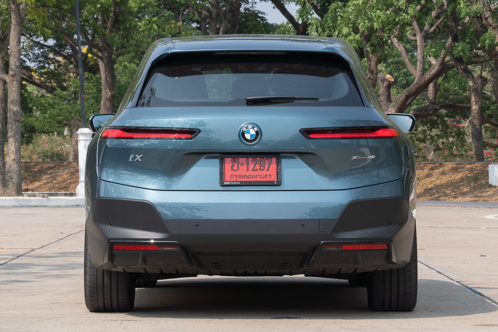 การออกแบบเส้นสายของตัวไฟเบรคข้างหลังมันเป็นแบบยุคใหม่แต่มันยังคงมีความแอบ L Shape ของ BMW รุ่นก่อน แต่ว่ามันจะมีความเนียนเรียบแบบ Minimal ซึ่งก็สมการเป็นรถไฟฟ้า ซึ่งไฟตัวนี้พอเรากดเปิดจะไฟเลี้ยวทำงานส่วนไฟเบรคจะวิ่งไล่จากข้างในออกข้างนอก เราจะเห็นเลยว่าโลโก้เขาจะเด่นขึ้นมาเลยแล้วก็ยังมีกล้องมองหลังซ่อนมาในตัวโลโก้ตัวนี้มาให้ด้วยพร้อมกับตัวฉีดน้ำทำความสะอาดเลนส์กล้องด้านหลังมาให้ด้วย และอักษร iX แสดงว่ารถคันนี้เป็นรถไฟฟ้าตระกูล iX แล้วก็โลโก้ x Drive40 เป็นชื่อรุ่น และเป็นระบบขับเคลื่อน 4 ล้อแบบ All Wheel Drive