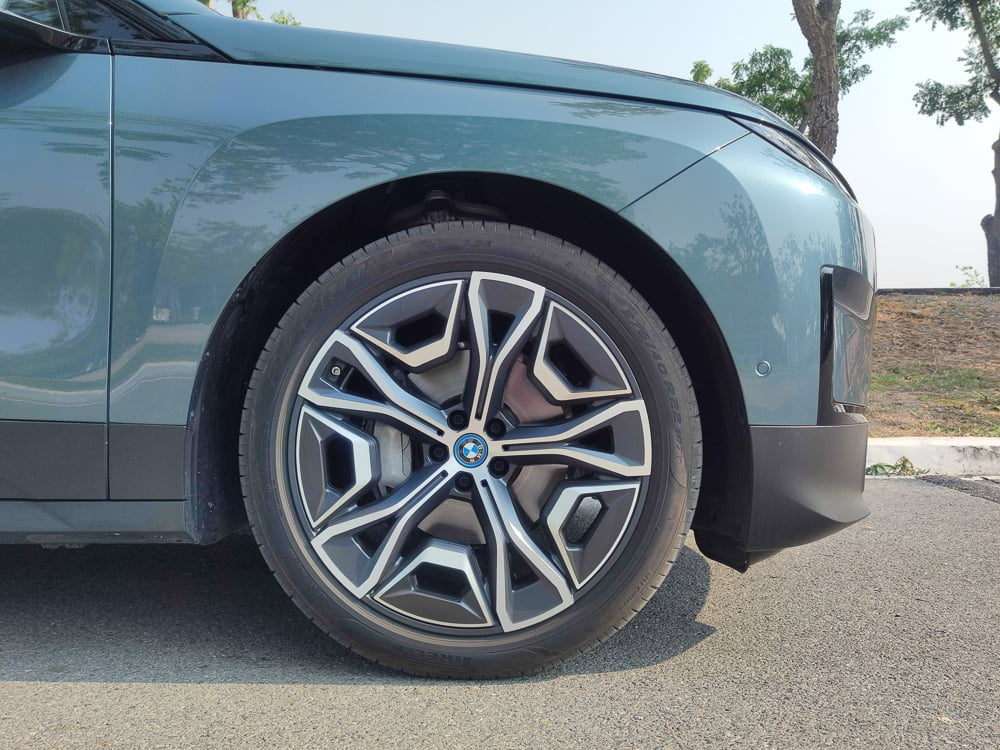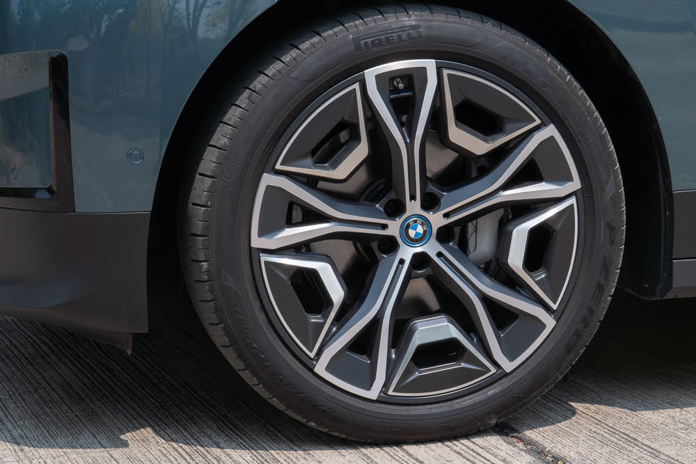 ล้อด้านหน้ามีการออกแบบที่เรียกว่า Aero Dynamic wheel หรือเรียกว่าเป็นการออกแบบตามหลักอากาศพลศาสตร์ ขนาดของล้อแม็กเป็น 22 นิ้ว เรื่องของยางอยู่ที่ 275/44 R 22 ทั้งด้านหน้าแล้วก็ด้านหลัง มาพร้อมวัสดุซับเสียงที่อยู่ในตัวล้อแม็ก มีดิสเบรคขนาดใหญ่ ส่วนคาลิปเปอร์เบรคจะมีการทำงานที่เรียกว่า regenerat ที่แบตเตอรี่จะกลับเข้าไปด้วยหรือว่าชาร์จไฟกลับเข้าไปในแบตเตอรี่ด้วย ระบบกันสะเทือนด้านหน้าเป็นแบบ Double Wishbone ปีกนกคู่ ส่วนโช็คเป็น Air suspension
