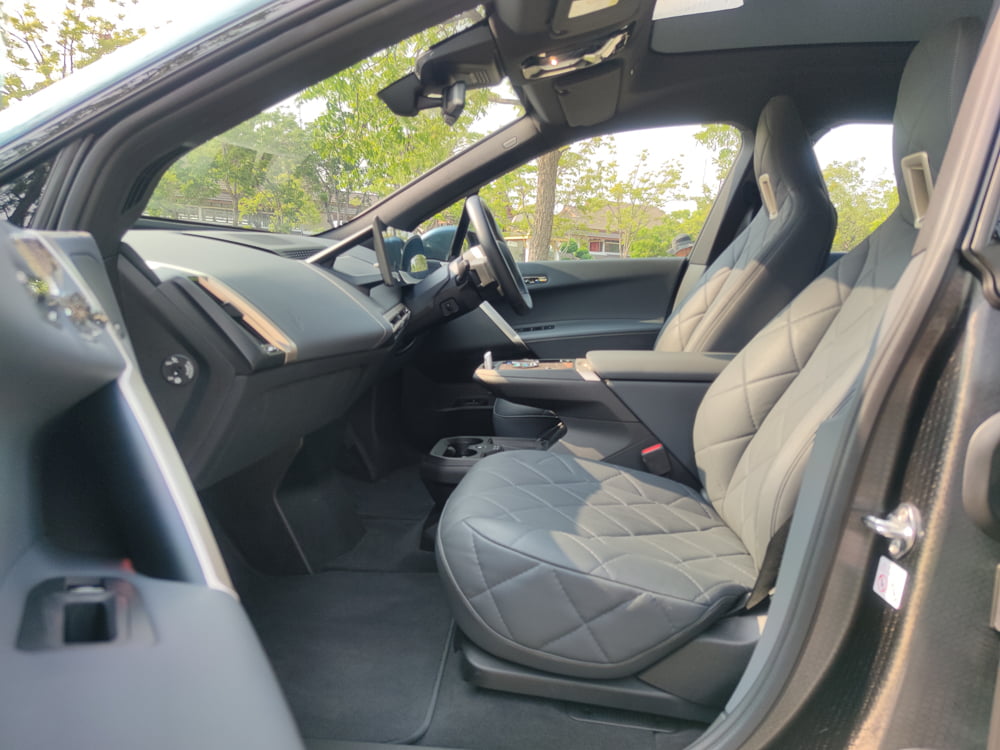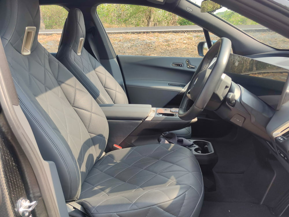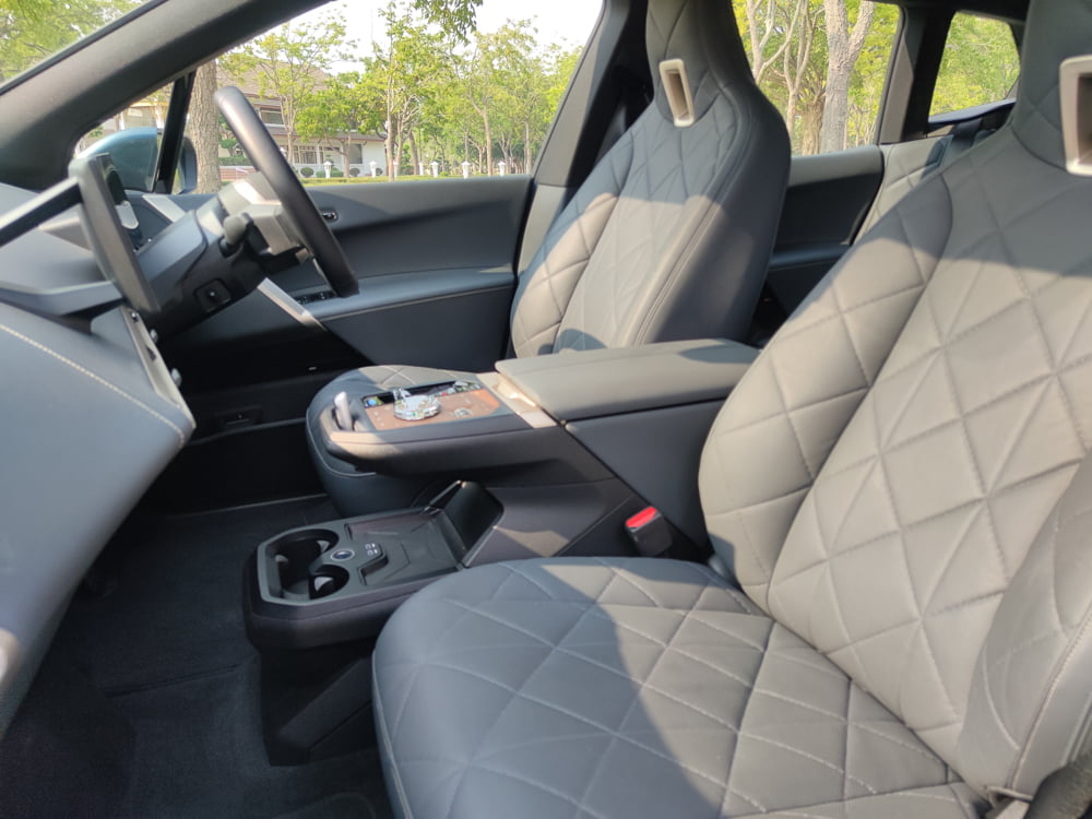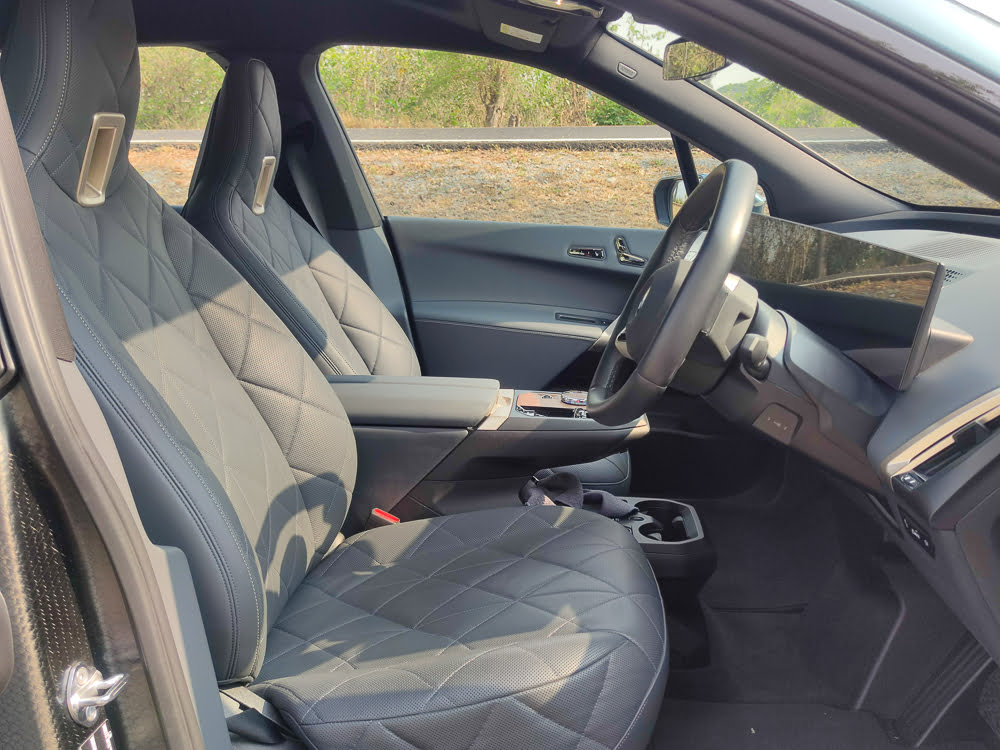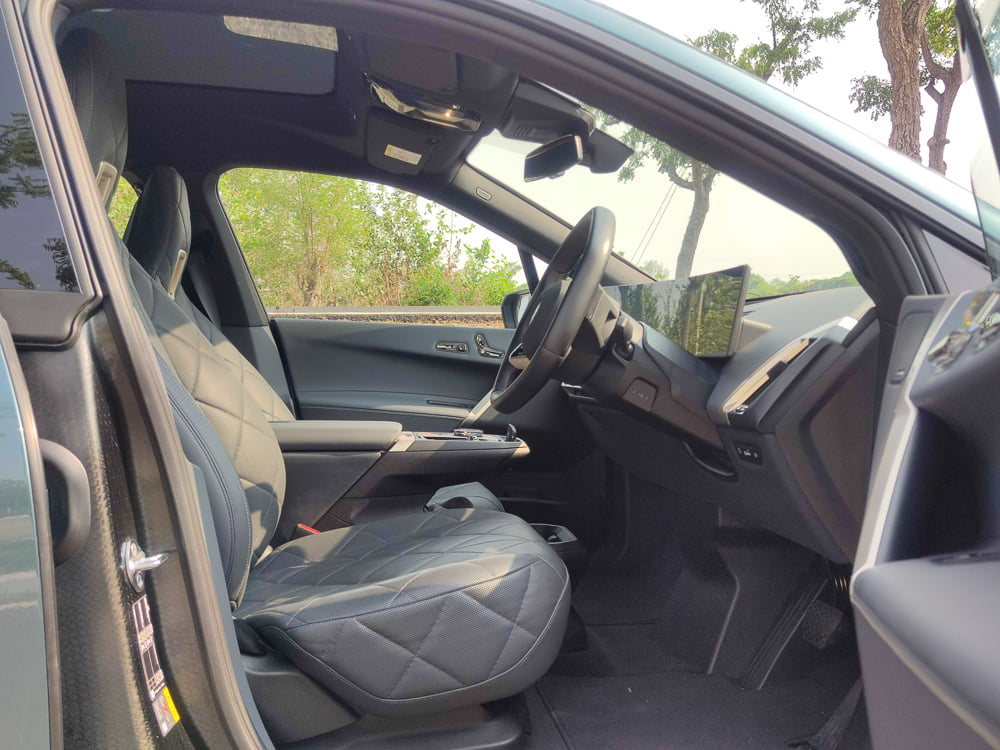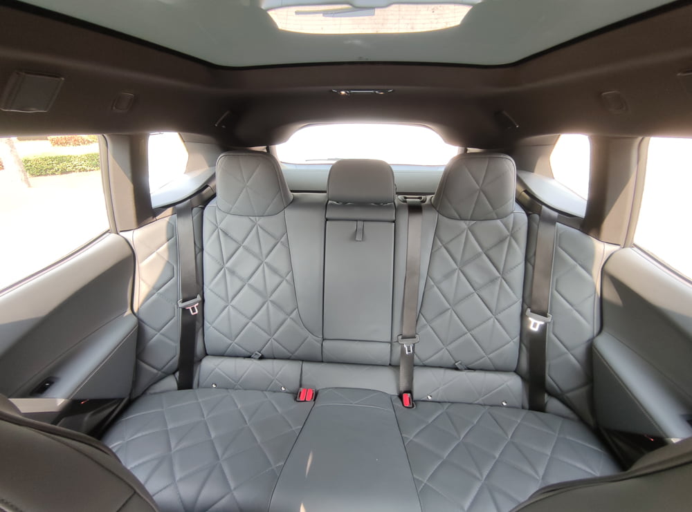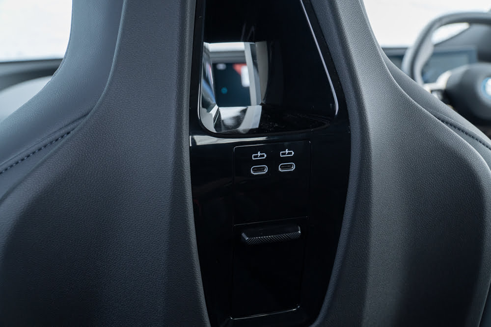 พื้นที่ด้านข้างใกล้ๆ ประตูมีปุ่มปรับพับไฟฟ้า และบริเวณเบาะนั่งฝั่งซ้ายและขวาจะบุหนังนิ่มเพื่อให้คนนั่งสามารถปรับเปลี่ยนท่านั่งเป็นพิงด้านข้างได้โดยไม่ชนกระจกหรือพื้นที่แข็งๆ แต่เสียดายที่ไม่มีม่านบังแดดตอนหลังมาให้ แต่บริเวณขอบประตูมีไฟ ambient light มาให้ซึ่งไฟตัวนี้ก็จะคอยเตือนสถานะประตูได้ด้วย และเบาะที่นั่งคู่หน้าบริเวณด้านหลังมี USB-C มาให้ 2 จุด ทำให้สะดวกกับคนนั่งหลังมากยิ่งขึ้น