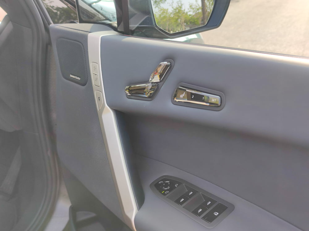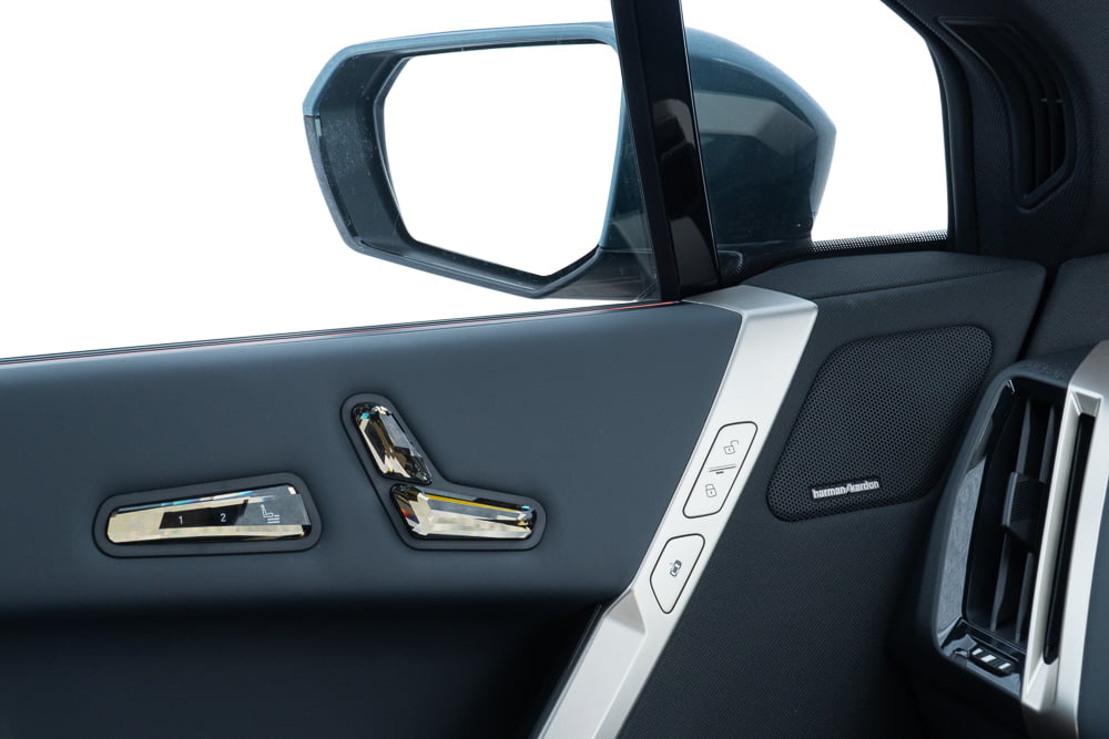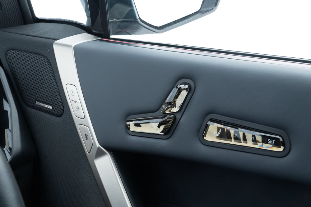 ประตูฝั่งคนขับไม่มีตัวง้างเปิดประตูเหมือนรุ่นอื่นแต่จะใช้ระบบไฟฟ้าที่เพียงสัมผัสประตูก็จะปลดล็อกให้อัตโนมัติ แต่ถ้าระบบไฟฟ้าไม่ทำงานก็จะมีตัวง้างเปิดอยู่บริเวณด้านล่าง เราจะสังเกตเห็นคริสตัลสวยๆ บริเวณประตู ซึ่งจะเป็นปุ่มปรับตำแหน่งไฟฟ้าที่เบาะผู้ขับขี่ด้านหน้า และผู้โดยสารด้านหน้า และยังมีตัวคริสตัลที่ใช้ปรับความจำตำแหน่งผู้ขับขี่ได้ 2 ท่าน มาพร้อมลำโพง harman kardon ที่เป็นลำโพงเซอร์ราวเต็มระบบ