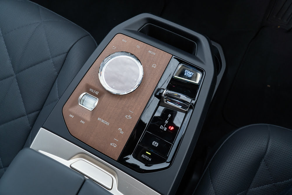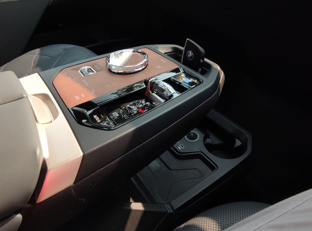 รถยนต์คันนี้ไม่มีเกียร์เพราะเป็นแบบไฟฟ้า แล้วมีการออกแบบมาเป็นแบบ Double layer ก็คือ 2 ชั้น ปุ่ม iDrive ต่างๆ ที่เป็นคริสตัลมีความเป็นมินิมอลมามีความหรูหรามามีการใช้วัสดุธรรมชาติซึ่งมาคู่กับเป็นแผงไม้เป็นแบบทัช มีไอคอนต่างๆ บอกการใช้งานง่าย เกียร์ไฟฟ้าใช้เลื่อนเอา
