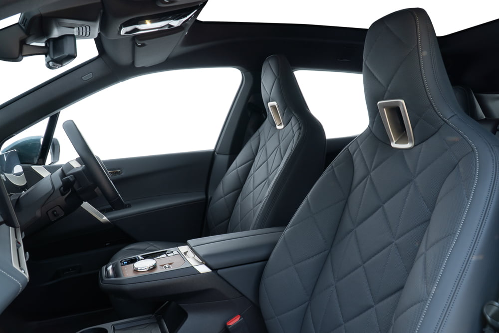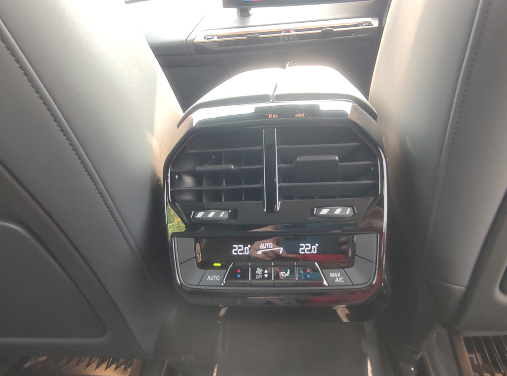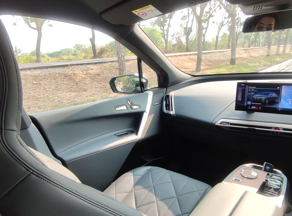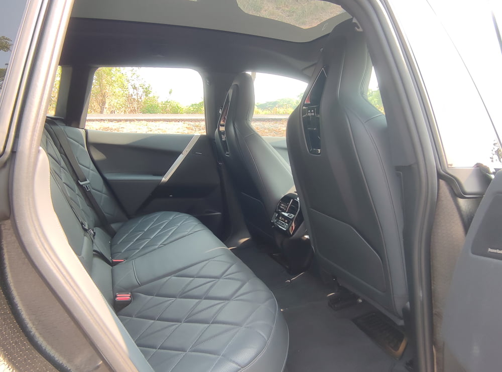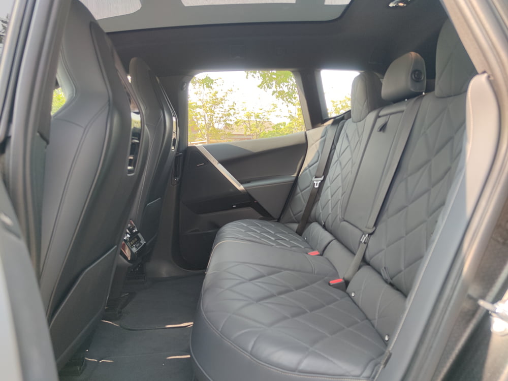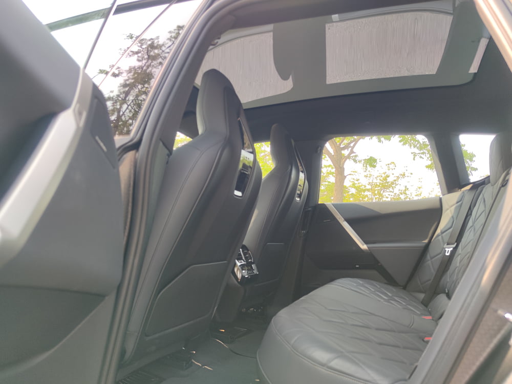 ใน iX คันนี้กว้างมากซึ่งปรับตำแหน่งตามที่เราขับเลย โดยเบาะคนขับเลื่อนมาข้างหลังเค่อนข้างที่จะเยอะพอสมควรแต่ว่า leg room ก็เหลือเยอะพอสมควรสามารถยืดขาได้สบายไม่ติดเข่า สำหรับ Head room สูงพอสมควรเลย ในการออกแบบเบาะนั่งตอนหลังใช้วัสดุหนังย้อมสีแบบธรรมชาติ สัมผัสค่อนข้างนิ่มพอสมควรแต่ว่าไม่ได้ยุบ เหมือนนั่งโซฟาหนังราคาแพงๆ ที่บ้าน พนักพิงหลังก็รับดีเพราะว่าช่วงก้นออกแบบเหมือนรถยุโรป อย่างเช่นซีรีส์ 5 หรือพวก X5 ต่างๆ ที่เคยรีวิวไว้ รองน่องได้ดีเลย นั่งไกลๆ สบายไม่เมื่อย