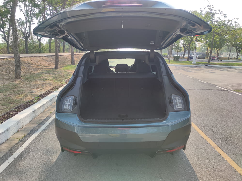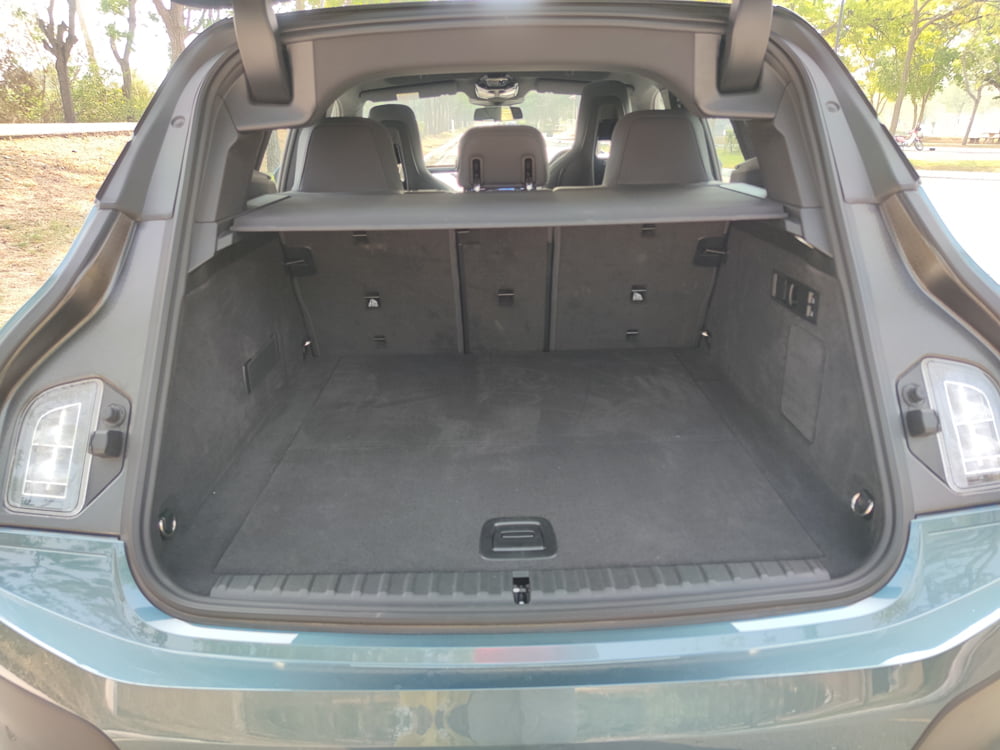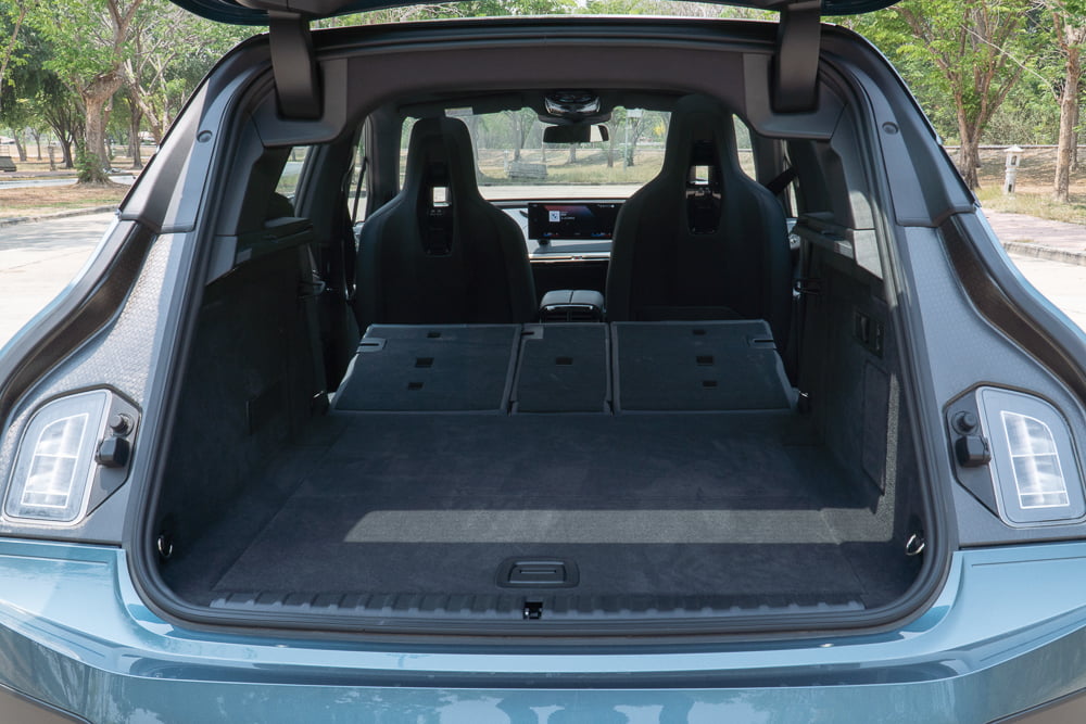 เรามาดูกันในส่วนของที่เก็บสัมภาระด้านท้ายกันบ้างซึ่งความจุสัมภาระตอนที่เราไม่ได้พับเบาะ 500 ลิตร โดยพื้นที่ด้านท้ายจะเรียบไปเลยไม่มีส่วนนูนโค้งขึ้นมาทำให้เมื่อวางของก็สะดวก และมีที่เก็บสัมภาระข้างใต้มาให้ซึ่งช่องใหญ่มาก มาพร้อมของแถม Emegency Charge ที่สำหรับเสียบไฟบ้านถ้าเรายังไม่มี Wall Box และมีสายชาร์จที่พ่วงกับ wall Box หรือว่าสถานีชาร์จมาให้ด้วยถ้าเกิดว่าหัวชาร์จไม่รองรับกับของเรา และยังไม่หมดเท่านั้นมีตาข่ายที่เอาไว้เกี่ยวคลุมสัมภาระไม่ให้เละเทะ ในส่วนของพื้นที่สัมภาระมีตะขอเกี่ยว Power Outlet 12V และปุ่มพับเบาะด้านซ้ายและขวาแบบ 60:40 ซึ่งเมื่อพับเบาะที่นั่งตอนกลางลง 1,750 ลิตร ซึ่งใหญ่พอสมควร