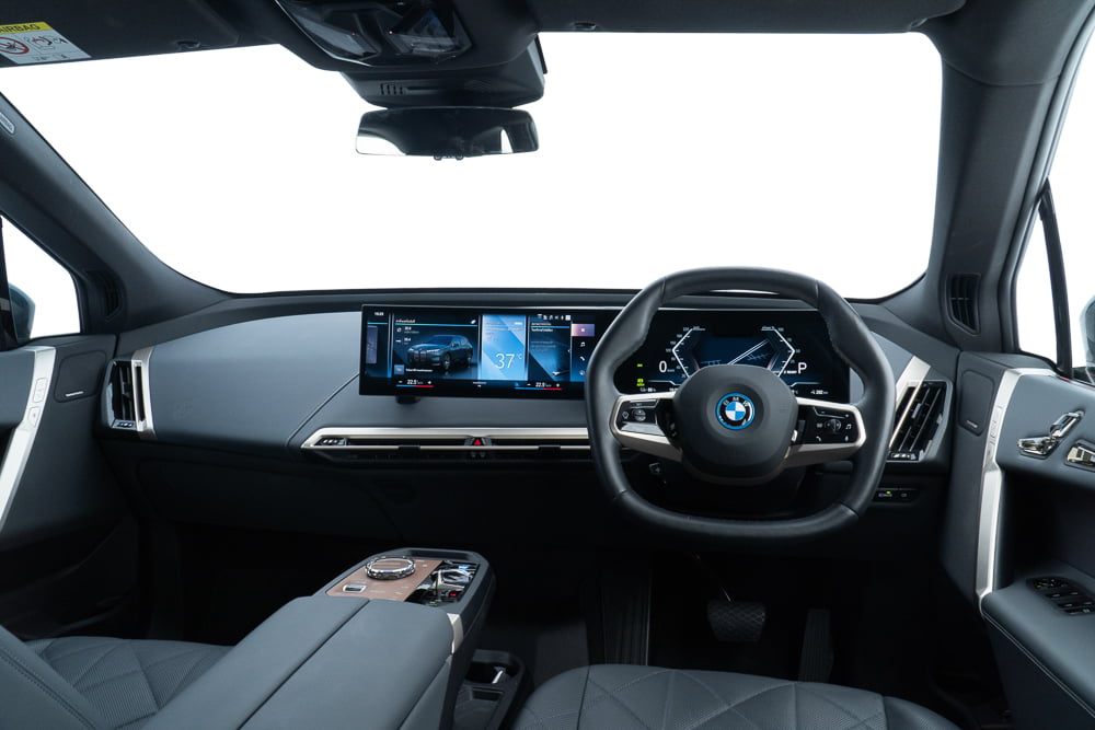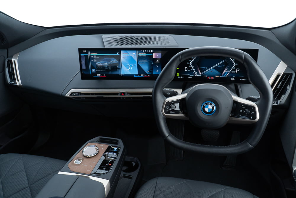 การออกแบบใน iX คันนี้เป็นการยก Living room มาไว้ในรถมีชั้นวางทีวี มีโโซฟาใหญ่ๆ มีพวกชั้นวางของต่างๆ แล้วก็ความโดดเด่นของเขาก็คือเรื่องของการใช้วัสดุที่ใช้จากการรีไซเคิล ซึ่งในรถเป็นการย้อมสีจากใบต้นมะกอกซึ่งทางยุโรปเนี่ยเขาก็กวาดทิ้งแต่ BMW ก็นำมาย้อมสีโทนก็จะออกเป็นแนวโทนดำด้าน แบบดำถ่าน มีขอบสลับ ลายเหมือนไทเทเนียมออกสีทองด้านเสริมความโดดเด่นหรูหราทันสมัยขึ้นมา ตัววัสดุของคอนโซลกลางเป็นหนังสังเคราะห์ที่เขาเรียกว่า sensatec มีความทนทานกับเรื่องของความร้อนการขีดข่วน หรือแดดต่างๆ ผ้าที่โอบอุ้มตัวเสา a แล้วก็ตัวผนังต่างๆ เป็นสีดำนะเป็นผ้าแบบ anthracite