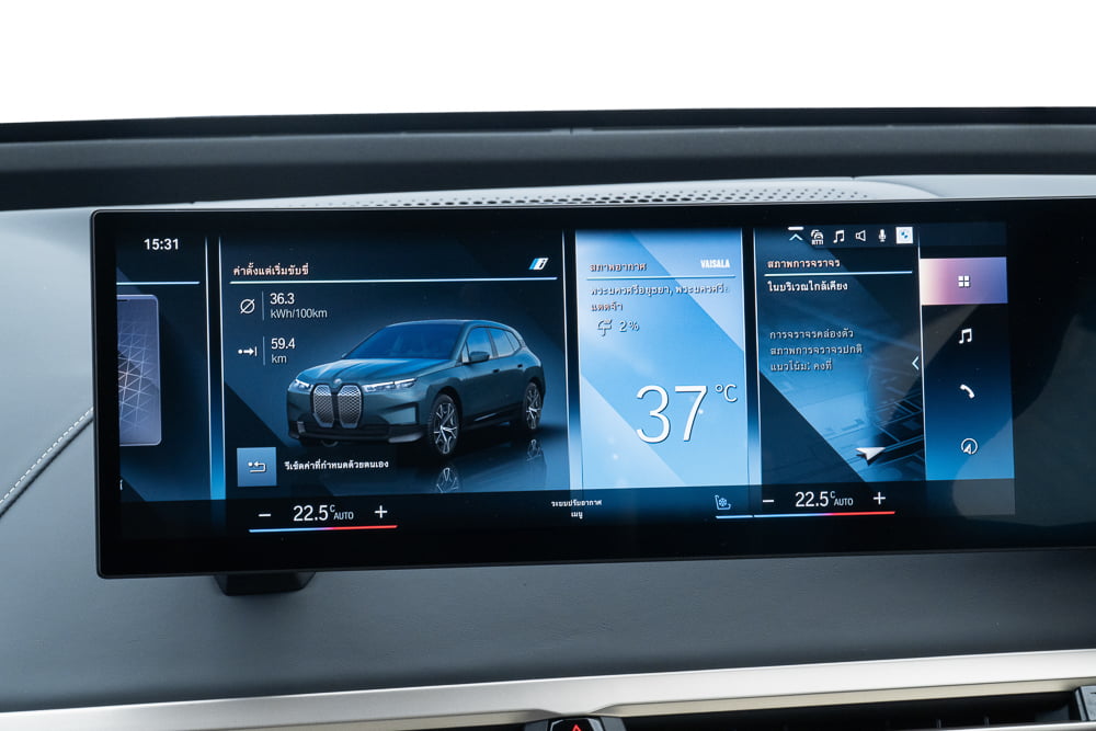 หน้าจอกลางสามารถที่จะบวกเพิ่ม Widget ก็คือเราใช้งานอะไรบ่อยแล้วก็บวกเพิ่ม เราก็สามารถที่จะเอามาโชว์ในหน้าจอนี้ได้ที่เราใช้งานบ่อยๆ อย่างเช่น ตั้งค่าเริ่มต้นการขับขี่หรือว่าตัวแสดงผลข้อมูลการขับขี่ของการใช้พลังงานต่างๆ มีการรวบรวมไว้ว่าเราตั้งค่าชาร์จตั้งแต่วันที่เท่าไหร่เริ่มขับขี่ตั้งแต่วันที่เท่าไหร่ หรือว่าเราจะรีเซ็ตเป็นค่าโรงงานหรือกำหนดค่าด้วยตัวเองก็ได้ มีภาพเป็นกราฟิกสวยดี การใช้งานในส่วนของหน้าจอกลาเลื่อนแล้วลื่นมือ เป็นระบบปฏิบัติการ 8 ใหม่ล่าสุด เรากลับมาที่หน้า Home มีสภาพอากาศ มีการบอกสภาพการจราจรหรือว่า Navigation ต่างๆ มี BMW ID เราสามารถที่จะจัดการผู้ขับขี่ได้โดย Add ID ของผู้ขับขี่แต่ละคนใส่เข้าไป อุปกรณ์เคลื่อนที่อื่นๆ เราสามารถที่จะแอดโทรศัพท์ไปได้และสามารถที่จะเชื่อมต่อกับระบบสมาร์ทโฟนได้ ไม่ว่าจะเป็น Apple Car Play หรือว่า Android Auto แบบไร้สายสามารถซิงค์เข้าไปได้เลยสำหรับตัวหน้าจออินโฟเทนเม้นท์ ในส่วนของข้อมูลช่วยเหลือส่วนบุคคลเราสามารถที่จะสั่งการได้มีคู่มือแนะนำด้วยคือ BMW Assistance วิทยุสามารถตั้งสถานี ระบบ Navigation นำทางตัวนี้เป็นระบบนำทางที่เป็นตัวล่าสุดก็คือแบบเรียลไท สามารถที่จะเชื่อมต่อกับข้อมูลการขับขี่ได้อย่างเช่นเราอาจจะหาจุดหมายปลายทาง หรือว่าเราอาจจะหาสถานีชาร์จก็ได้บอกเลยว่าอีกกี่กิโลเมตร เมื่อเรากดไปมันก็จะตั้งค่าแล้วก็แสดงผลระยะทางแล้วระบบเนวิเกเตอร์ที่เราไม่ได้เชื่อมต่อกับสมาร์ทโฟนมันก็จะทำการ Connect กับตัวสมองกลหรือว่าตัวกล่อง ECU ระบบการทำงานของรถ เช่น การรีชาร์จ
