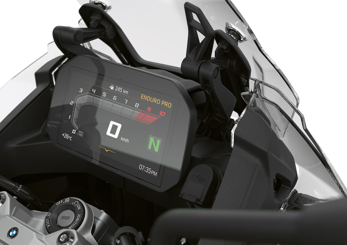 The new BMW F 850 GS and the BMW F 850 GS Adventure come with an upgraded suspension including an upside-down telescopic fork, cast aluminium dual swing arm, pre-load hydraulically adjustable spring and adjustable rebound damping to offer inimitable handling on off-road tracks. The standard ‘Rain’ and ‘Road’ riding modes allow riders to adeptly venture through all kinds of terrain. The model exudes a distinctive sense of adventure, with the addition of Pro riding modes – ‘Dynamic’, ‘Enduro’ and ‘Enduro Pro’. The Dynamic ESA offers Electronic Suspension Adjustment, with automatic load levelling to enhance driving safety and give maximum performance. ABS Pro and DTC (Dynamic Traction Control) are equipped for even more braking and accelerating safety. Modern touches seamlessly blended into the two models include innovations such as Keyless Ride and electronic cruise control, both of which are standard.