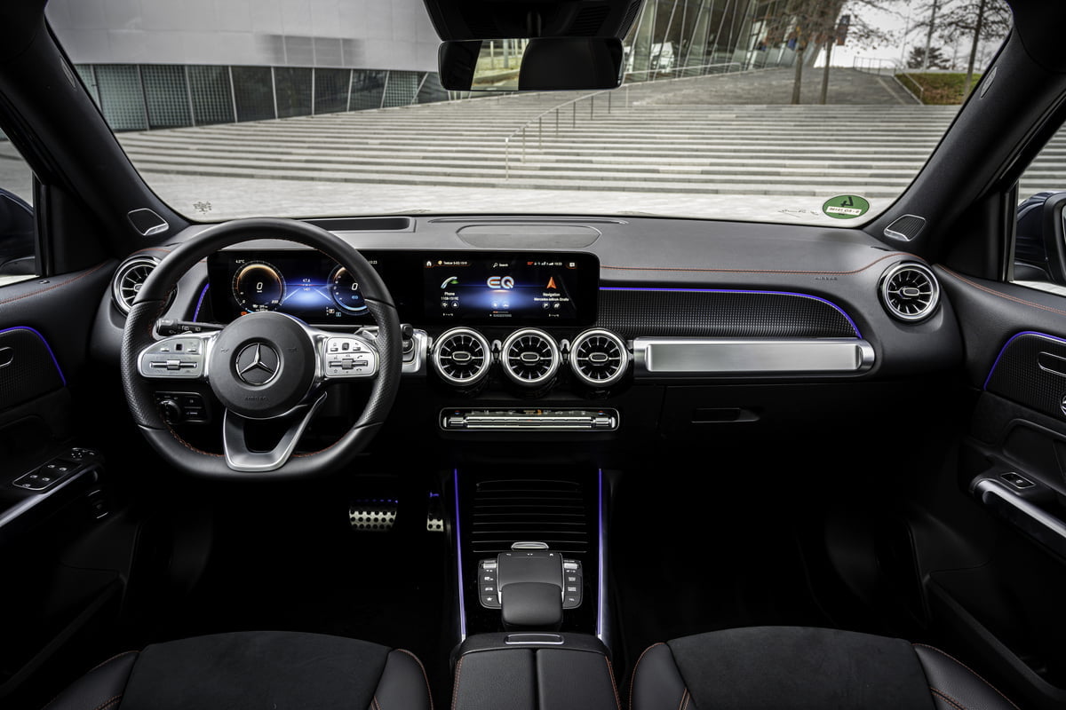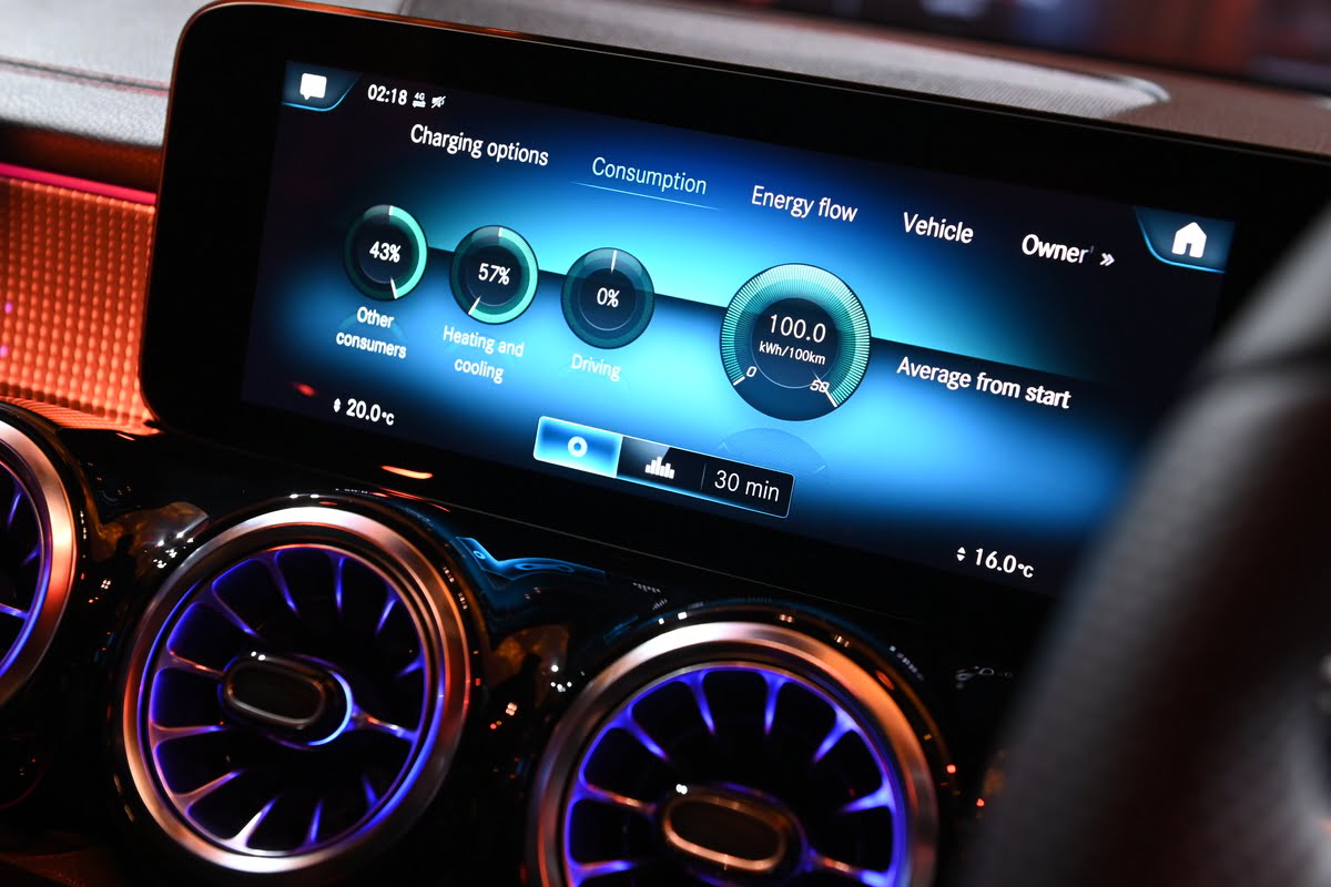 ในด้านของฟังก์ชั่นการใช้งานและความบันเทิง EQB มีระบบการแสดงผลและระบบควบคุมฟังก์ชั่นการใช้งานด้วยหน้าจอแสดงผลความละเอียดสูงแบบ All-digital instrument display ขนาด 10.25 นิ้ว และหน้าจอแสดงผลบริเวณคอนโซลกลางขนาด 10.25 นิ้ว โดยมีการติดตั้งระบบอินโฟเทนเมนต์ที่เป็นองค์ประกอบสำคัญของรถเมอร์เซเดส-เบนซ์ อย่างระบบ MBUX6 ที่สามารถควบคุมฟังก์ชั่นการทำงานภายในรถได้อย่างง่ายดาย