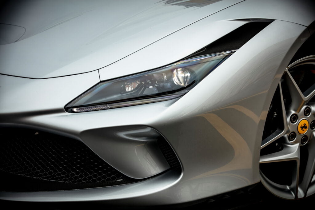 มุมมองด้านหน้าของ F8 Spider โดดเด่นด้วยช่องดักอากาศ S-Duct ห้อมล้อมด้วยส่วนหน้าที่ได้รับการออกแบบใหม่หมด เน้นย้ำให้เห็นถึงการปรับปรุงแอโรไดนามิกส์ครั้งใหญ่ ชุดไฟหน้า LED แนวนอนมีขนาดกะทัดรัดยิ่งขึ้น สปอยเลอร์ท้ายออกแบบใหม่ให้มีขนาดใหญ่ขึ้น โอบล้อมชุดไฟท้ายพรางตาให้รถดูมีจุดศูนย์ถ่วงต่ำลง และยังมีการนำชุดไฟท้ายคู่สุดคลาสสิกและหางหลังสีเดียวกับตัวรถกลับมาใช้อีกครั้ง