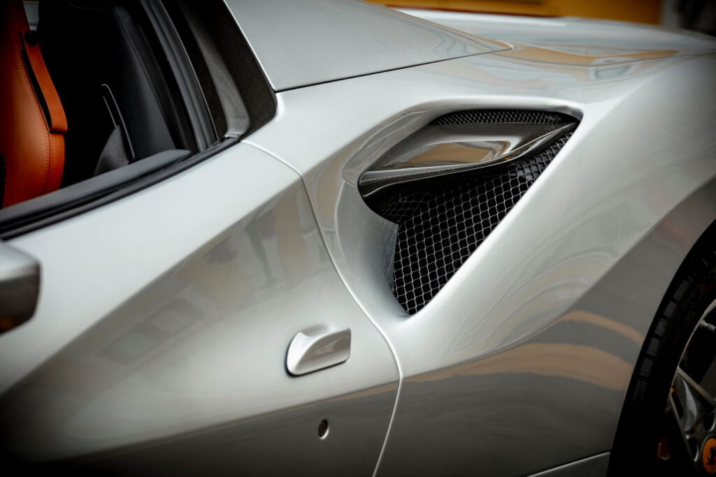 เพื่อให้บรรลุเป้าหมายในการเพิ่มพลังเข้าไปอีก 50 แรงม้า (เมื่อเทียบกับรุ่น 488 Spider) จึงมีการนำเอาระบบไอดีของ 488 Challenge มาใช้ ช่องดักอากาศเข้าเครื่องยนต์ของ F8 Spider ถูกย้ายจากด้านข้างของตัวรถ มาอยู่ที่ทั้งสองฝั่งของสปอยเลอร์ และต่อตรงไปยังท่อร่วมไอดี ช่วยลดการสูญเสียอากาศและให้การใหลเวียนที่ยอดเยี่ยมเข้าสู่เครื่องยนต์ ส่งให้สร้างแรงม้าได้มากขึ้นตามไปด้วย นอกจากนี้ แรงดันที่เกิดจากรูปทรงของสปอยเลอร์ท้ายรถยังเป็นส่วนช่วยเสริมให้การไหลของอากาศเข้าสู่เครื่องยนต์ดียิ่งขึ้นอีกด้วย