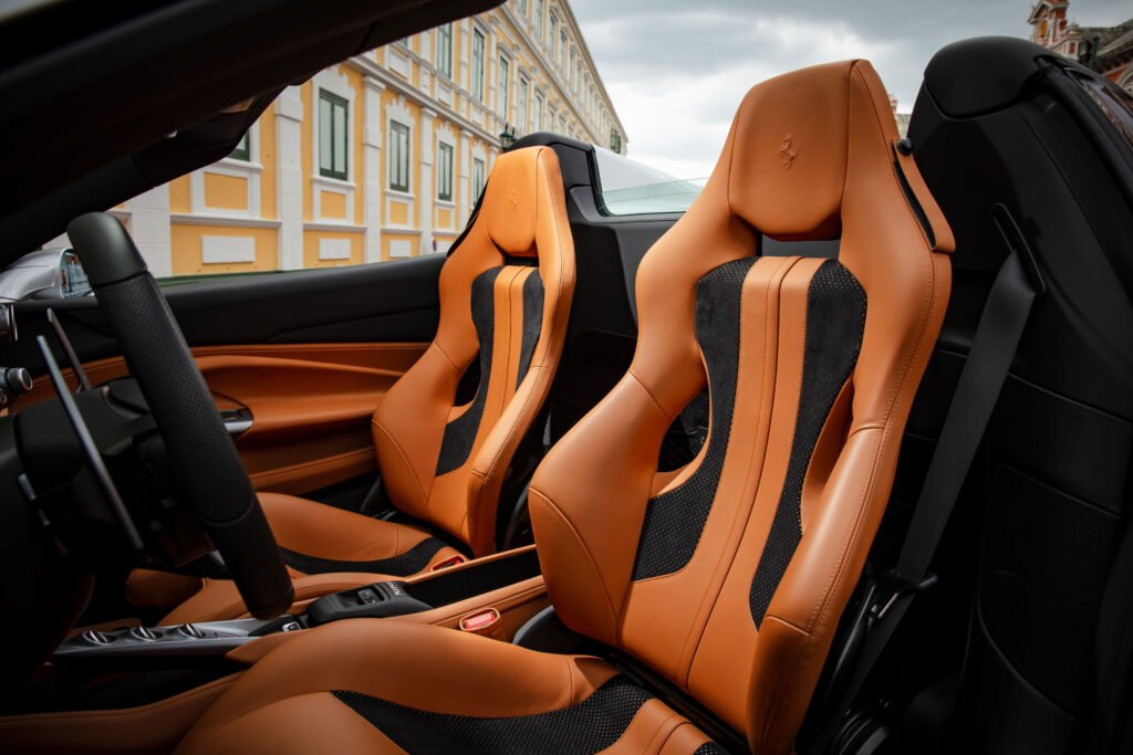 ห้องโดยสารของ F8 Spider ยังคงไว้ซึ่งความคลาสสิก และสไตล์ที่มุ่งเน้นไปยังผู้ขับเช่นเดียวกับที่ใช้ในรถแข่ง F1 ด้วยการติดตั้งสวิตช์ควบคุมทั้งหมดไว้บนพวงมาลัย ขณะที่เบาะนั่งแบบสปอร์ตก็ได้รับการออกแบบใหม่เช่นกัน