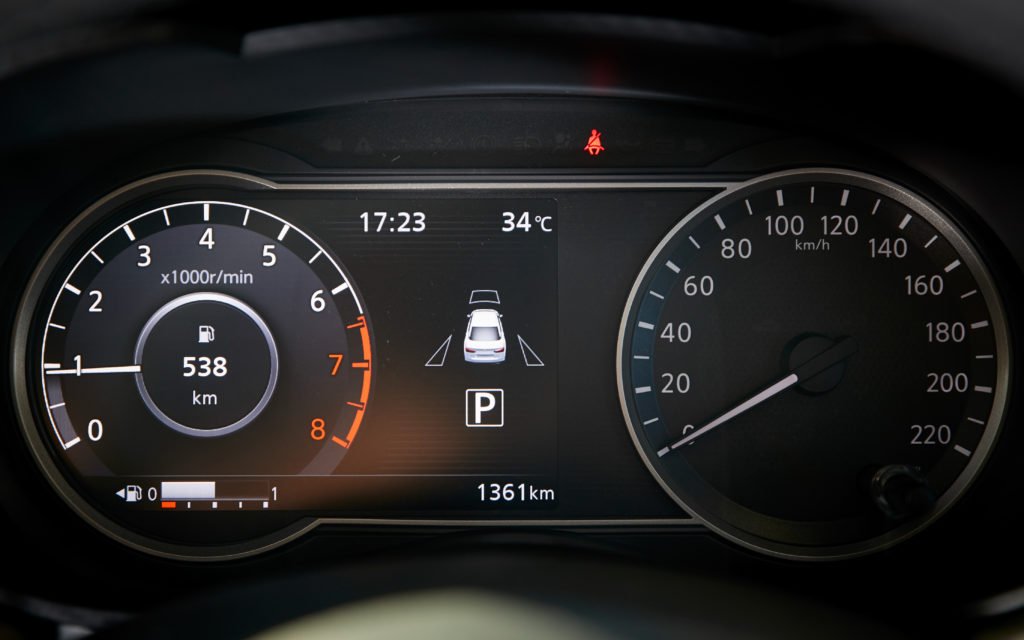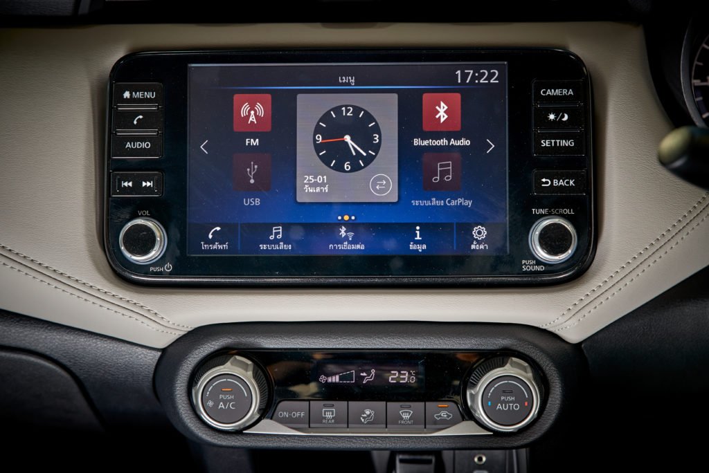 หน้าจอสัมผัสกลางแดชบอร์ดขนาด 8 นิ้ว ติดตั้งอยู่ในตำแหน่งที่ดี ดีไซน์ของมันดูสวยงามทันสมัย รองรับ Nissan Connect และระบบเชื่อมต่อสมาร์ทโฟน Apple CarPlay ฟังก์ชั่นใช้งานมาให้ตามาตรฐานอาทิ วิทยุ เครื่องเล่นเพลง นาฬิกา หน้าจอนี้แสดงผลได้คมชัด กราฟิกสวยงาม การตอบสนองรวดเร็วดี มีปุ้มวอลลุ่มแบบหมุนรวมถึงปุ่มทางลัดเข้าเมนูสำคัญซึ่งยังคงเป็นสิ่งจำเป็นในขณะขับรถ และยังแสดงภาพจากกล้องรอบทิศทางด้วย ระบบเสียงเป็นลำโพง 6 ตัวที่ให้คุณภาพเสียงในระดับมาตรฐานฟังสนุกทุกแนวเพลง
