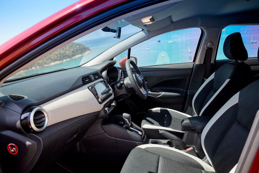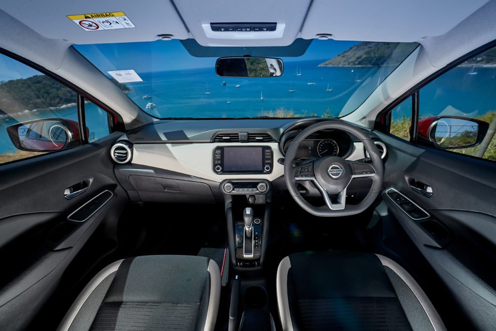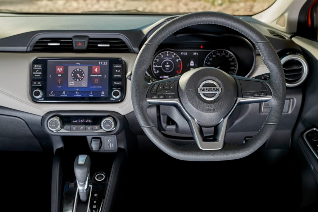 แดชบอร์ดของ Almera ใหม่ออกแบบได้ทันสมัยและดูสปอร์ตยิ่งขึ้น วัสดุส่วนใหญ่เป็นพลาสติกแข็ง จุดที่เราชอบคือพวงมาลัยทรงฐานตัด D-shape ที่ให้อารมณ์สปอร์ตได้เป็นอย่างดี มีปุ่มควบคุมเครื่องเสียงที่ก้านด้านซ้าย ชุดหน้าปัดเป็นแบบอนาล็อกผสมดิจิตอลที่อ่านค่าง่ายทั้งมาตรวัดความเร็วแบบเข็มและจอสี TFT ขนาด 7 นิ้ว ปุ่มควบคุมต่างๆ บนแดชบอร์ดอยู่ในตำแหน่งที่เข้าถึงได้ง่ายเกือบหมด