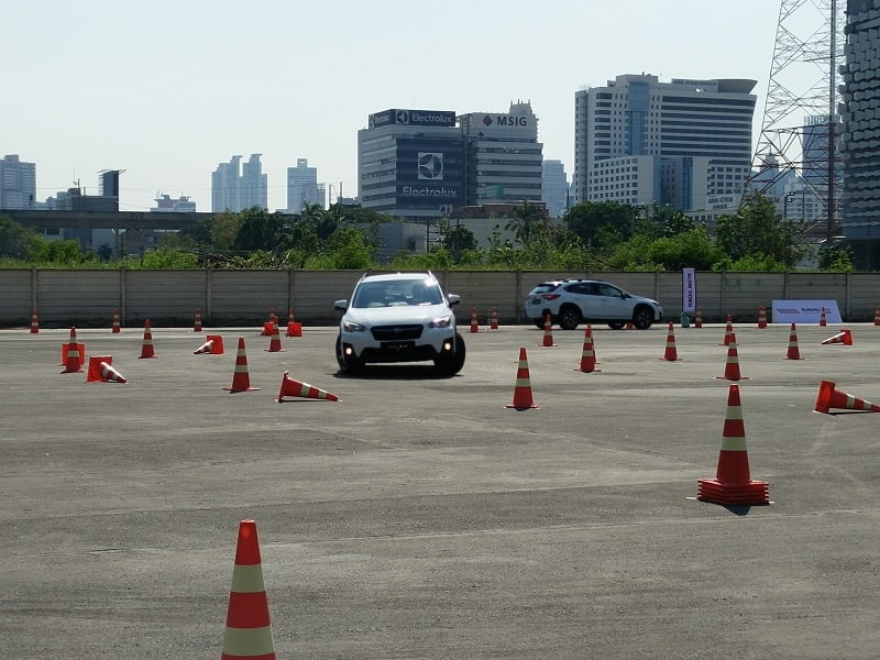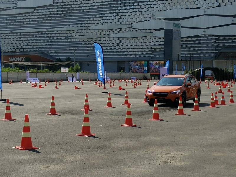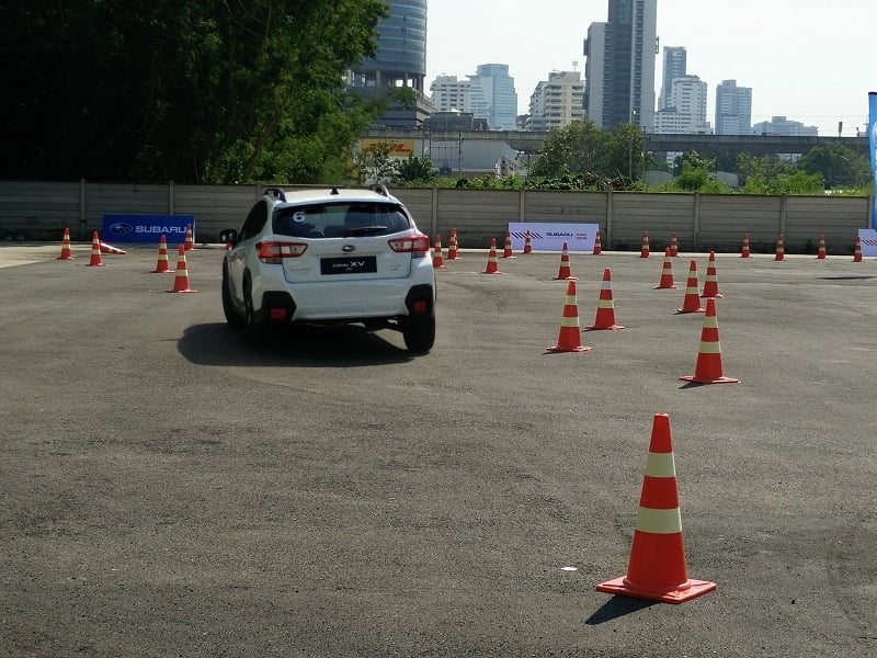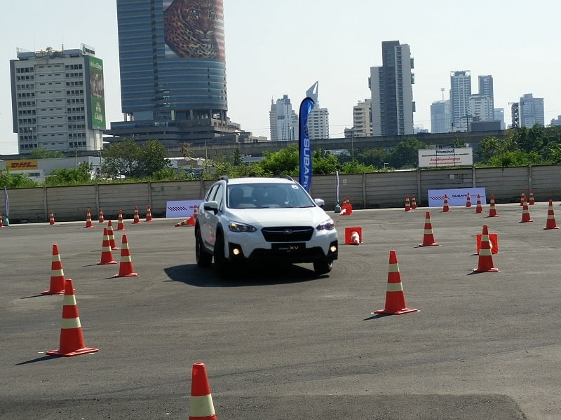 เราเริ่มต้นด้วยสถานีทดสอบสมรรถนะการควบคุมก่อนด้วย XV รุ่น 2.0i-P ก่อนจะขับมีการโชว์เรียกน้ำย่อยจากทีมงานเล็กน้อย เส้นทางมีทั้งซิกแซกซ้ายขวา โค้งตัว U และทางตรง มีการฉีดน้ำให้ถนนลื่นด้วย สัมผัสแรกเมื่อนั่งขับคือรถมีความสูงกำลังดี สูงกว่ารถเก๋งทั่วไปแต่ไม่เท่าเอสยูวีหรือกระบะยกสูง ทัศนะวิสัยรอบคันมองเห็นชัดเจน ปรับตำแหน่งเบาะนั่งได้ง่าย เมื่อปรับอะไรเสร็จสรรพก็ค่อยๆ ออกรถช้าๆ ในรอบแรกเป็นการขับเพื่อสำรวจเส้นทางก่อน ออกจากจุดสตาร์ทมาเจอโค้งขวา 90 องศา แล้วต่อด้วยโค้งซิกแซก จบที่โค้งขวา 90 องศาอีกหนึ่ง ฟีลลิ่งของการขับขี่ทั่วไปถือว่ายอดเยี่ยม ควบคุมง่าย อาการโยนแทบไม่มี
