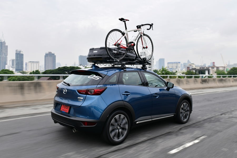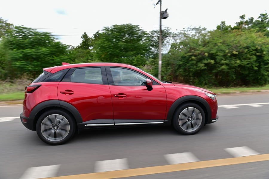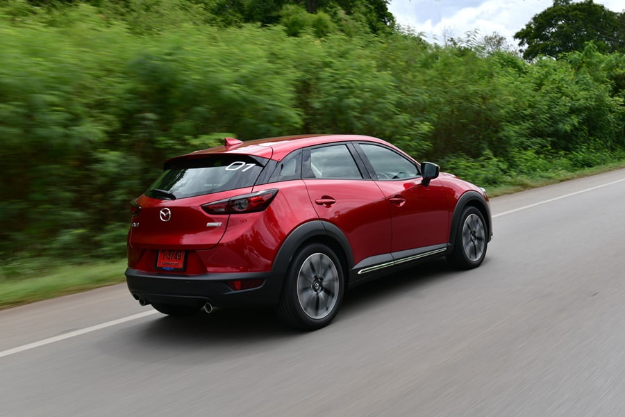 CX-3 ได้ติดตั้งระบบ G-Vectoring Control มาเป็นมาตรฐาน โดยระบบประมวลผลการบังคับพวงมาลัย ความเร็ว และน้ำหนักของรถ แล้วจะคอยควบคุมแรงบิดให้ถ่ายกำลังลงสู่ล้อแต่ละข้างอย่างเหมาะสม การขับขี่เข้าโค้งด้วยความเร็วสูงจึงเป็นไปอย่างมั่นคง รถเกาะโค้งดีมาก หนึบ อาการโยนมีเพียงเล็กน้อยเท่านั้น ผสานกับเทคโนโลยี SKYACTIV Chassis ที่เป็นการปรับเซ็ตช่วงล่างและระบบบังคับเลี้ยวให้มีอารมณ์แบบสปอร์ต จึงมอบความสนุกและความหนึบแน่นในการสาดโค้งได้เป็นอย่างดี เราพบว่ารถมีอาการโคลงตัวบ้างเล็กน้อยเมื่อเจอกับกับผิวถนนที่ไม่ค่อยเรียบสม่ำเสมอ