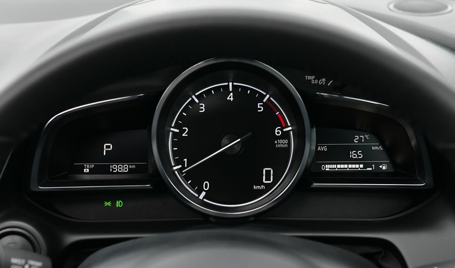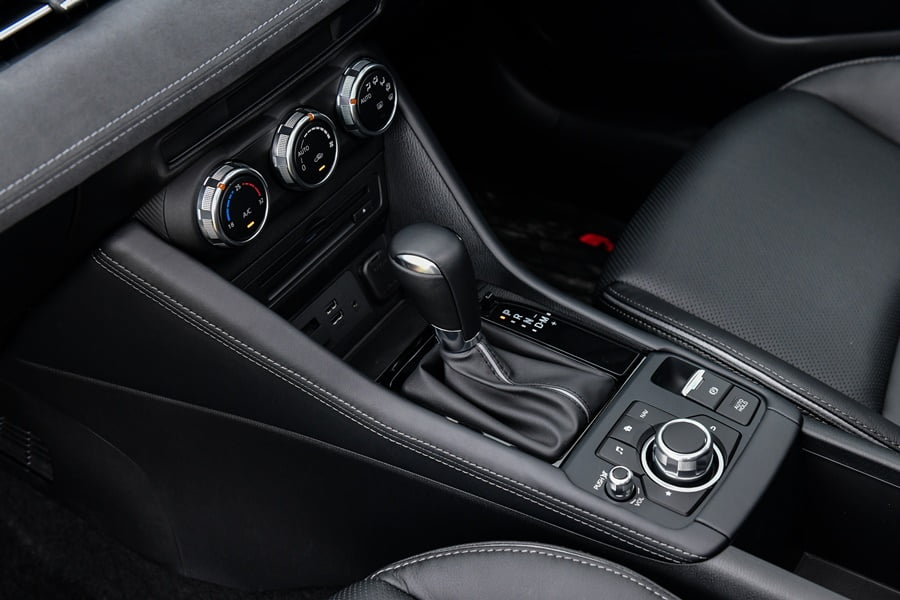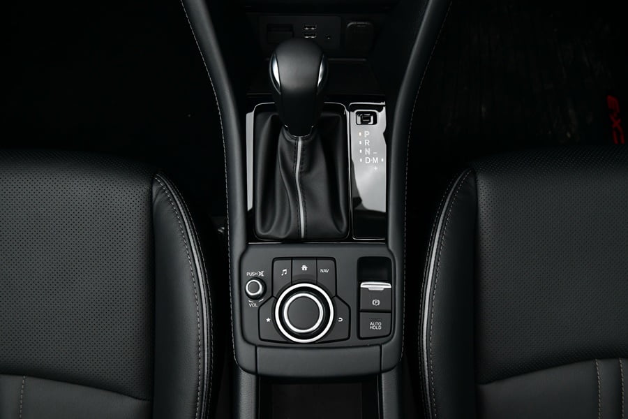 เกียร์อัตโนมัติ 6 สปีดของ CX-3 ตอบสนองได้รวดเร็วทันใจ เปลี่ยนเกียร์ขึ้นลงได้อย่างนุ่มนวลทุกจังหวะ มีโหมด M สำหรับควบคุมการเปลี่ยนเกียร์ด้วยตัวเอง จะเปลี่ยนที่คันเกียร์หรือตบแป้นแพดเดิลชิฟท์หลังพวงมาลัยก็ได้ การคิ๊กดาวน์เพียงแค่เพิ่มน้ำหนักเหยียบคันเร่งนิดเดียวรอบเครื่องก็จะดีดสูงขึ้นพร้อมตำแหน่งเกียร์จะลดต่ำลงเพื่อสร้างแรงดึงอย่างฉับพลัน ทั้งกระบวนการทำได้อย่างรวดเร็วไม่ต้องรอจังหวะให้น่าหงุดหงิด ทำให้การเร่งแซงเป็นไปอย่างนุ่มนวลและต่อเนื่อง