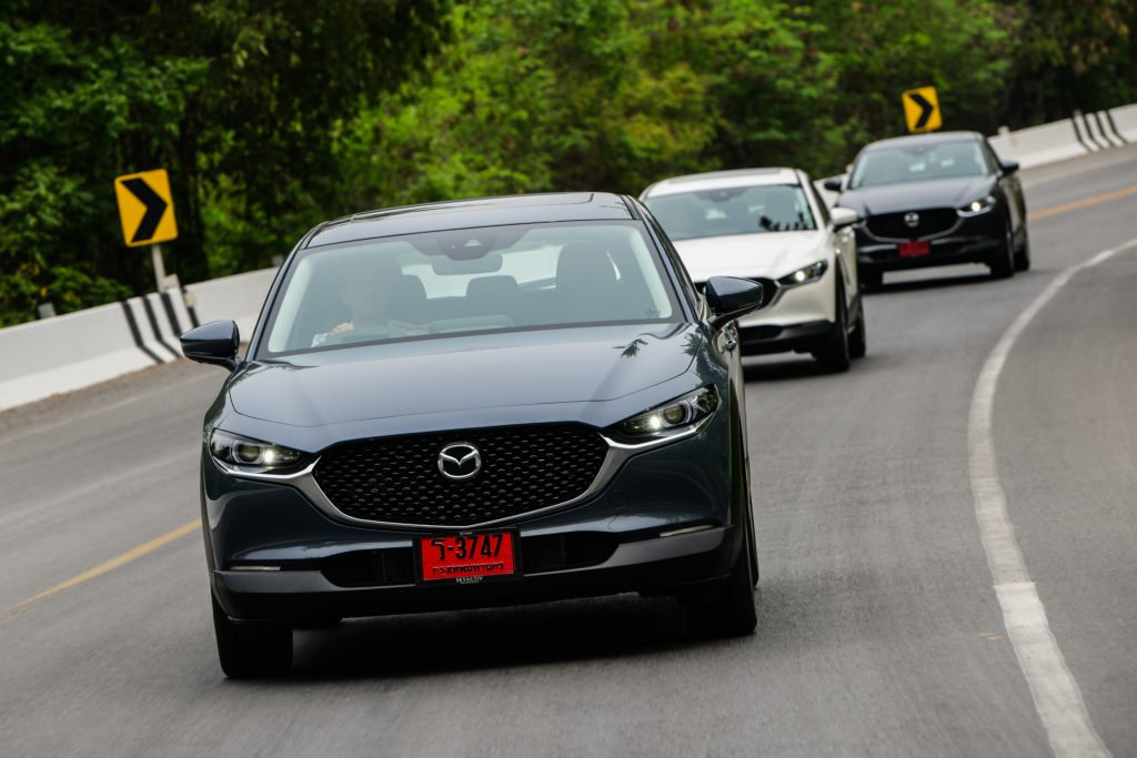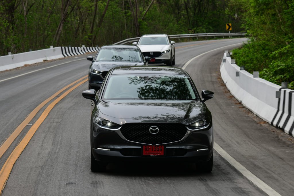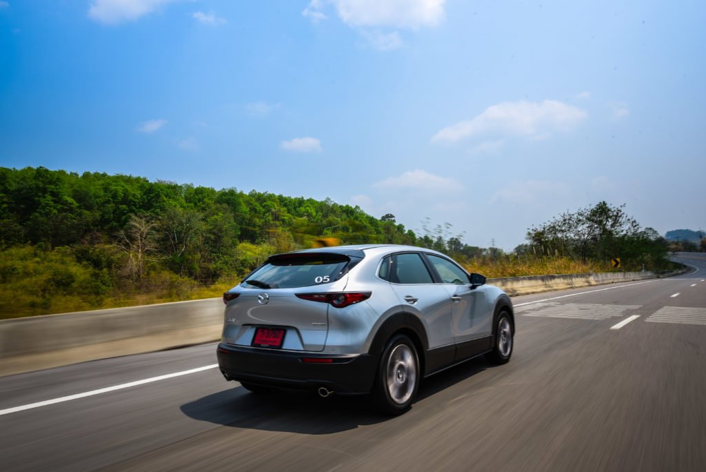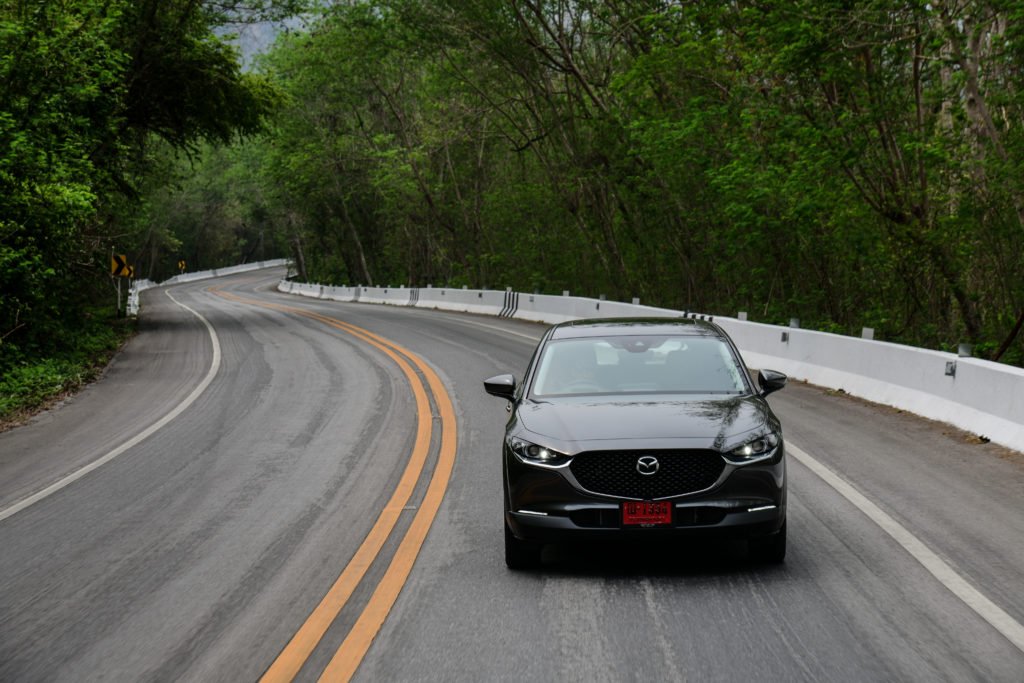 อีกสิ่งหนึ่งที่ช่วยให้เข้าโค้งได้อย่างสนุกและมั่นใจก็คือระบบ G-Vectoring Control PLUS ที่จะเพิ่มการเบรกหน้าซ้าย/ขวาเพื่อดึงหน้ารถให้เข้าทิศทางได้เร็วขึ้น โดยเฉพาะเส้นทางคนเคี้ยวบนเขาที่เจ้า CX-30 ไม่ทำให้รู้สึกมึนหัวเลย เข้าโค้งได้อย่างสนุก รถไม่โยกเยก พวงมาลัยคมและตอบสนองไว มั่นใจ ปลอดภัย ถ้าเทียบกับ Mazda 3 ที่มีความสูงน้อยกว่าแล้ว รายนั้นจะให้ความสนุกได้มากกว่า คมและกระชับกว่า แต่ถ้าเทียบตามมาตรฐานครอสโอเวอร์ยกสูงที่มีในตลาดตอนนี้แล้วล่ะก็ CX-30 อยู่ในลำดับต้นๆ ในแง่การควบคุมอย่างได้อย่างไม่ต้องสงสัย