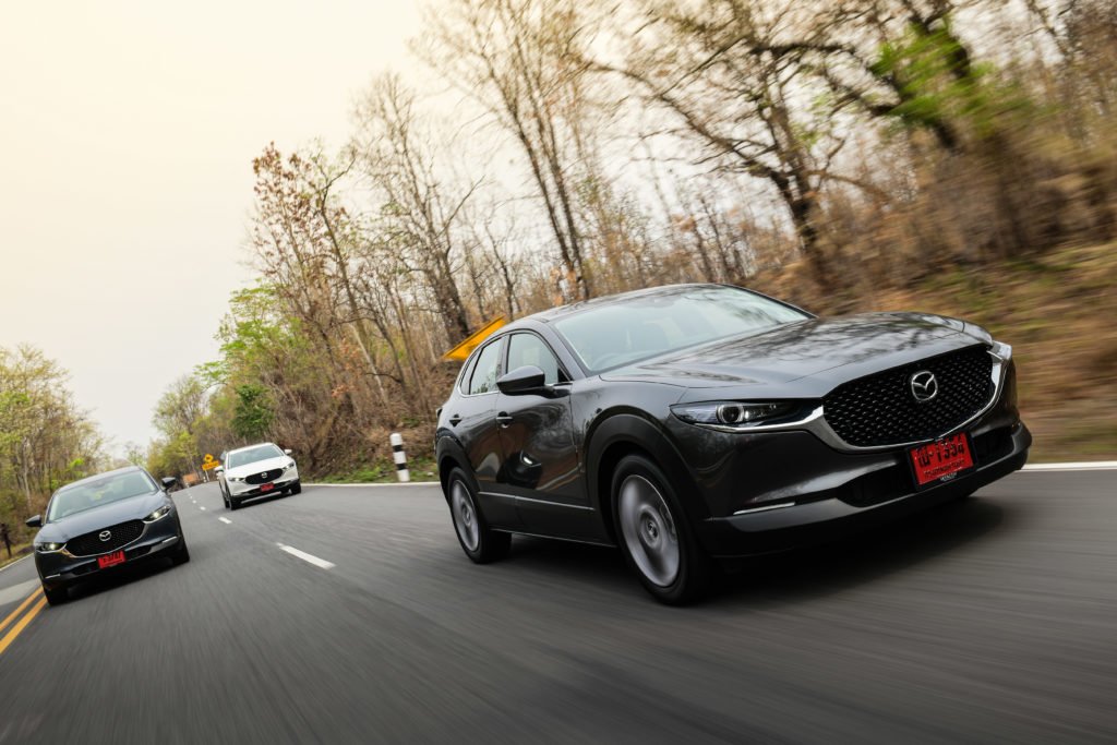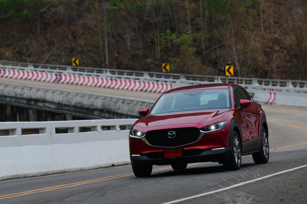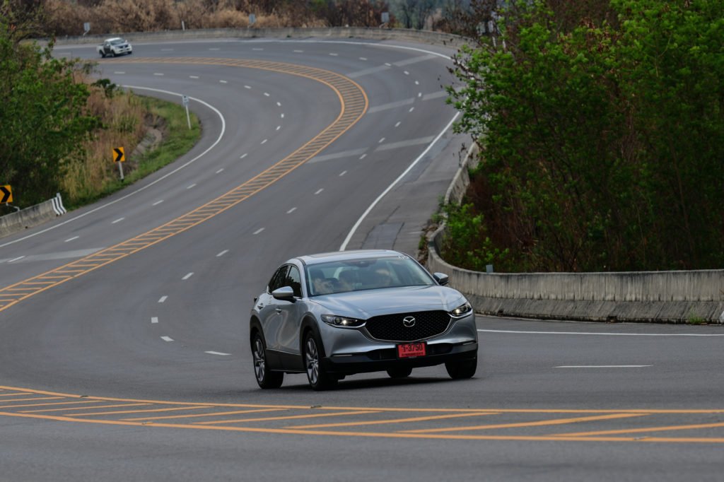 ช่วงล่างของ CX-30 คนละอารมณ์กับ Mazda 3 เห็นได้ชัดที่ความเร็วสูงบนทางตรงที่มันจะนุ่มกว่าแต่ยังหนึบแน่นและให้ความมั่นใจได้ไม่ต่างกัน รถวิ่งได้นิ่งสนิท ไม่โคลงไม่ส่าย จังหวะสาดโค้งด้วยความเร็วค่อนข้างเนียนมากๆ รถเกาะถนนดีมาก อาการโยนมีน้อย ตัวถังรักษาสมดุลและการทรงตัวในโค้งได้ดี