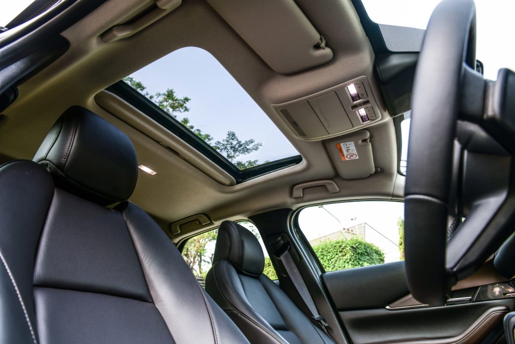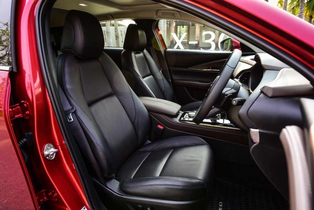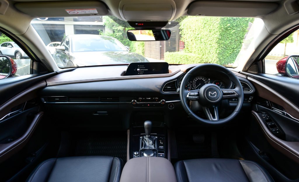 เราจำความรู้สึกขณะนั่งขับในรถ Mazda 3 ได้แม่น ทุกอย่างรอบตัวดูกระชับ ท่านั่งสปอร์ตต่ำติดพื้น พื้นที่ตอนหน้าไม่มีปัญหาแต่เบาะหลังแคบ พอมานั่งใน CX-30 ที่ยกเอารูปแบบดีไซน์ทุกอย่างของ Mazda 3 มาใช้ในขนาดห้องโดยสารที่ใหญ่ขึ้น มันรู้สึกได้เลยว่าสบายตัวขึ้น ทัศนวิสัยการมองรอบตัวรถดีขึ้นจากความสูงของเบาะนั่งที่มากขึ้น มุมมองด้านหน้ารถกว้างไกลขึ้น เสา A-pillar ไม่บดบังการมองตรงบริเวณมุมรถจนเกินไป อย่างไรก็ตามมุมมองผ่านไหล่ไปกระจกหลังยังแคบอยู่เหมือนเดิม