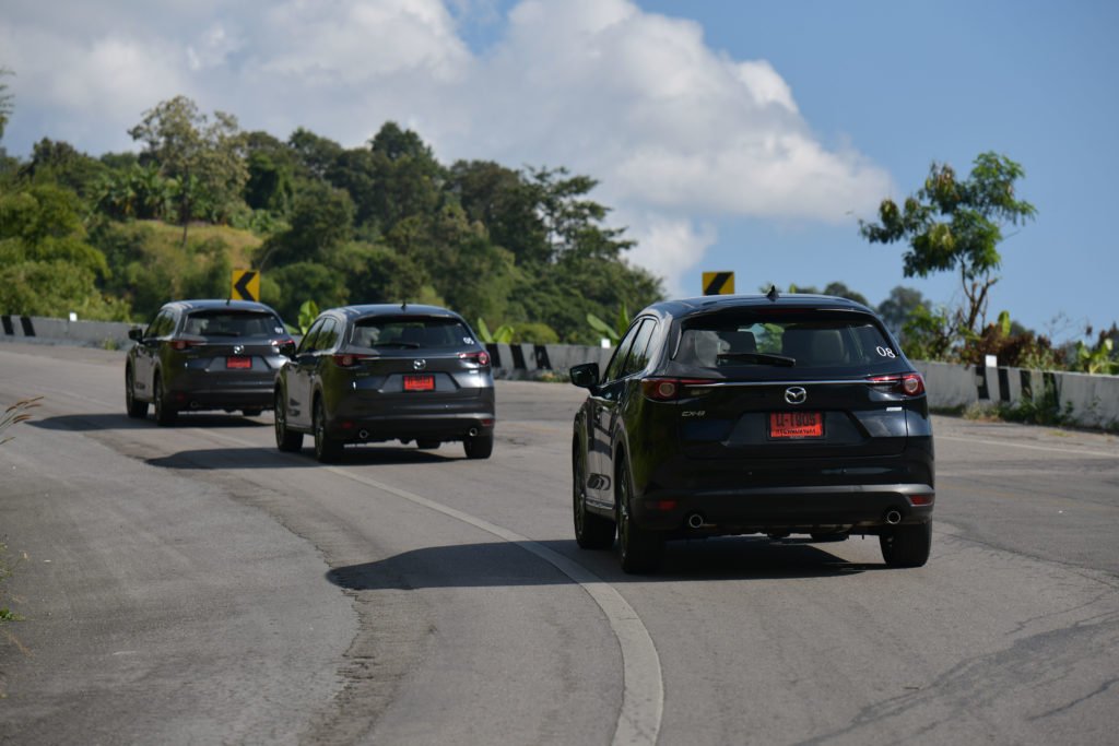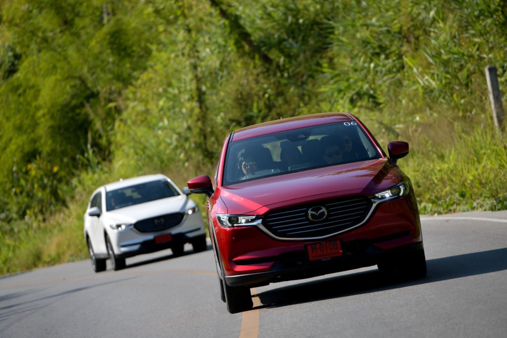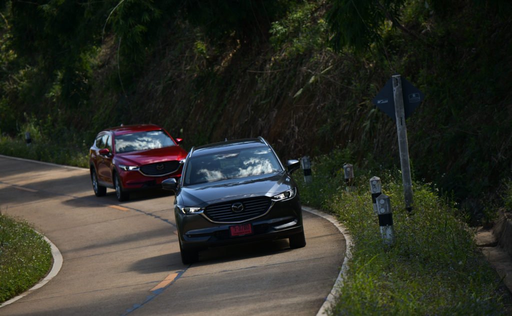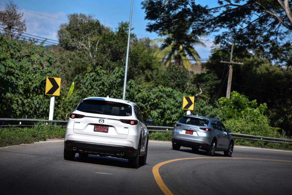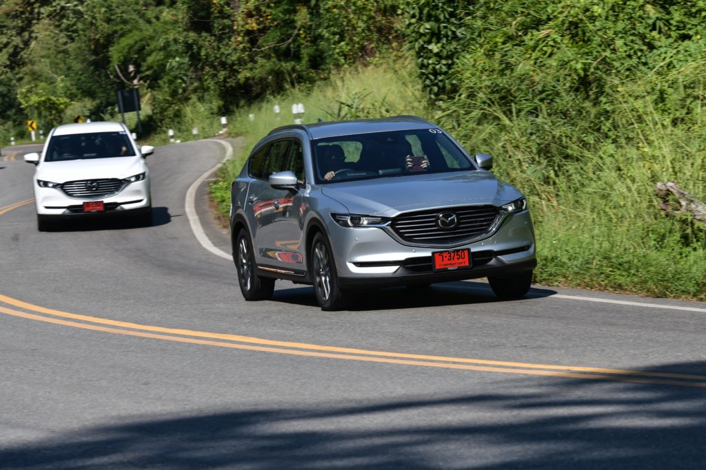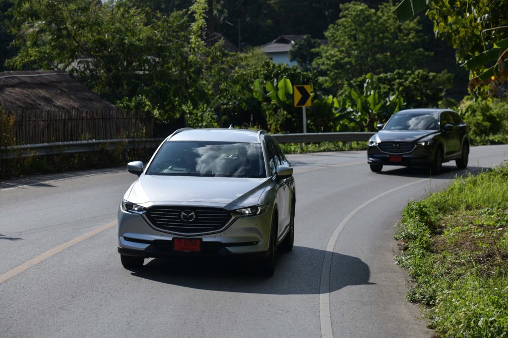 เราแอบเสียดายนิดนึงที่ CX-8 ยังไม่ได้รับการอัพเกรดเป็นระบบควบคุมสมรรถนะการขับขี่ G-Vectoring Control Plus แบบ Mazda3 ตัวล่าสุด อย่างไรก็ตาม เส้นทางทดสอบทริปก็ได้พิสูจน์ให้เห็นถึงเสถียรภาพการขับขี่ที่ยอดเยี่ยมของ CX-8 ปกติการเข้าโค้งของรถยกสูงจะเกิดแรงเหวี่ยงออกด้านนอกของโค้งมากกว่ารถเตี้ย แต่ CX-8 สามารถจัดการแรงที่ว่านี้ได้อย่างสมดุล ช่วยให้ตัวถังไม่โยนมากเมื่อเข้าโค้ง ซึ่งหน้าที่การจัดการความสมดุลของรถมาจากระบบ GVC ที่จะช่วยปรับแรงบิดให้เหมาะสมกับลักษณะของโค้งจากการคำนวณองศาการหมุนของพวงมาลัย พร้อมกับถ่ายน้ำหนักของรถให้อยู่ในภาวะสมดุลทั้งหน้าและหลัง ช่วยให้สามารถเข้าโค้งได้ง่ายขึ้น อาการหน้าดื้อและท้ายปัดจะน้อยลง สามารถขับผ่านโค้งได้อย่างสนุกสนานและมั่นใจโดยที่ผู้โดยสารไม่รู้สึกเมารถ