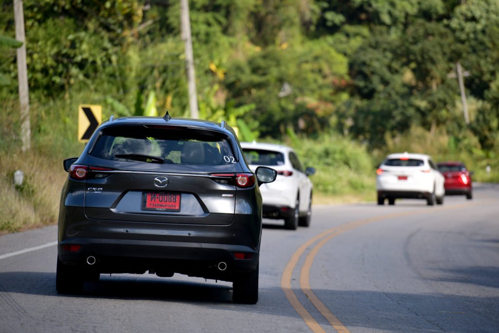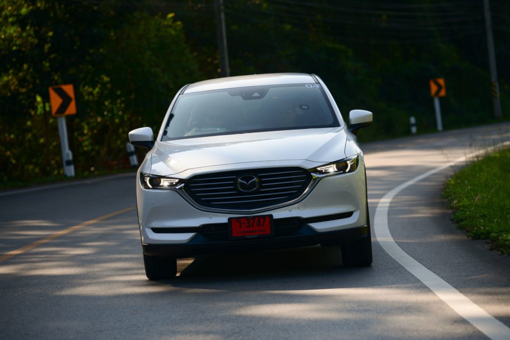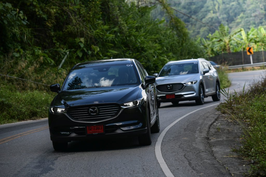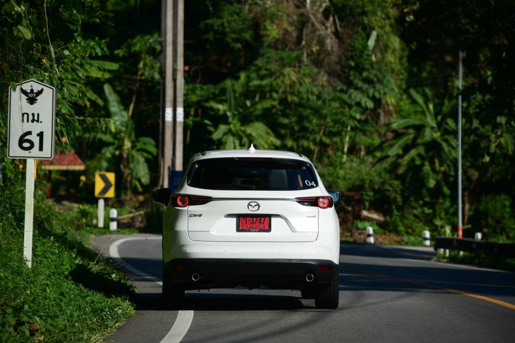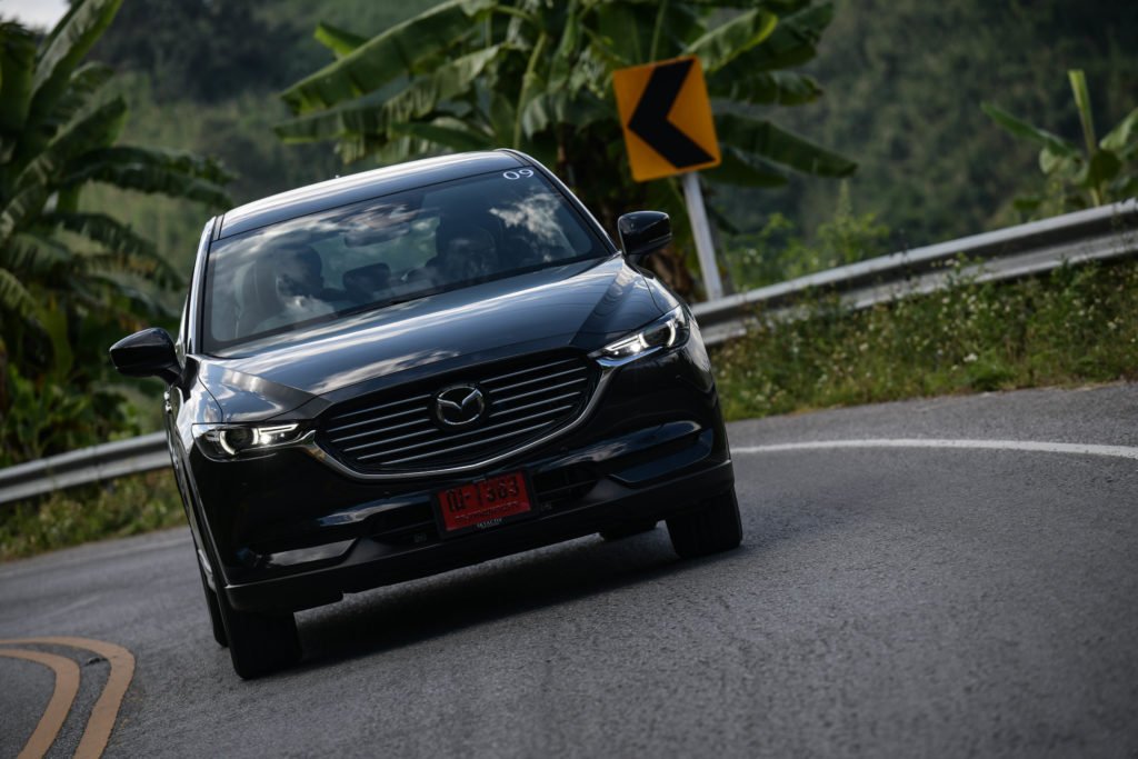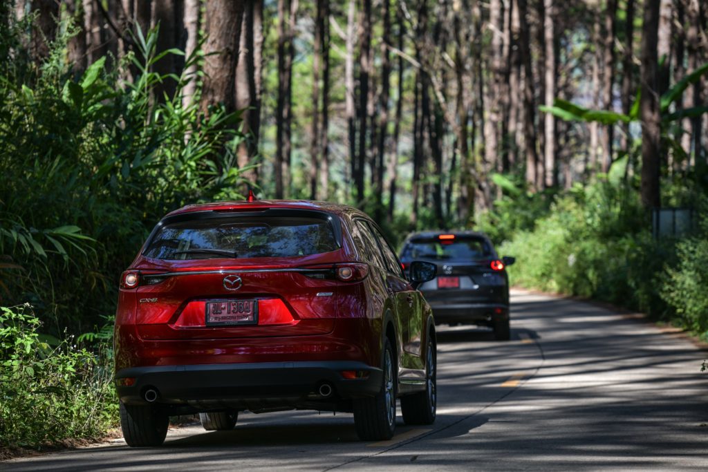 เราแอบเสียดายนิดนึงที่ CX-8 ยังไม่ได้รับการอัพเกรดเป็นระบบควบคุมสมรรถนะการขับขี่ G-Vectoring Control Plus แบบ Mazda3 ตัวล่าสุด อย่างไรก็ตาม เส้นทางทดสอบทริปก็ได้พิสูจน์ให้เห็นถึงเสถียรภาพการขับขี่ที่ยอดเยี่ยมของ CX-8 ปกติการเข้าโค้งของรถยกสูงจะเกิดแรงเหวี่ยงออกด้านนอกของโค้งมากกว่ารถเตี้ย แต่ CX-8 สามารถจัดการแรงที่ว่านี้ได้อย่างสมดุล ช่วยให้ตัวถังไม่โยนมากเมื่อเข้าโค้ง ซึ่งหน้าที่การจัดการความสมดุลของรถมาจากระบบ GVC ที่จะช่วยปรับแรงบิดให้เหมาะสมกับลักษณะของโค้งจากการคำนวณองศาการหมุนของพวงมาลัย พร้อมกับถ่ายน้ำหนักของรถให้อยู่ในภาวะสมดุลทั้งหน้าและหลัง ช่วยให้สามารถเข้าโค้งได้ง่ายขึ้น อาการหน้าดื้อและท้ายปัดจะน้อยลง สามารถขับผ่านโค้งได้อย่างสนุกสนานและมั่นใจโดยที่ผู้โดยสารไม่รู้สึกเมารถ