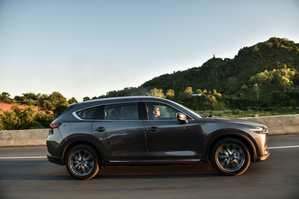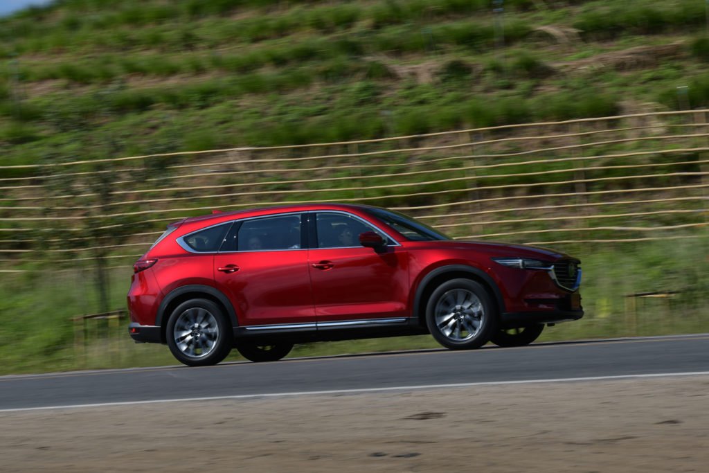 ข้อดีของ CX-8 คือมันเป็นเอสยูวีที่พัฒนาบนพื้นฐานของรถยนต์นั่ง ดังนั้นโครงสร้างตัวถังของมันจึงเป็นแบบโมโนค็อกต่างจากรถ PPV ที่เป็นตัวถังวางบนแชสซี ความแตกต่างนี้รับรู้ได้ทันทีจากฟิลลิ่งการขับขี่ที่ออกแนวแน่น หนึบ และนุ่มนวล ที่ความเร็วต่ำชุดกันสะเทือนของ CX-8 ดูดซับอุปสรรคบนพื้นถนนอย่างฝาท่อ หลุม บ่อ รอยปะ เส้นจราจรต่างๆ ได้ดีมาก สามารถขับรูดผ่านแบบนิ่มๆ โดยไม่สะเทือนมากนัก เสียงของช่วงล่างมีความแน่น จังหวะโดดคอสะพานก็ไม่มีอาการกระเด้งมากวนใจ
