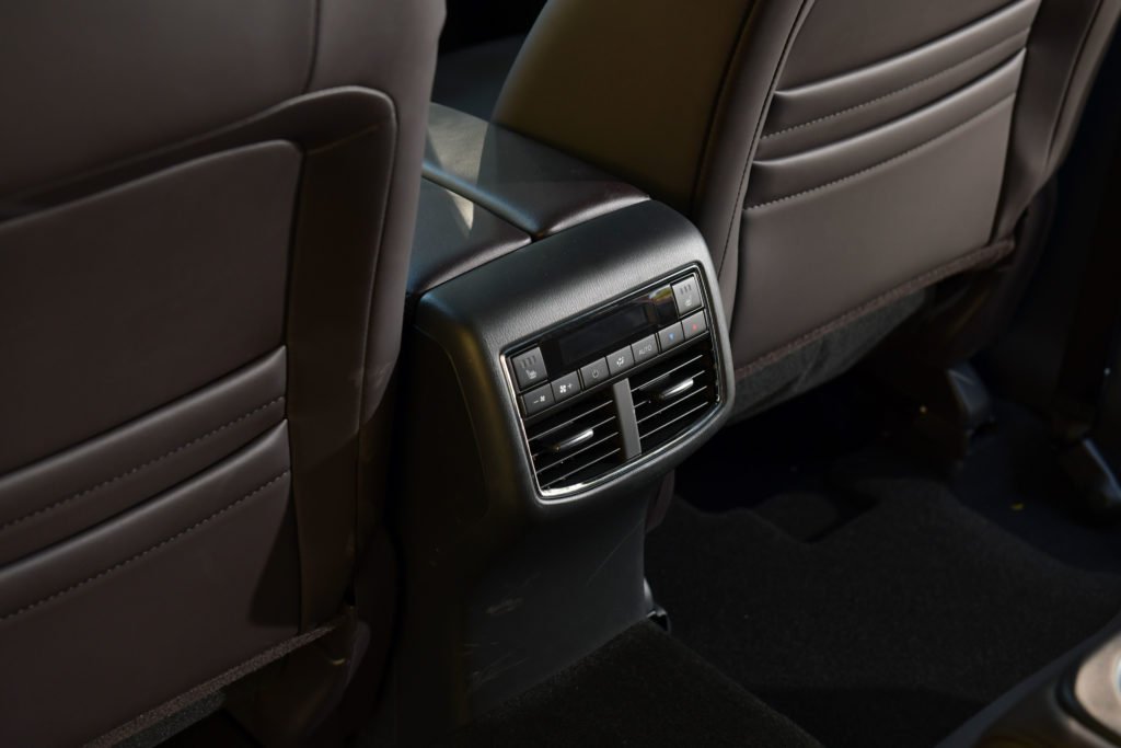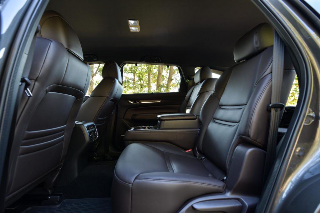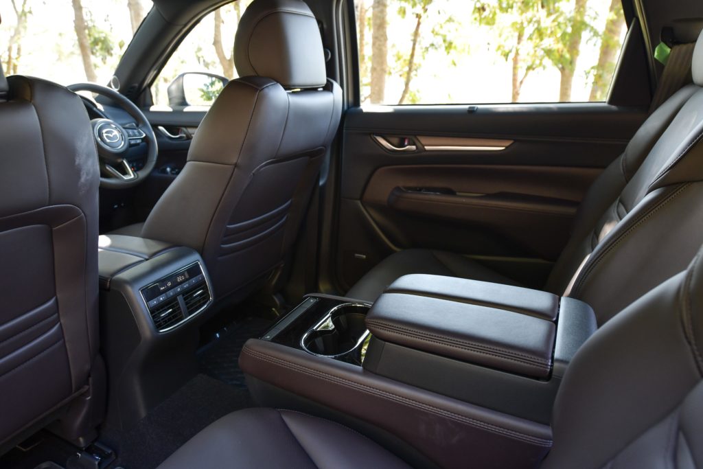 ประตูหลังเปิดได้กว้าง 80 องศา ช่วยให้เข้าออกสะดวกทั้งเด็กเล็กและผู้สูงอายุ พื้นที่เบาะแถวสองกว้างขวาง คนตัวสูง 180 ซม. ยังมีที่ว่างเหลือๆ เป็นเบาะแบบ Captain Seat แยก 2 ฝั่งซ้ายขวาชัดเจน มีคอนโซลกลางกั้น ตัวเบาะใหญ่ นุ่ม นั่งสบายที่สุดของรถมาสด้าเลยท่าน มีระบบอุ่นเบาะ ปรับเอนได้ 22 – 30 องศา ปรับเลื่อนหน้า-หลังได้ 120 มม. แต่เป็นระบบปรับมือทั้งหมด ตัวคอนโซลกลางเป็นที่วางแก้วและกล่องเก็บของ ภายในมีช่อง USB 2 ช่อง มีแอร์ตอนหลังที่สามารถปรับแรงลมและอุณหภูมิได้
