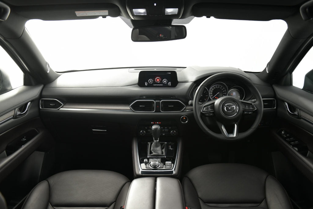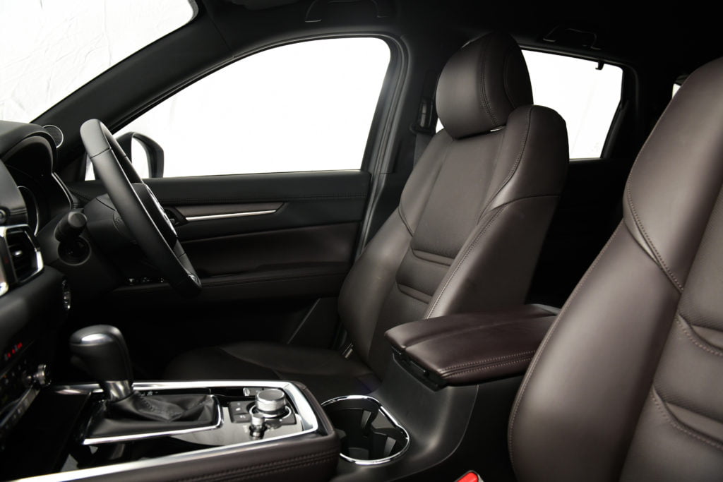 ความสบายต่อมาคือตำแหน่งนั่งขับที่สูงกว่ารถเก๋งแต่ไม่โย่งเท่ารถกระบะ เป็นตำแหน่งที่กำลังดี ทัศนวิสัยรอบคันของ CX-8 ก็ดีเช่นกัน มุมด้านหน้ากว้างไกล เสา A-pillar ไม่หนาจนเกินไป มุมมองผ่านไหล่ถ้าไม่มีคนนั่งเบาะแถวสามก็โล่งตาดี เบาะคนขับปรับไฟฟ้า 8 ทิศทาง มีตัวดันหลังมาช่วยเพิ่มความสบายเมื่อต้องนั่งขับนานๆ ตัวเบาะมีความนุ่ม โอบกระกับสรีระได้ดี พนักพิงใหญ่ หมอนรองศีรษะไม่ดันหัวจนเกินไป พวงมาลัยปรับได้ 4 ทิศทาง ขึ้น-ลง-เข้า-ออก โดยรวมแล้วนี่คือตำแหน่งนั่งขับที่ไม่ว่าจะเดินทางใกล้ไกลก็สบายเหมือนกัน
