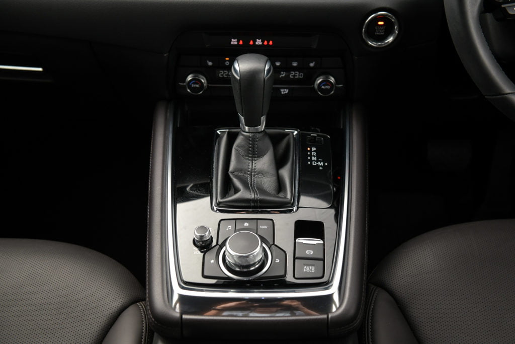 เกียร์อัตโนมัติ 6 สปีดของ CX-8 ปรับเซ็ตอัตราทดเน้นที่ความนุ่มนวล ช่วงเกียร์ต่ำอัตราทดจะชิดกันและจะค่อยไล่ระดับอัตราทดให้กว้างขึ้นเมื่ออยู่ในเกียร์สูง การตอบสนองเมื่อใช้เกียร์ M +/- ค่อนข้างไวดี แต่น่าเสียดายที่ไม่มีแป้นแพดเดิลชิฟท์หลังพวงมาลัยมาให้