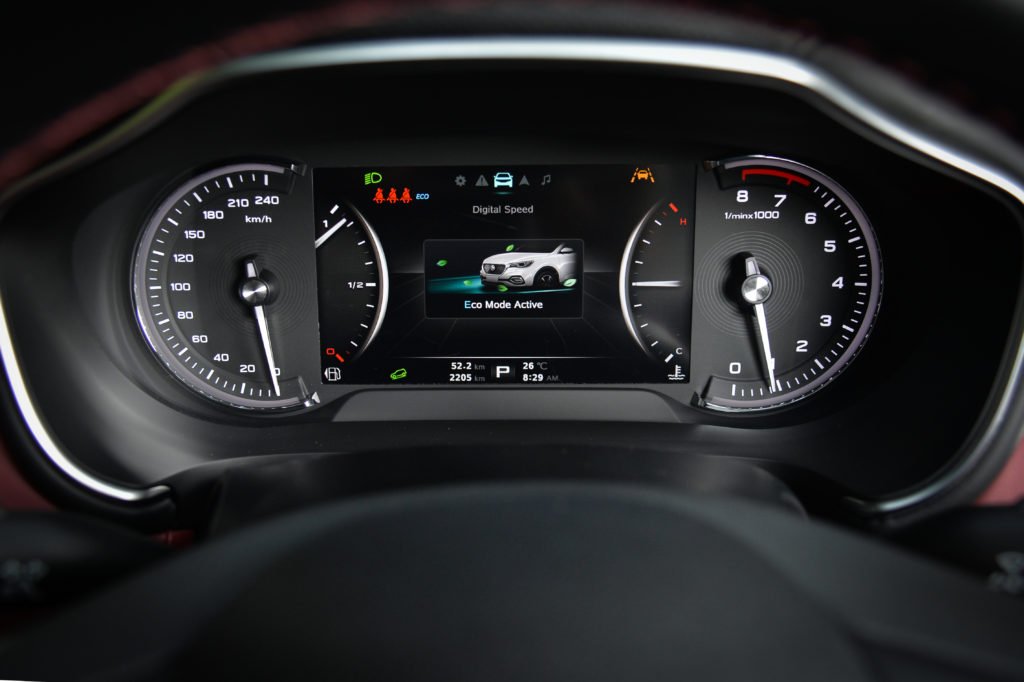 หน้าปัดของ MG HS เป็นแบบเข็มอนาล็อกบอกวัดรอบและวัดความเร็ว มีจอแสดงข้อมูลการขับขี่ MID แบบสี TFT ขนาด 7 นิ้วอยู่ตรงกลาง จอนี้บอกข้อมูลครบ กราฟิกสวย อ่านค่าง่าย หน้าจอสัมผัสกลางแดชบอร์ดขนาด 10 นิ้วติดตั้งอยู่ในระดับสายตา จอมีความคมชัด หน้าตาเมนูสวย อ่านค่าง่าย และยังลื่นไหลมาก ฟังก์ชั่นใช้งานมีมาให้แบบครบๆ และรองรับการเชื่อมต่อครบครัน จุดที่อยากชมคือระบบนำทางของ Tom Tom แสดงผลเป็นภาษาไทย ซึ่งการใช้งานทำได้ง่ายไม่แพ้การค้นหาผ่านสมาร์ทโฟน