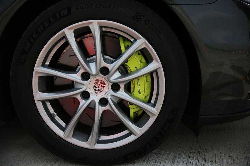 ระบบเบรกได้รับการอัพเกรดเพิ่มขนาดจานเบรกขึ้นเป็น 410 มิลลิเมตร (หน้า) และ 380 มิลลิเมตร (หลัง) จับคู่กับคาลิปเปอร์เบรกสีเขียวอมเหลืองที่โดดเด่นสุดๆ สามารถเพิ่มความมั่นใจด้วยออปชันระบบเบรกเซรามิก Porsche Ceramic Composite Brake (PCCB) ที่ได้รับการยอมรับจากสนามแข่งทั่วโลก